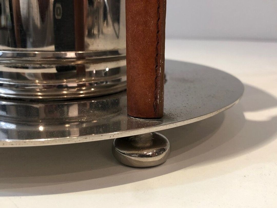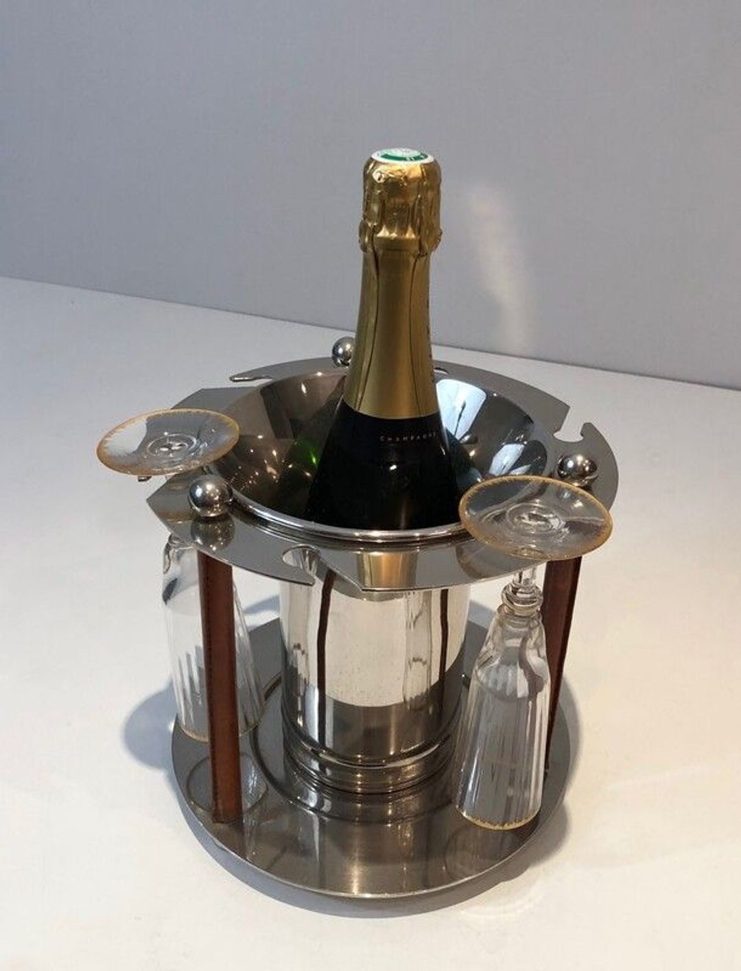 This remarkable piece combines in a single object the two essential elements of a Champagne service: an ice bucket for the bottle and an integrated stand for the flutes. The design is architectural and sophisticated. At the centre sits a cylindrical chrome-plated ice bucket polished to a high sheen, supported within a structure of four vertical uprights sheathed in brown leather — a material contrast that immediately recalls the great tradition of French luxury metalwork in which the warmth of leather offsets the cool brilliance of chrome, associated particularly with the ateliers of Jacques Adnet and his successors. A wide circular ring at the top, surmounted at four points by polished chrome ball finials, serves simultaneously as a structural crown and as a holder for champagne flutes, which rest in the recesses formed between the ring and the uprights. The whole assembly sits on a flat circular chrome base.
