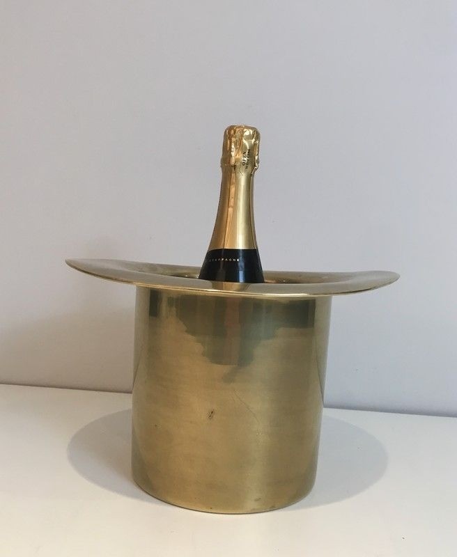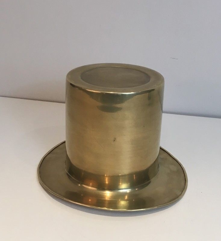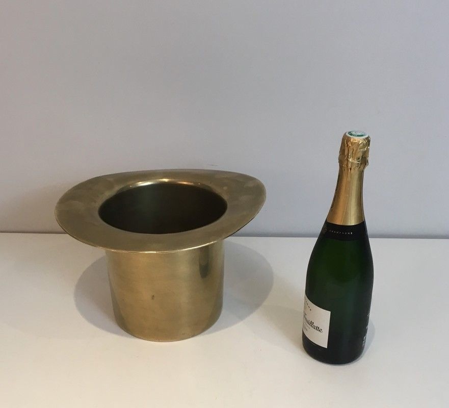 This highly original champagne bucket takes the form of a gentleman's top hat — chapeau haut de forme — rendered in polished brass with meticulous attention to detail: the cylindrical crown, the broad flat brim, and the characteristic silhouette of the Belle Époque dandy's essential accessory. The piece functions as a practical ice bucket for champagne or wine bottles, while serving simultaneously as a witty and spirited decorative object. The warm gleam of the brass and the precision of its craftsmanship elevate this fantaisie object far above the level of mere novelty.