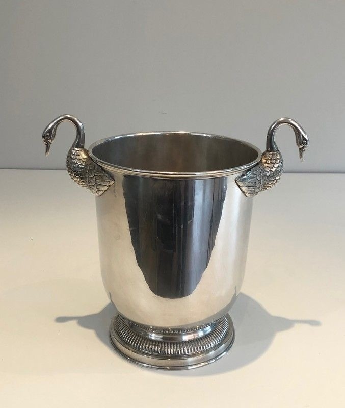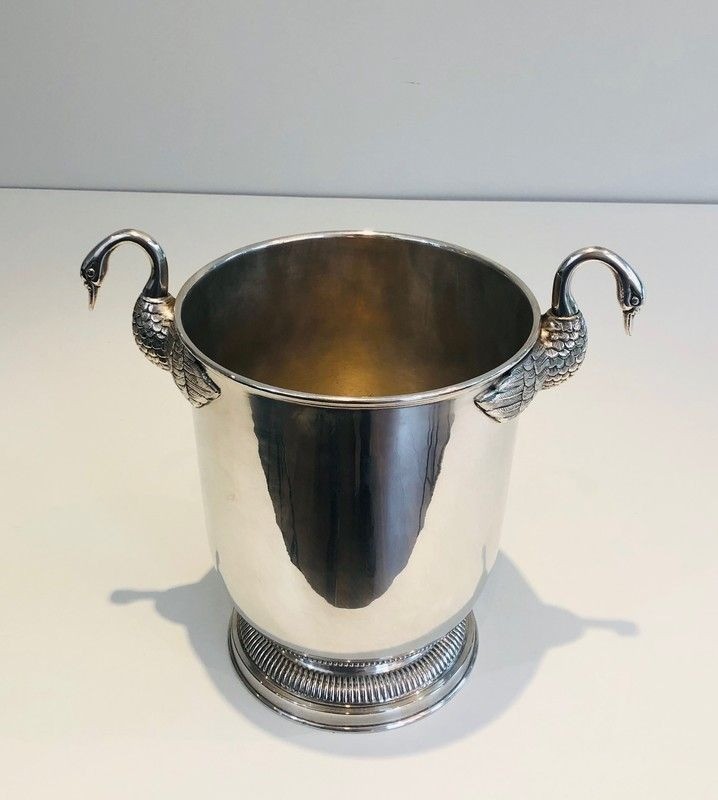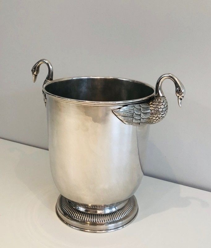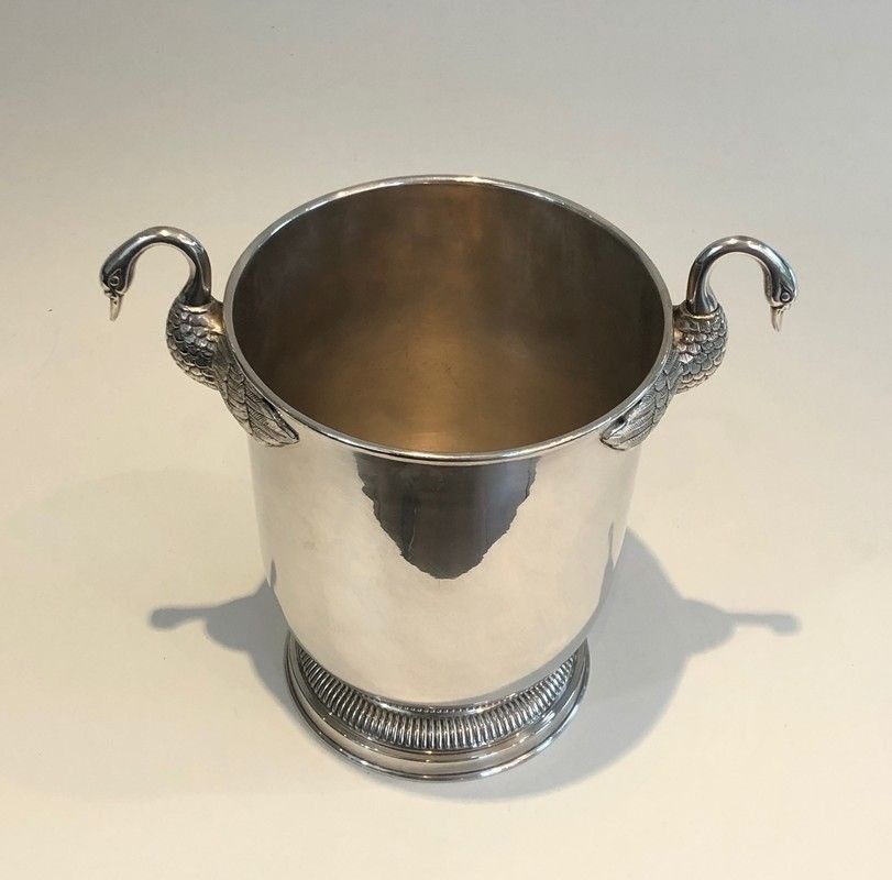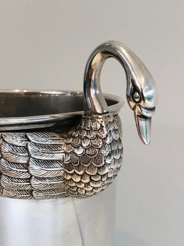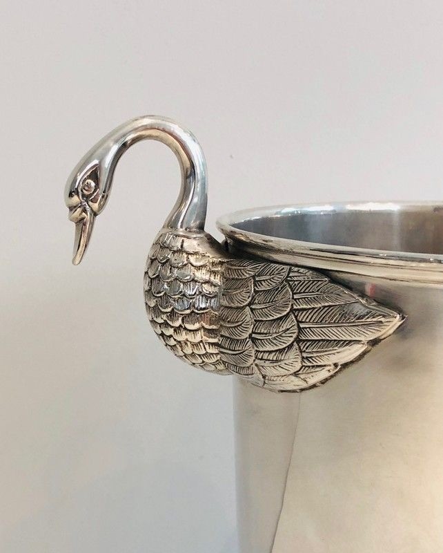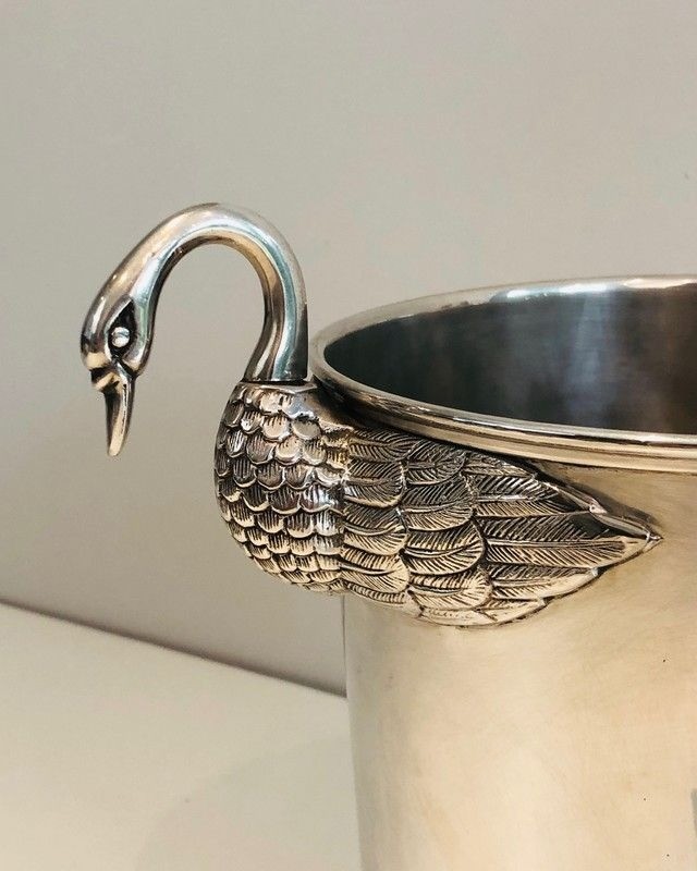 An elegant and distinguished silver-plated champagne bucket, this piece is adorned with the swan motif — one of the most enduring emblems of the French Empire style — rendered with the refined precision of the silversmiths' art. The graceful necks and plumage of the swans are modelled with naturalistic attention, while the silver-plated surface imparts a cool brilliance that makes this piece as beautiful to behold as it is pleasurable to use. The form and decoration together speak of a tradition of table arts maintained at the very highest level.