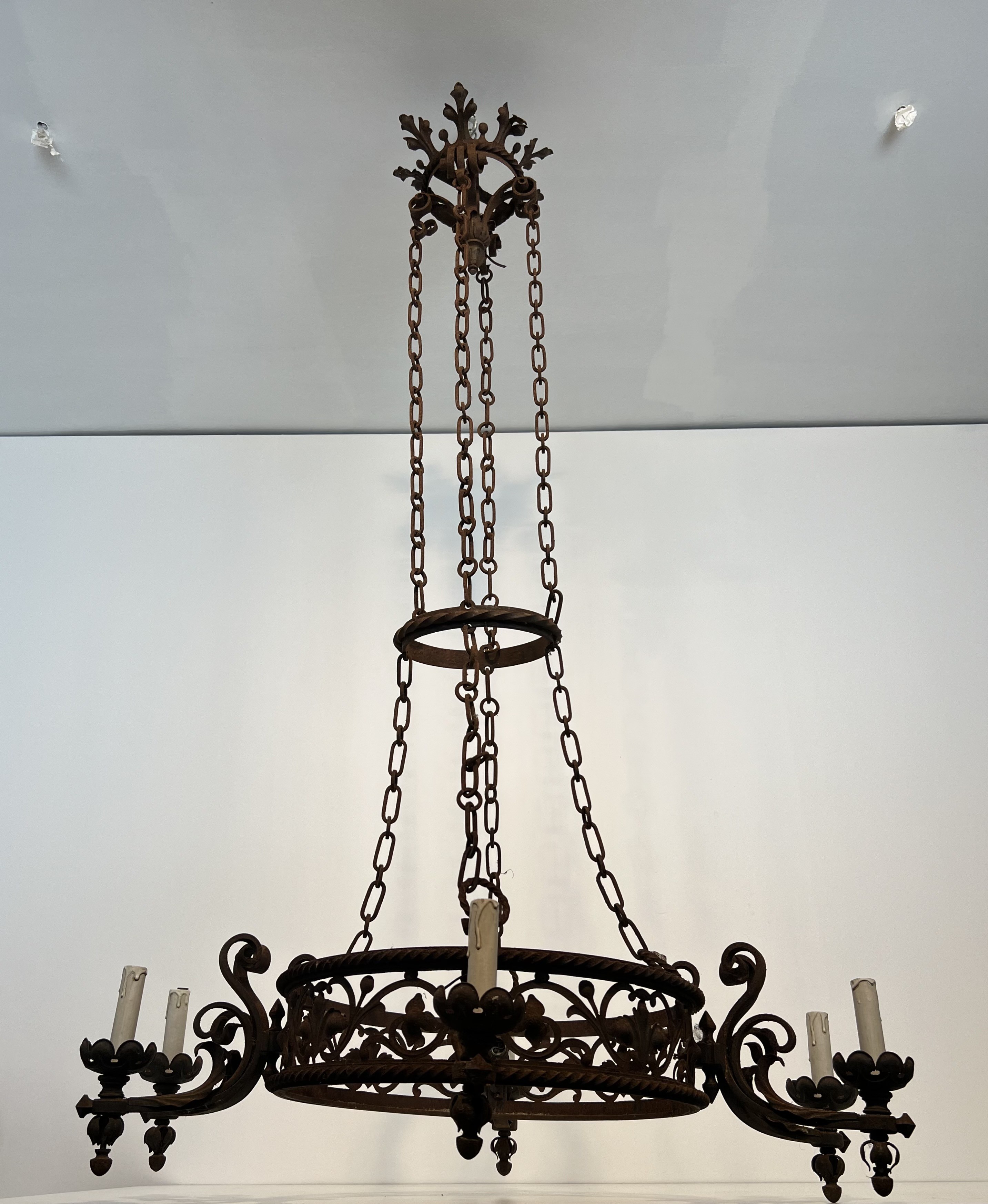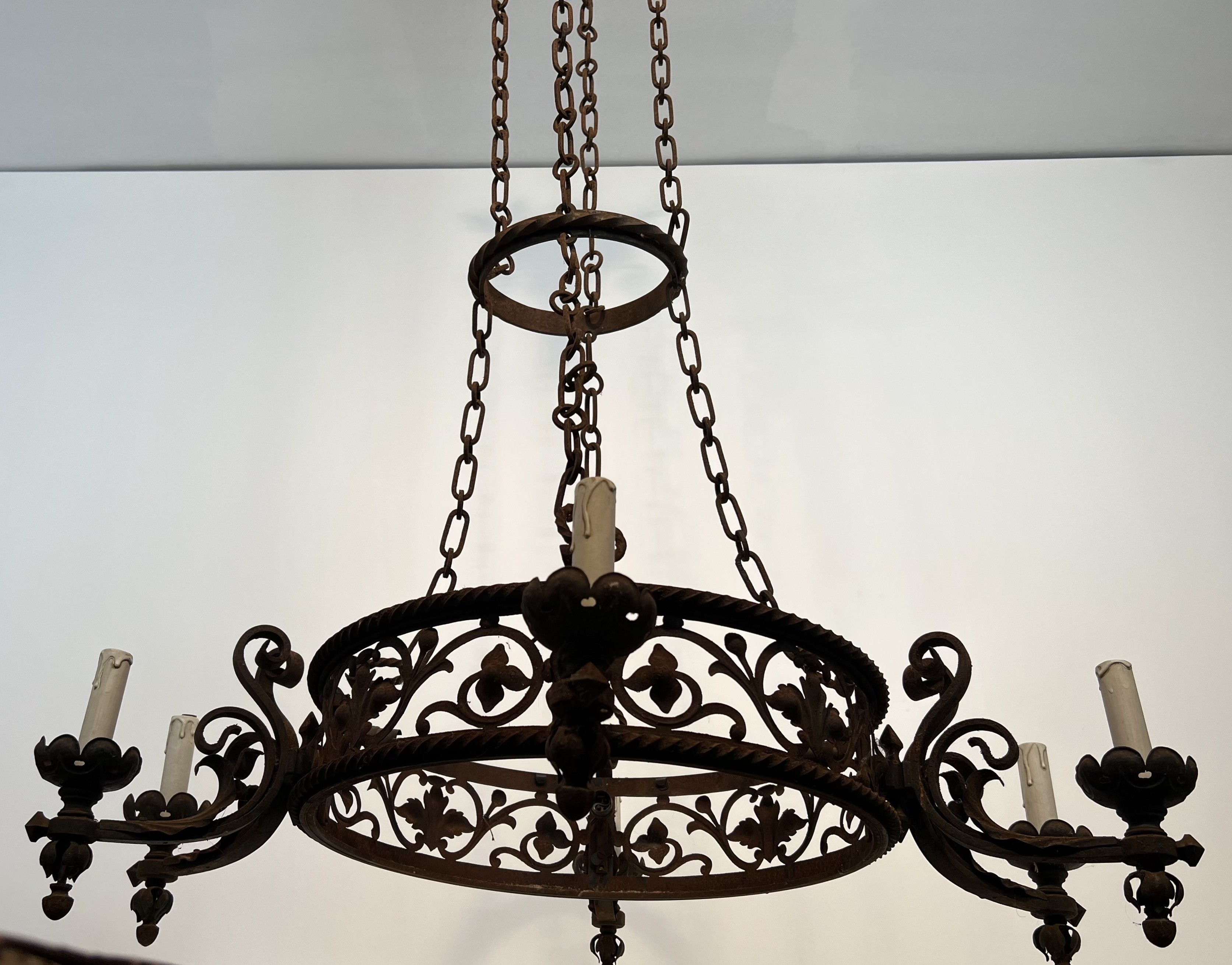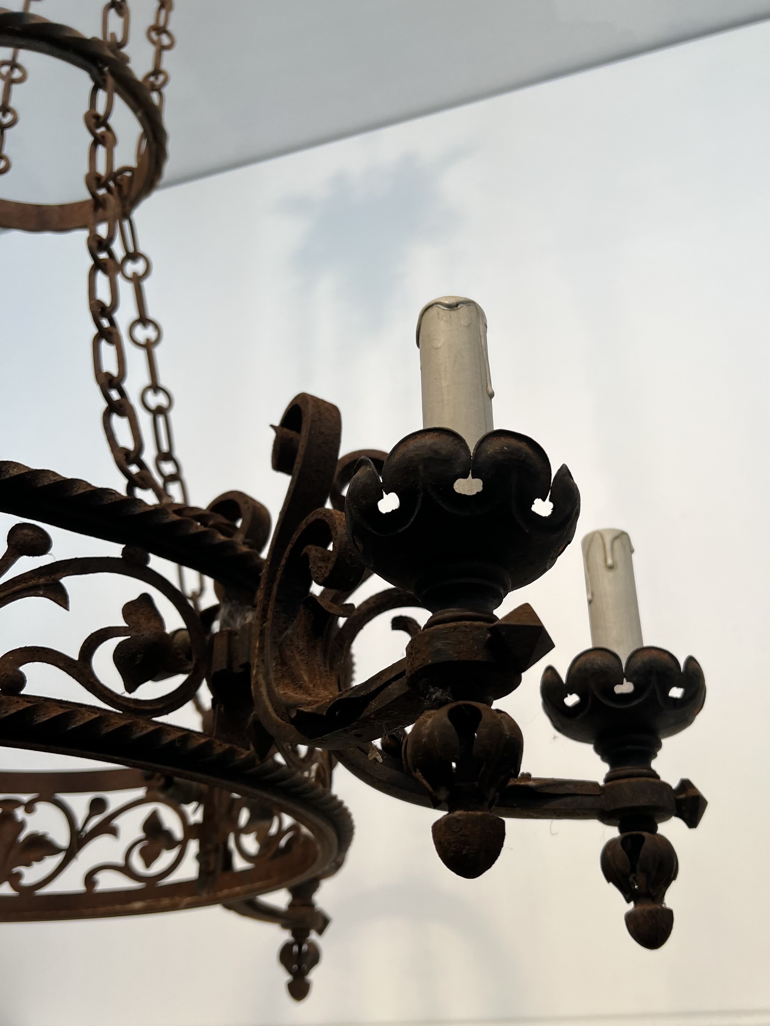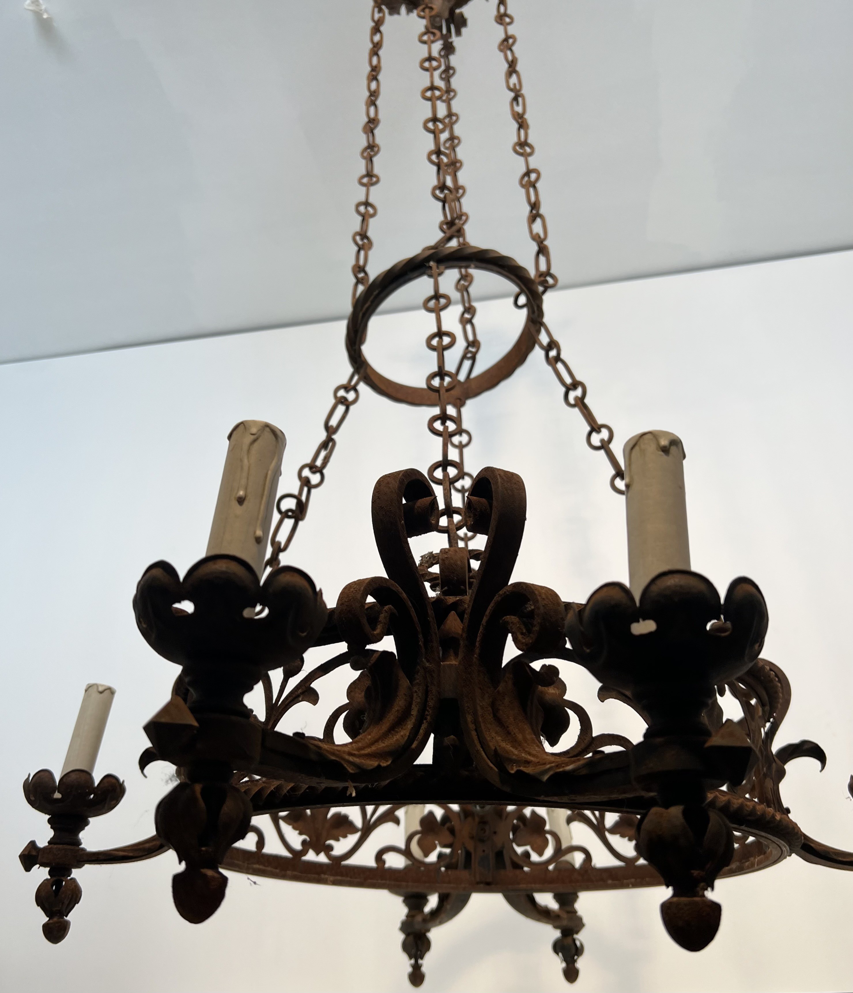 This imposing six-arm chandelier is wrought from iron with considerable skill, its structure articulated by scrolled branches, forged collars, and pointed Gothic detailing that lend the piece a monumental, architectural presence. The six candle arms radiate with studied symmetry from a central column, each terminating in a bobèche designed to hold a candle or electrified fitting. The surface of the iron bears the warm patina of age, testament to over a century of use and the slow oxidation that only genuine antique metalwork acquires.