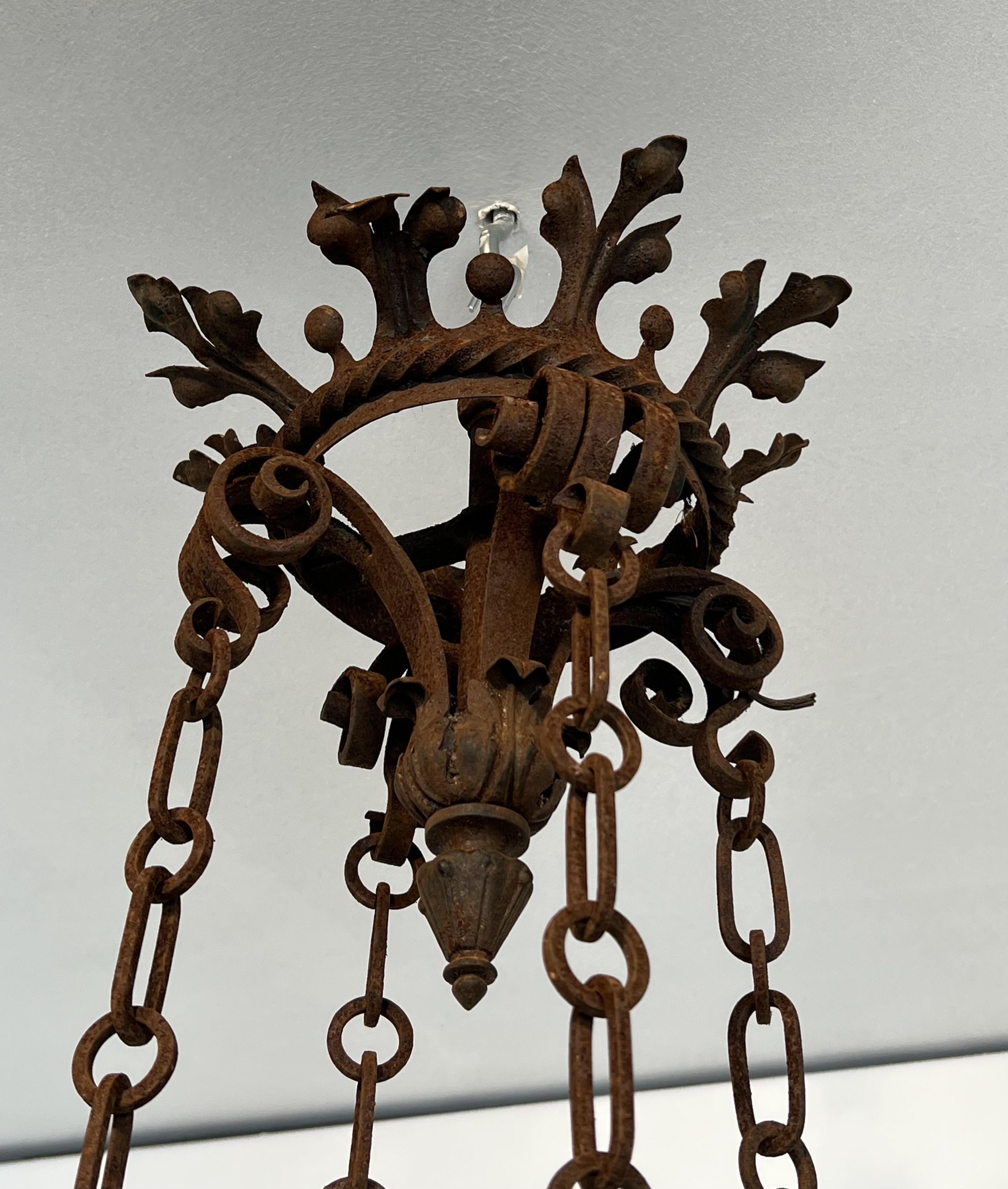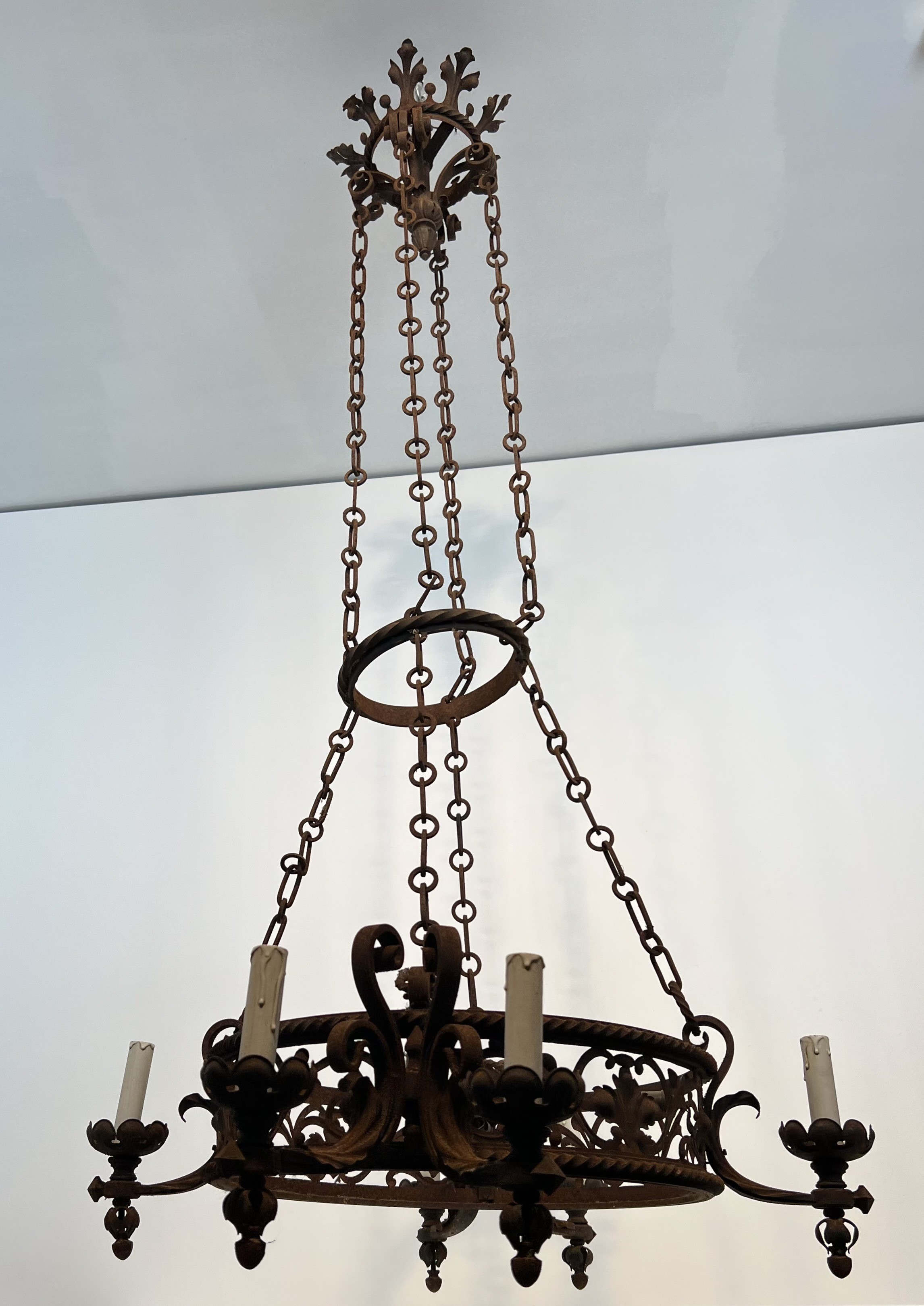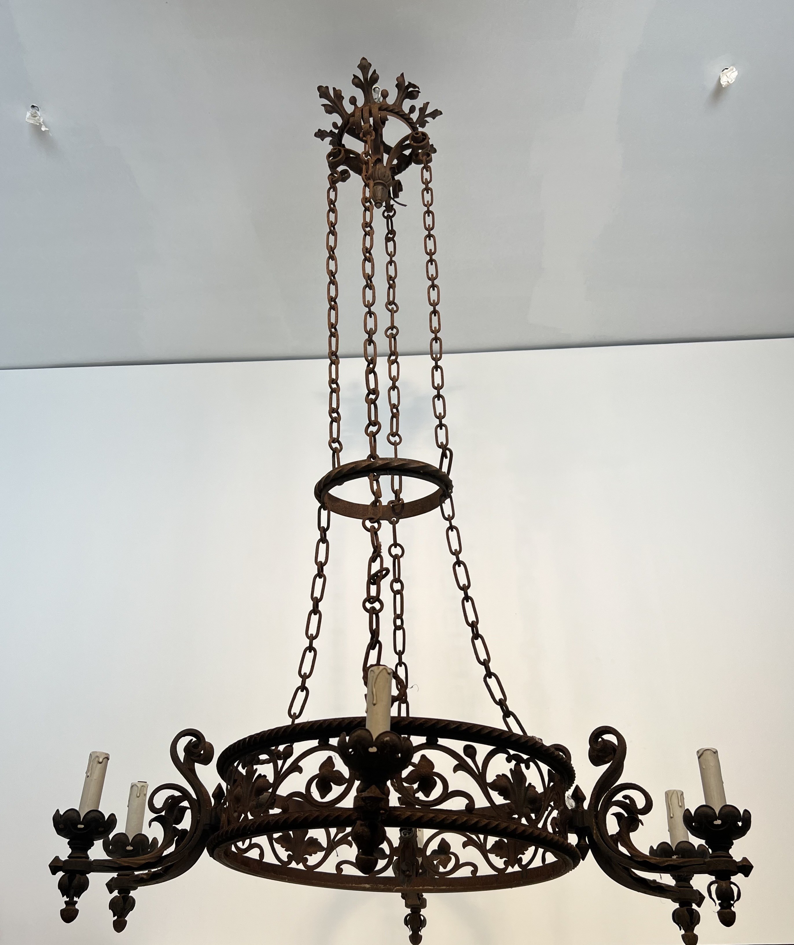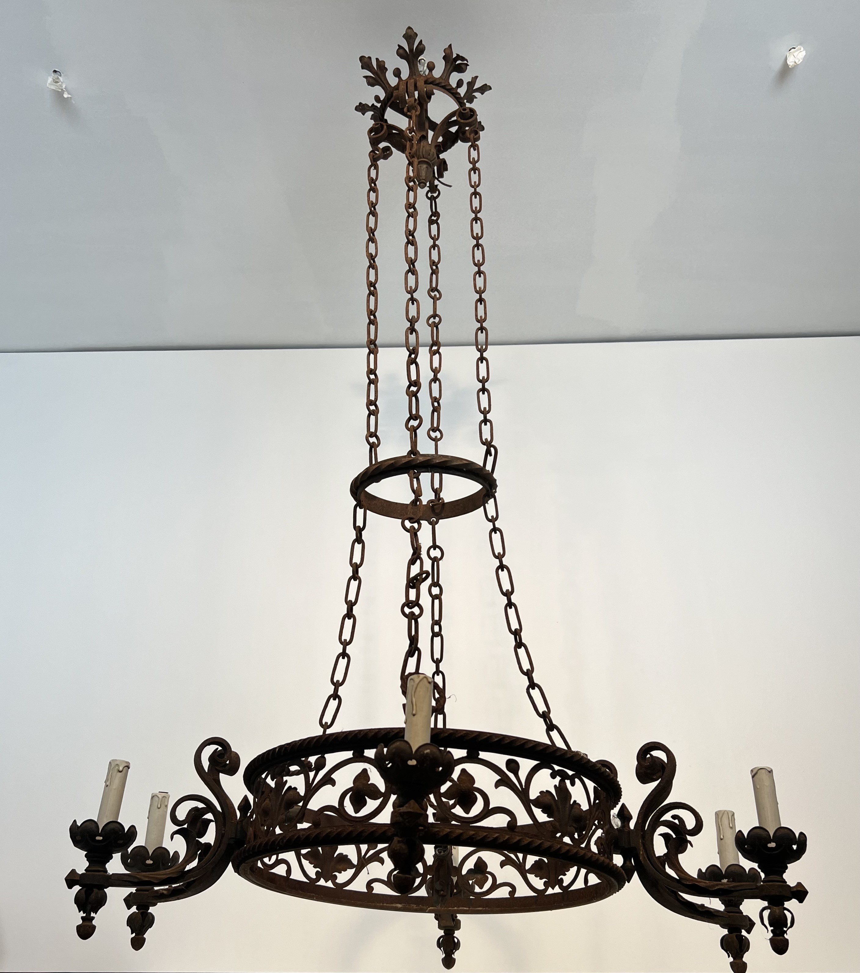 This imposing six-arm chandelier is wrought from iron with considerable skill, its structure articulated by scrolled branches, forged collars, and pointed Gothic detailing that lend the piece a monumental, architectural presence. The six candle arms radiate with studied symmetry from a central column, each terminating in a bobèche designed to hold a candle or electrified fitting. The surface of the iron bears the warm patina of age, testament to over a century of use and the slow oxidation that only genuine antique metalwork acquires.