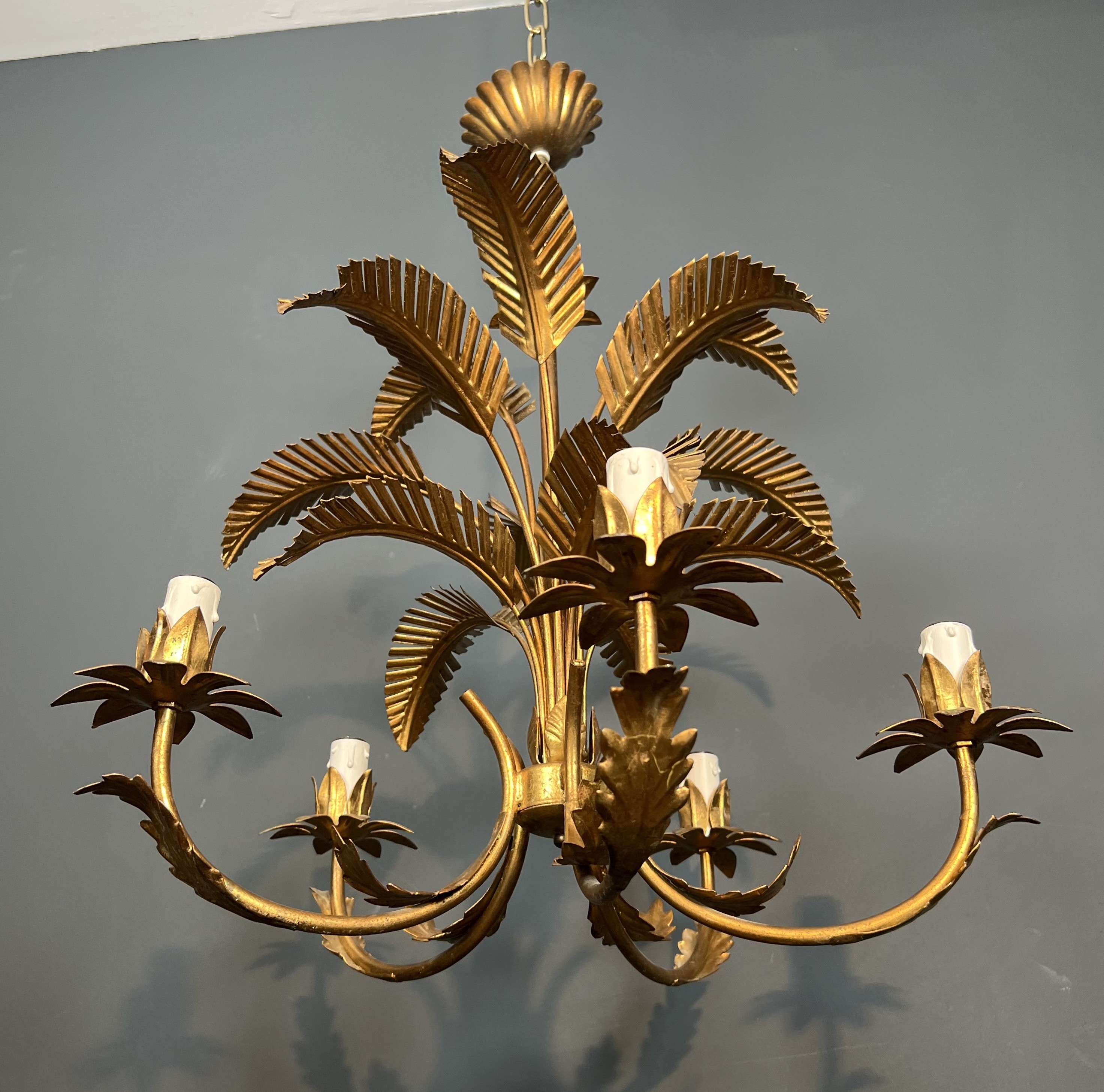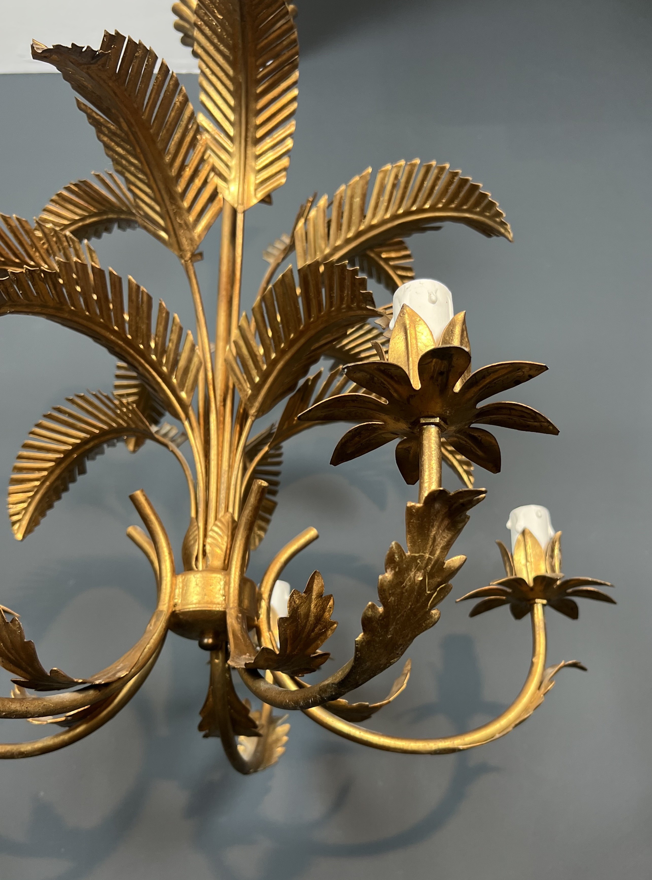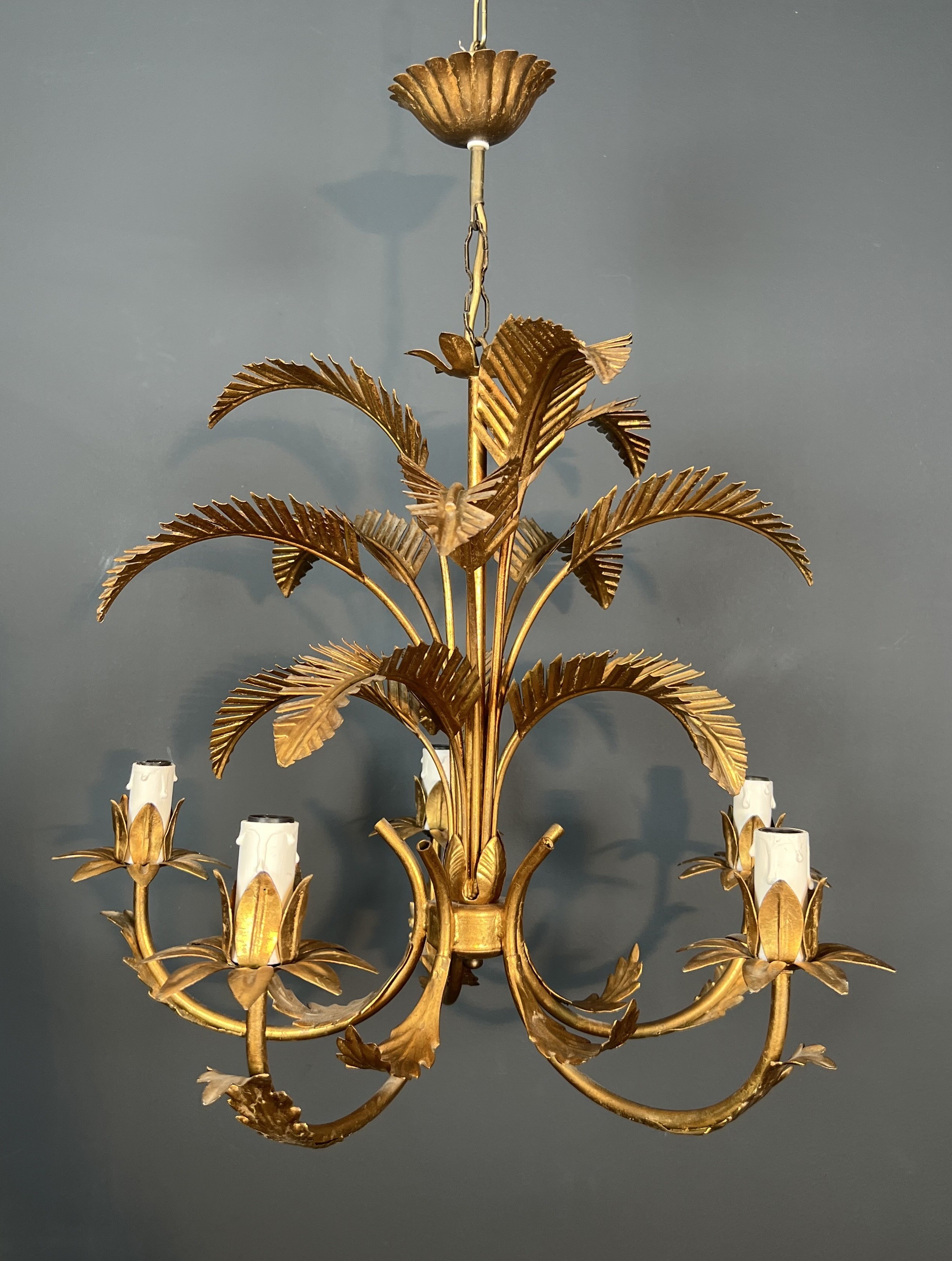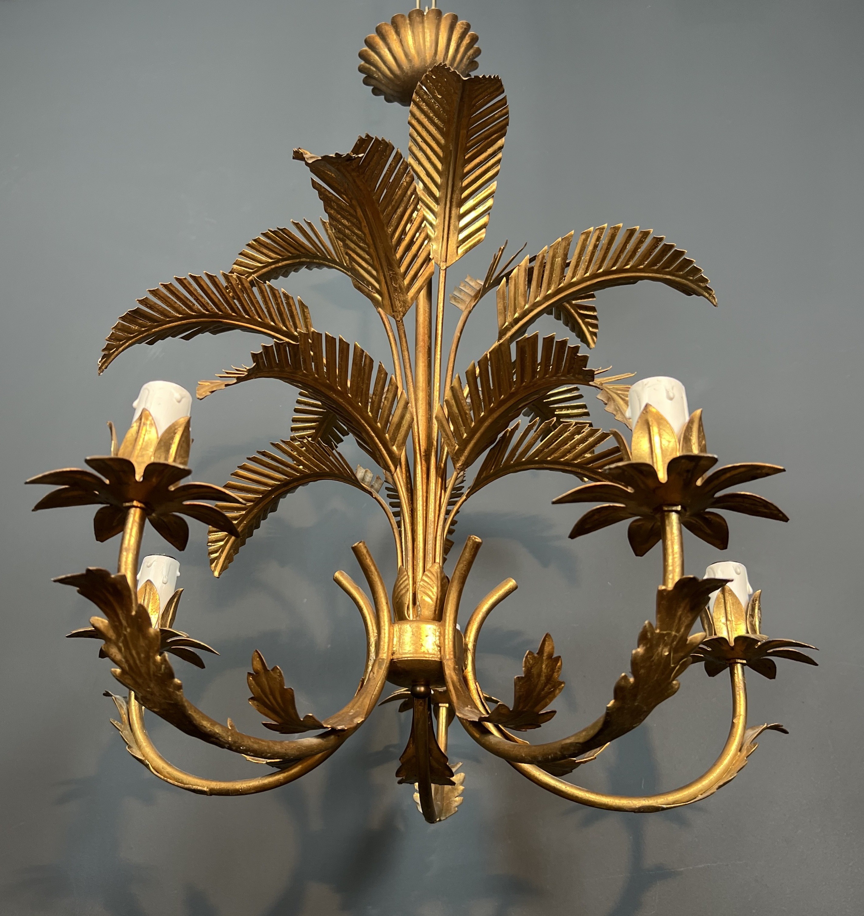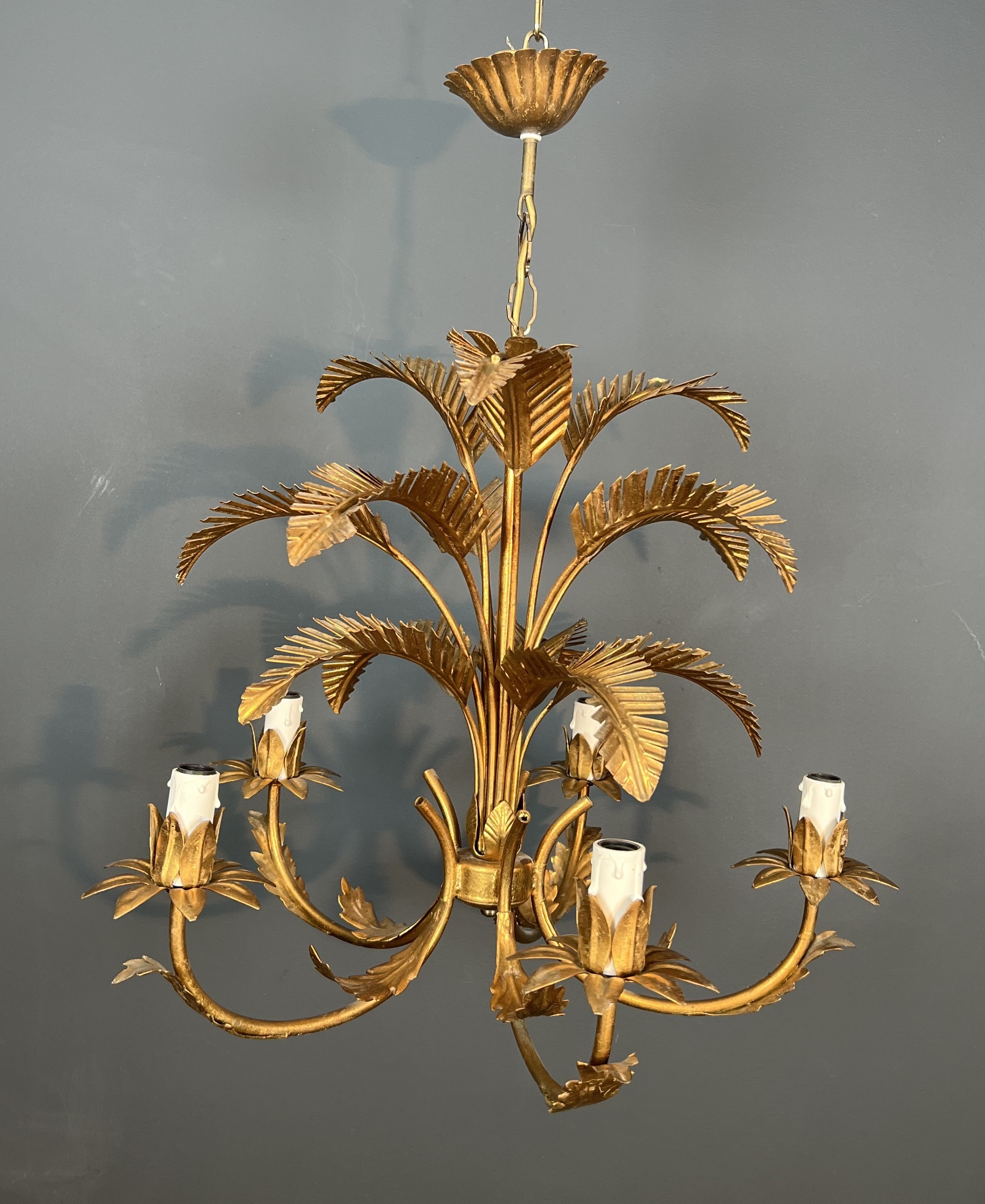 A dramatic five-arm chandelier in gilt iron fashioned as a stylised palm tree, each of the five branches terminating in a candle light nestled among gilded fronds. The gilt ironwork is executed with a lively decorative sensibility, the trunk and fronds modelled with sufficient botanical detail to read as convincingly naturalistic while retaining the formality and symmetry demanded of a fine luminaire. The warm gilding transforms the iron into a shimmering, luxurious object that fills any space with theatrical grandeur.