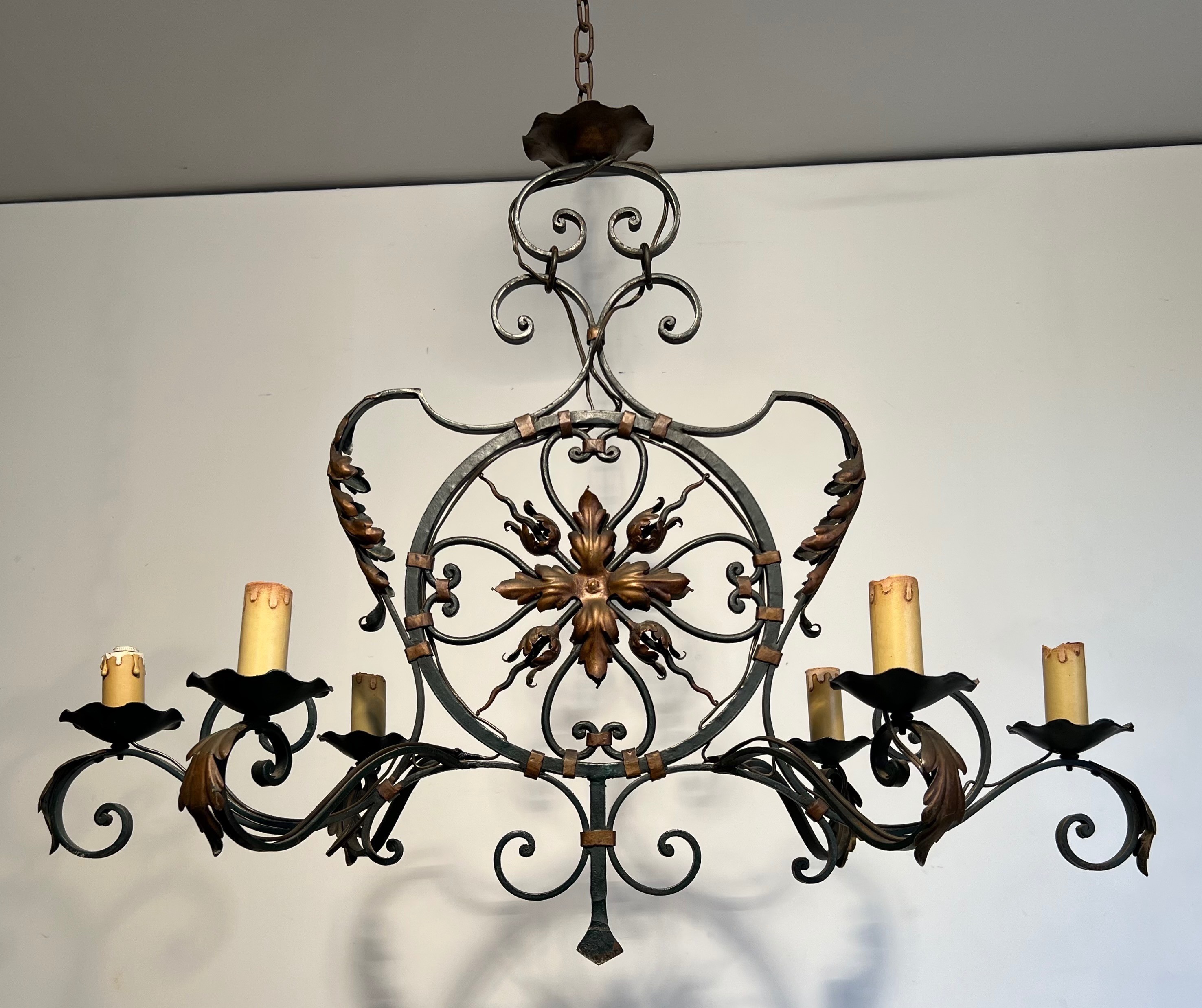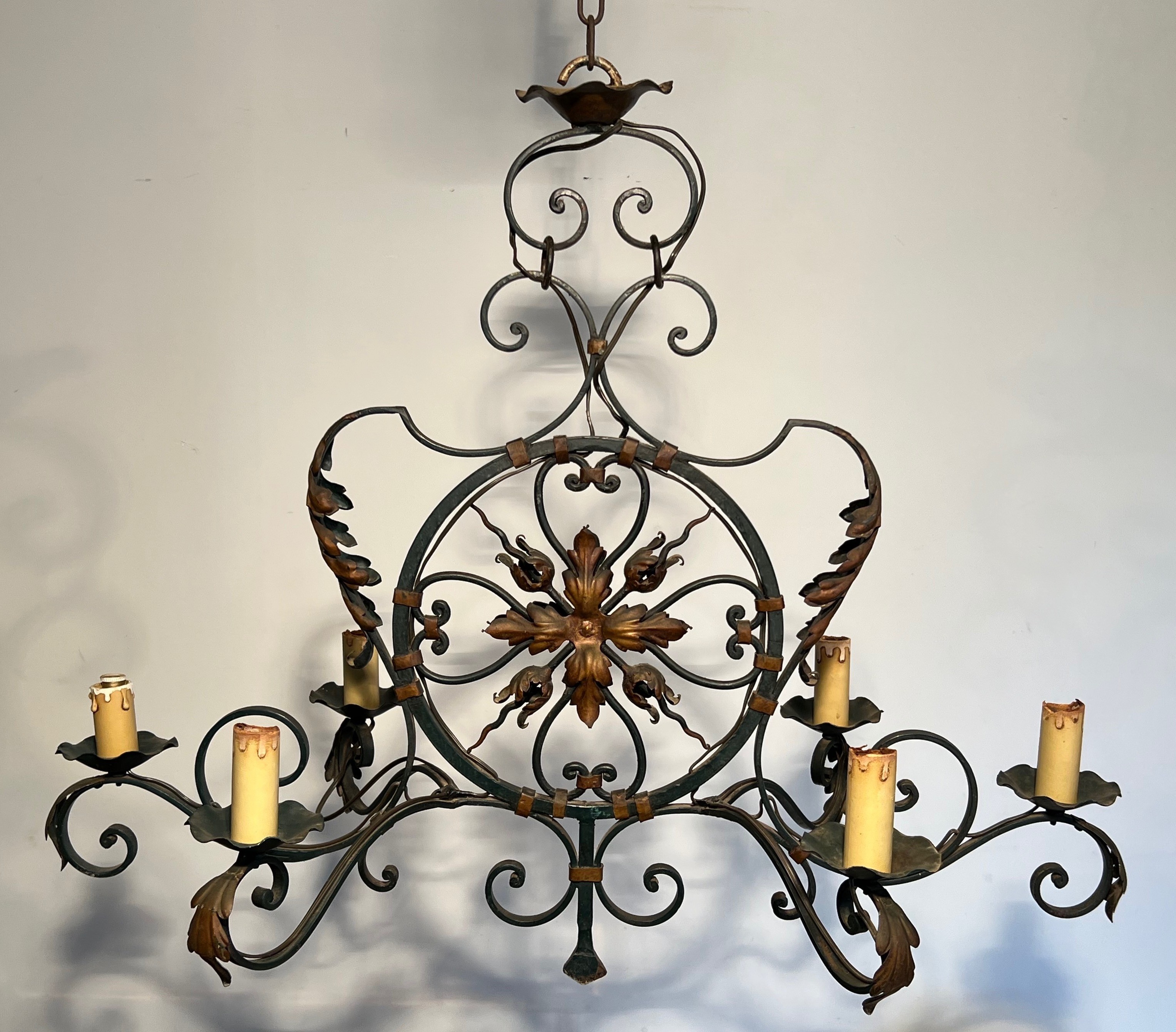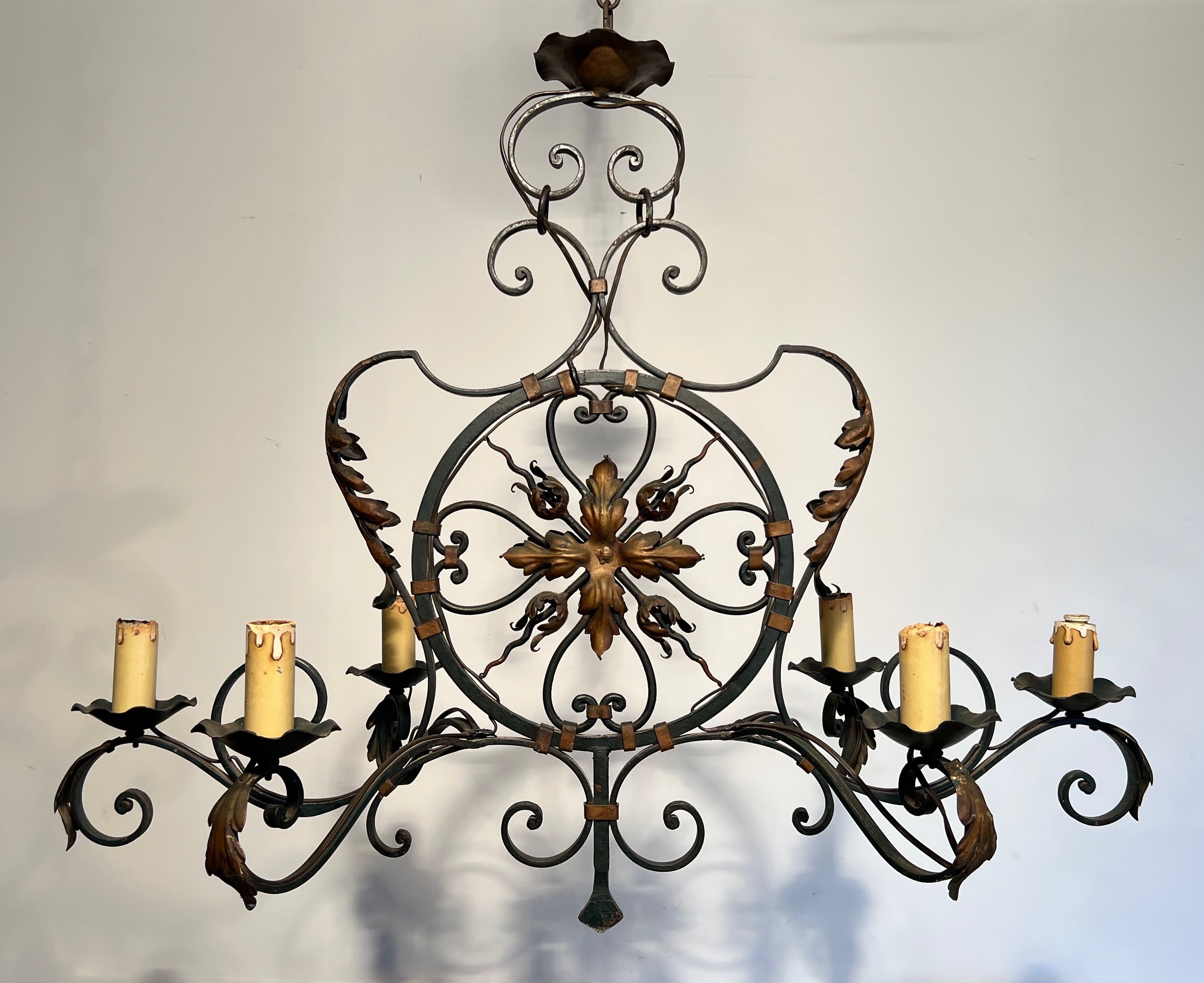 This impressive six-light chandelier, forged from wrought iron and enriched with gilded palmette and foliate ornaments, is a distinguished example of French decorative metalwork from the mid-twentieth century. The monumental scale of the piece — befitting the grand entrance halls, salons, and formal dining rooms of the era — speaks to the ambition of a period in which ironwork regained favour as a medium capable of blending classical ornament with the robustness of traditional craftsmanship.