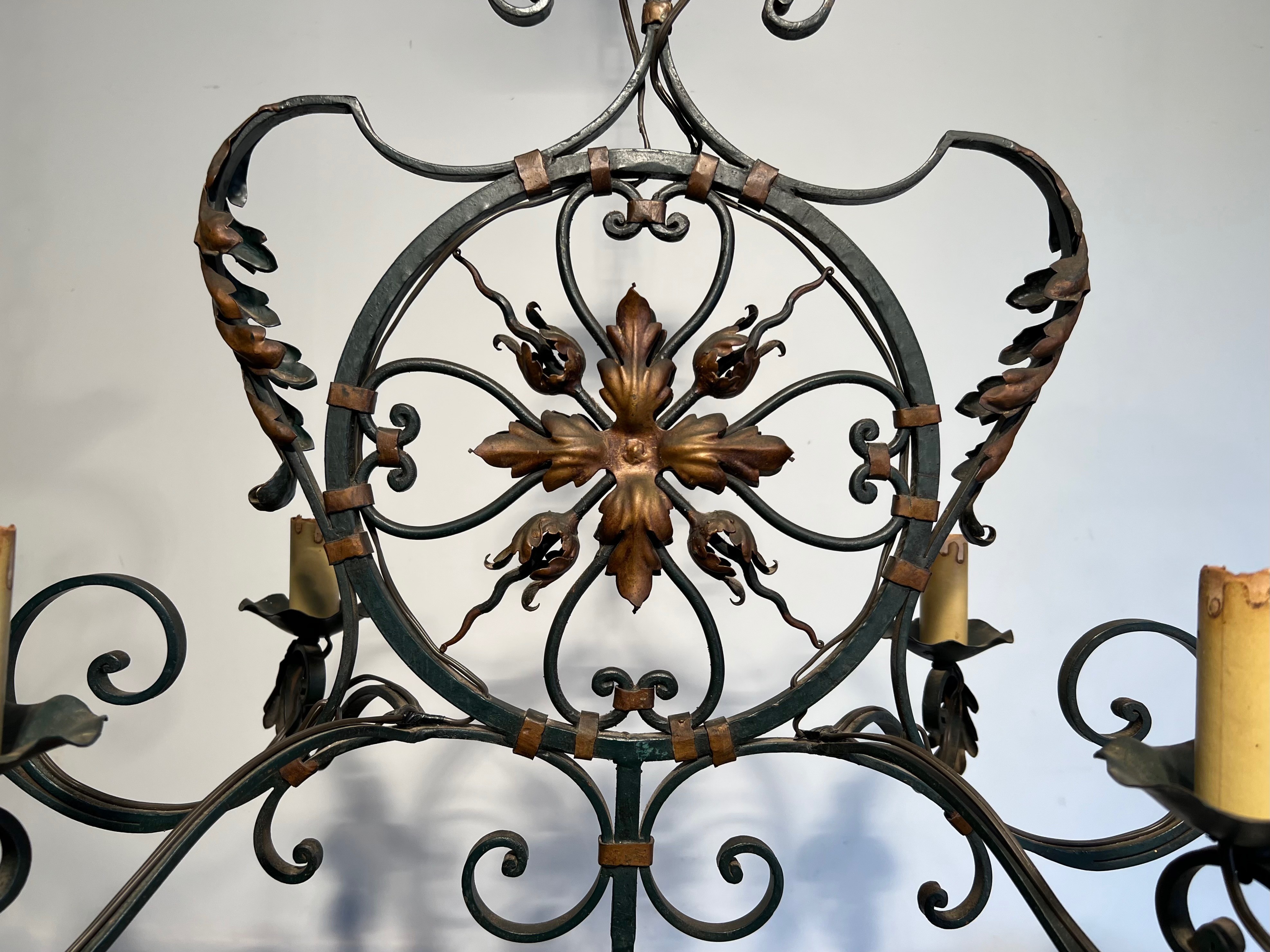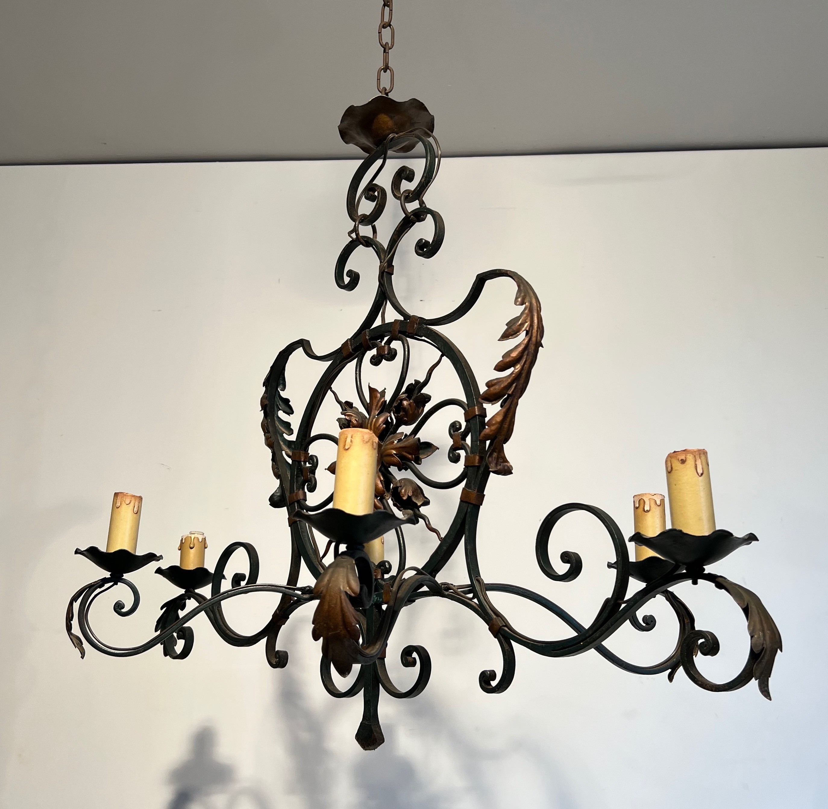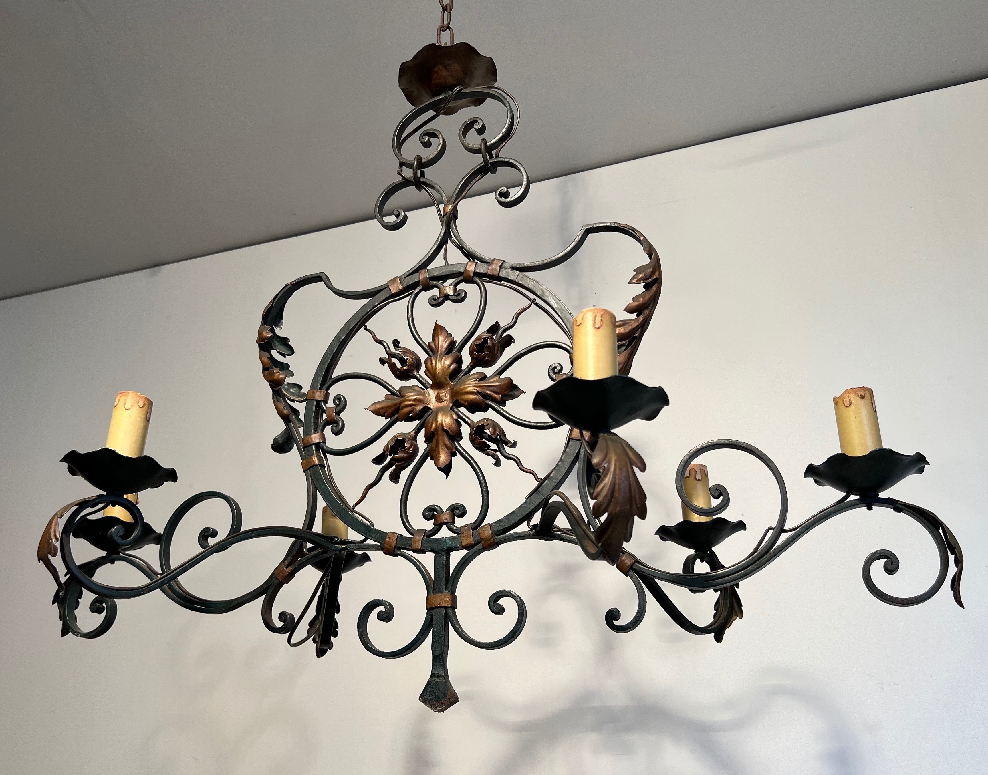 This impressive six-light chandelier, forged from wrought iron and enriched with gilded palmette and foliate ornaments, is a distinguished example of French decorative metalwork from the mid-twentieth century. The monumental scale of the piece — befitting the grand entrance halls, salons, and formal dining rooms of the era — speaks to the ambition of a period in which ironwork regained favour as a medium capable of blending classical ornament with the robustness of traditional craftsmanship.