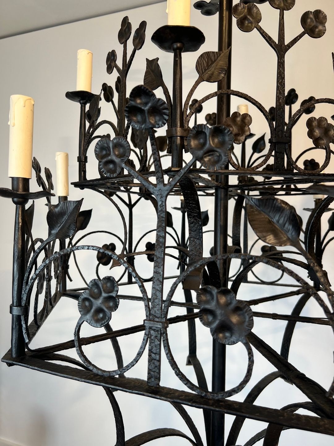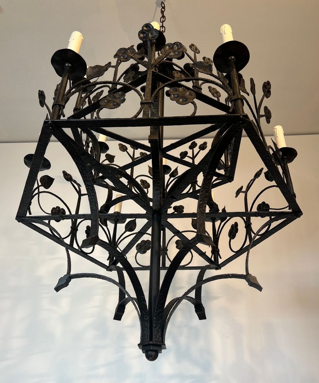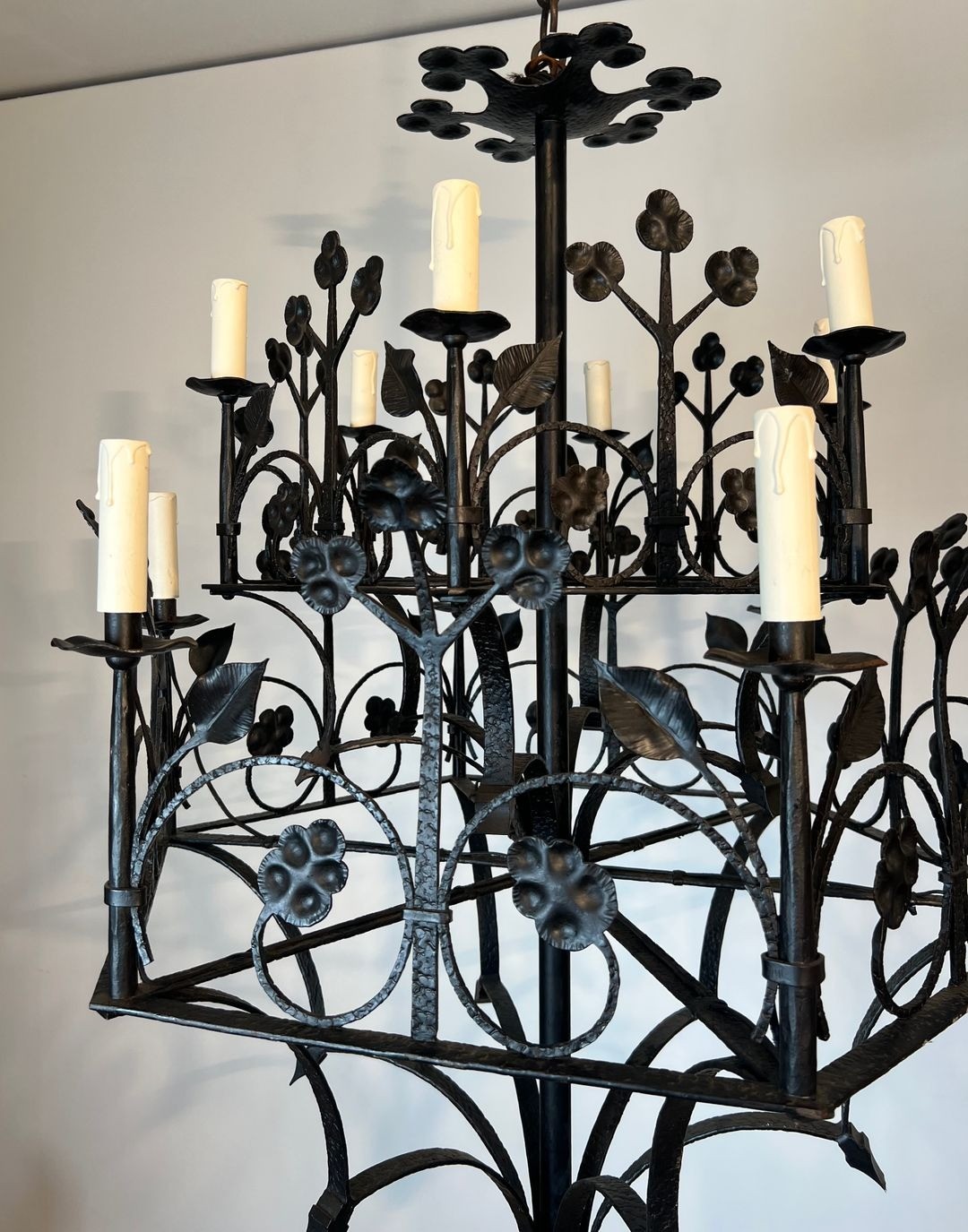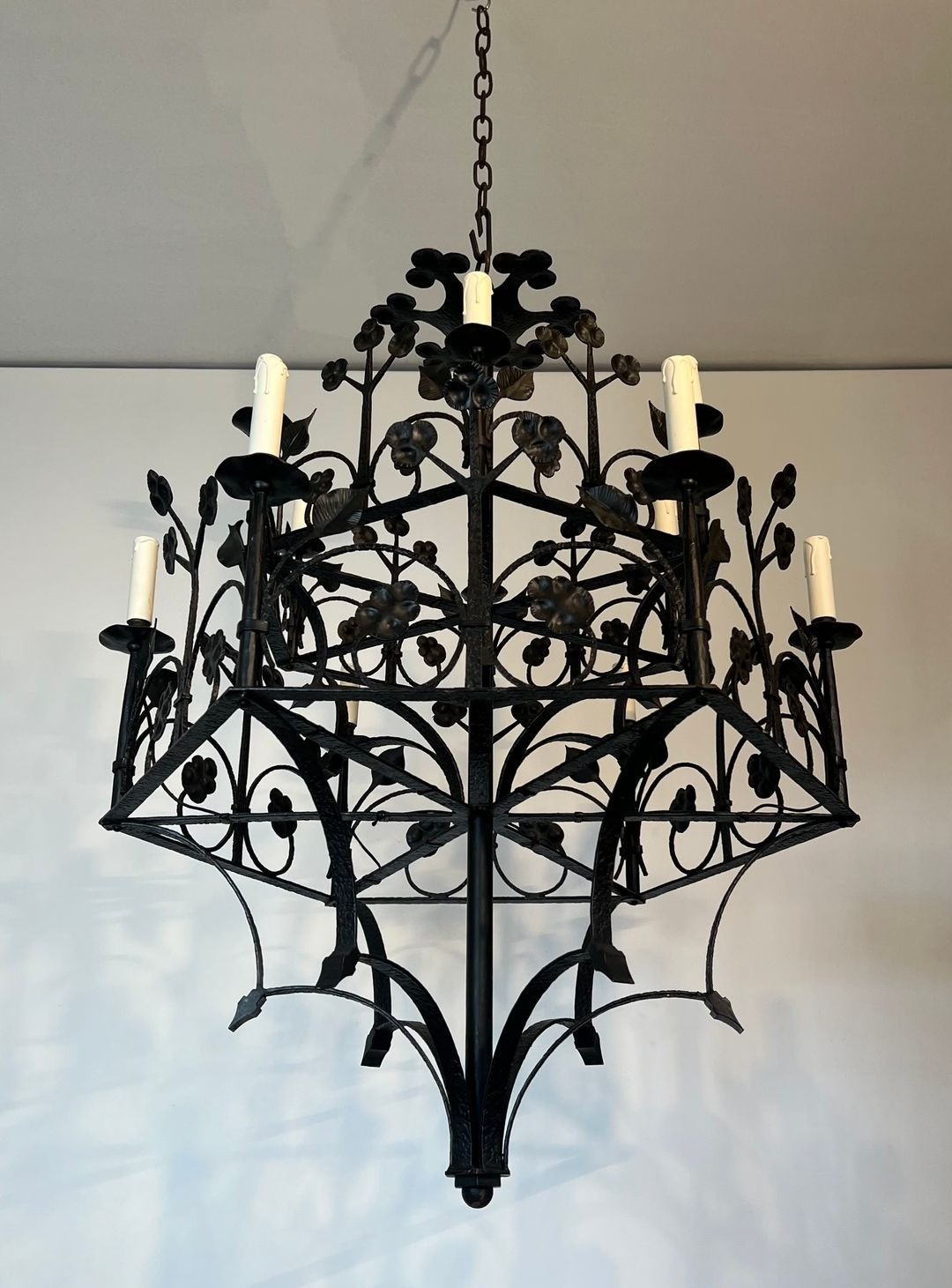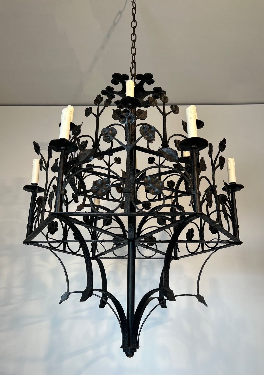 This impressive twelve-light chandelier, wrought by hand from iron, exemplifies the enduring tradition of French artisan metalwork at the turn of the twentieth century. The main body rises in a hierarchical composition, its armature branching outward into twelve scrolled candle-arms that radiate with studied symmetry. Covering the entire surface, a profusion of hand-hammered clover leaves and sinuous foliage trails animates the ironwork with a naturalistic energy characteristic of the Neo-Gothic revival.