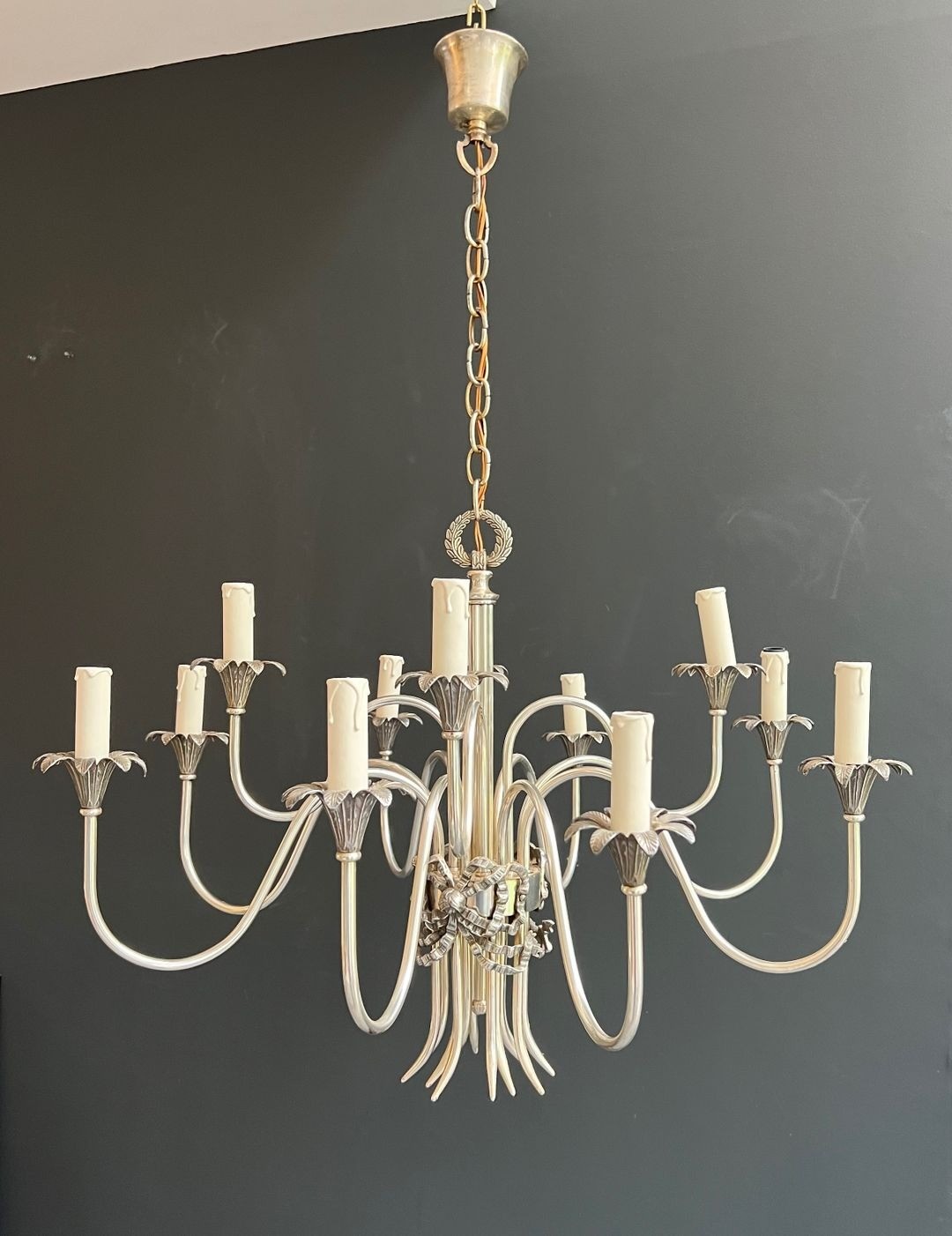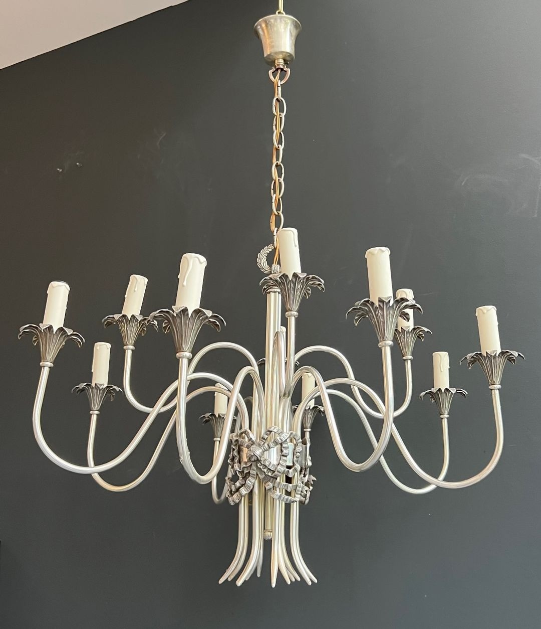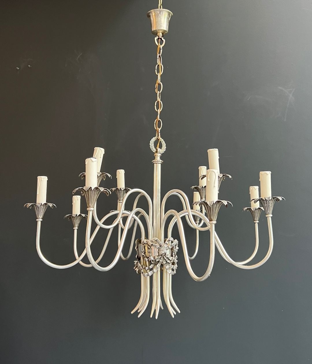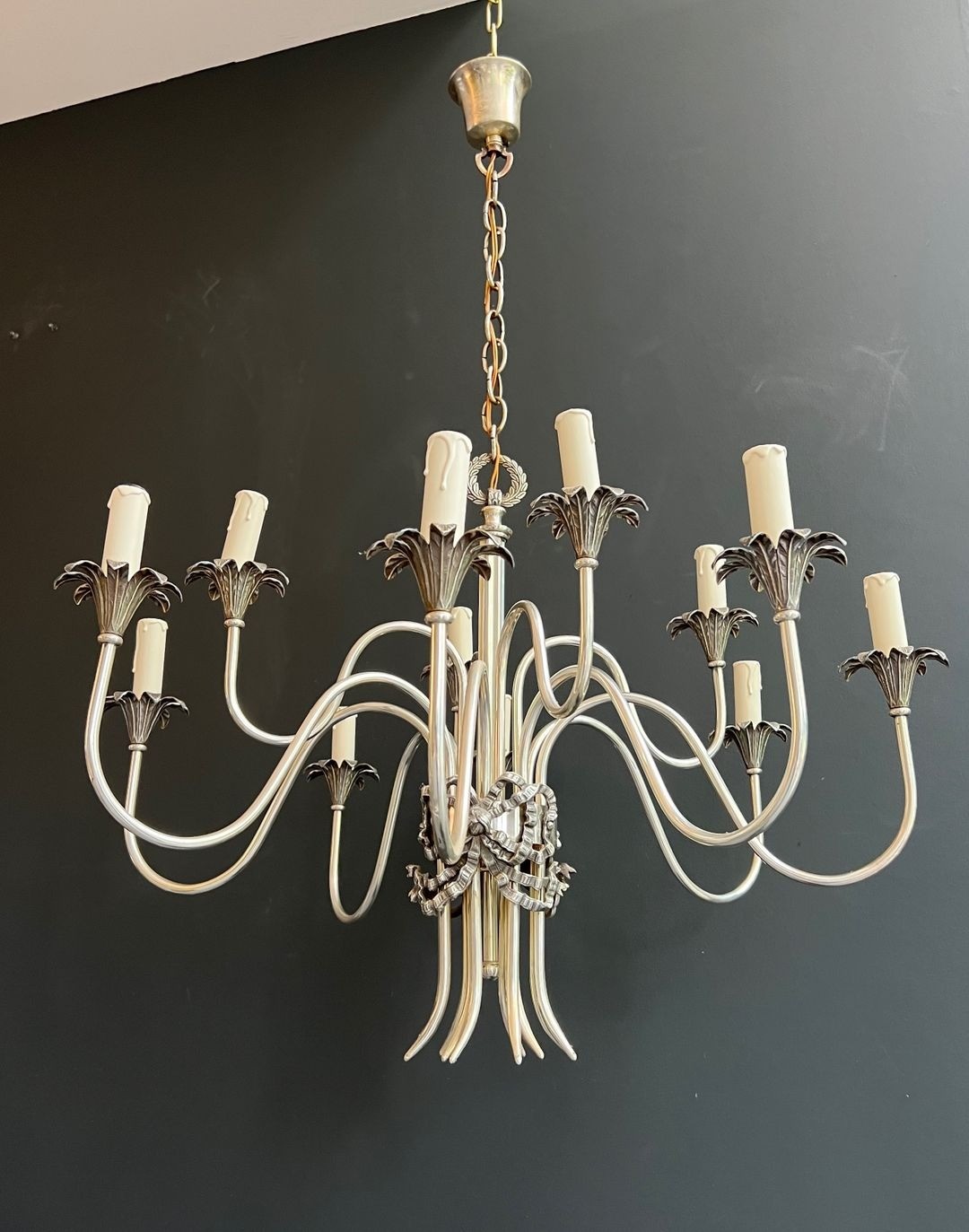 Distinguished by the cool luminosity of its silvered metal finish, this eight-arm neoclassical chandelier by Maison Charles of circa 1940 represents one of the most accomplished productions of a house synonymous with the finest French decorative metalwork. The eight arms are disposed in the classical manner, radiating outward from a central stem of architectural profile, their candle cups and supporting elements treated with the restraint and precision that characterise Maison Charles’s neoclassical output. The broad horizontal diameter of 82 cm, combined with the relatively shallow height of 57 cm, gives the fixture a disc-like presence that spreads light generously beneath — an intentional quality of the classical chandelier at its most sophisticated.