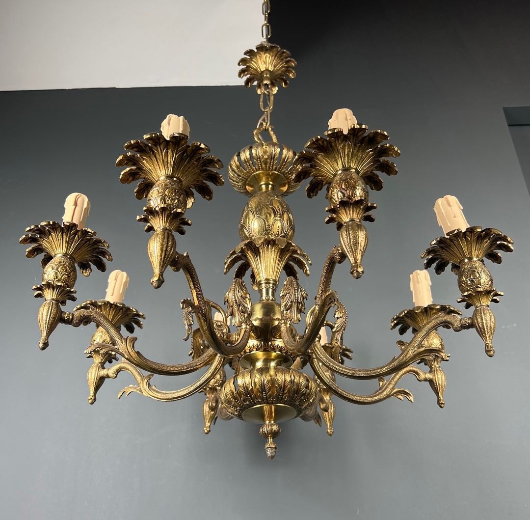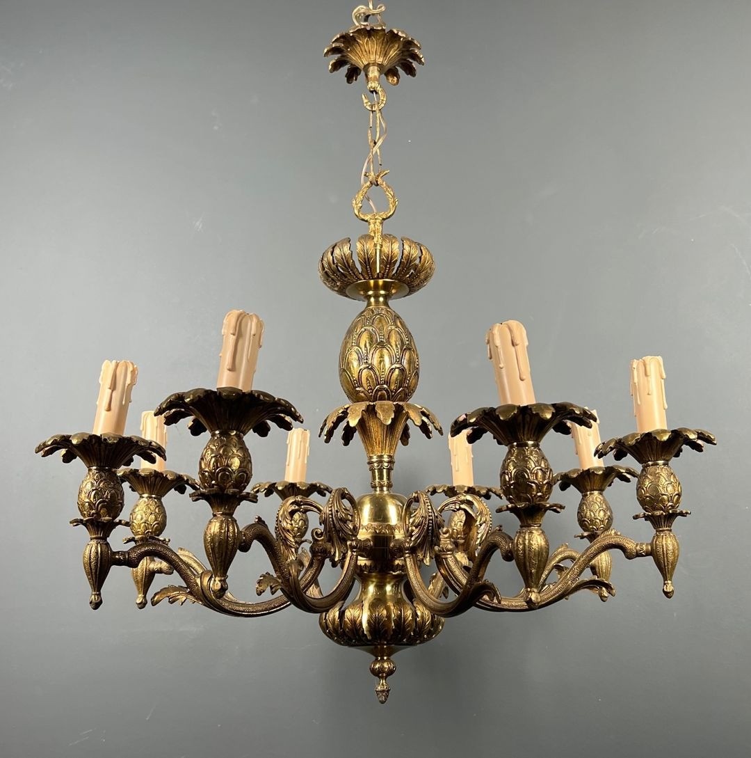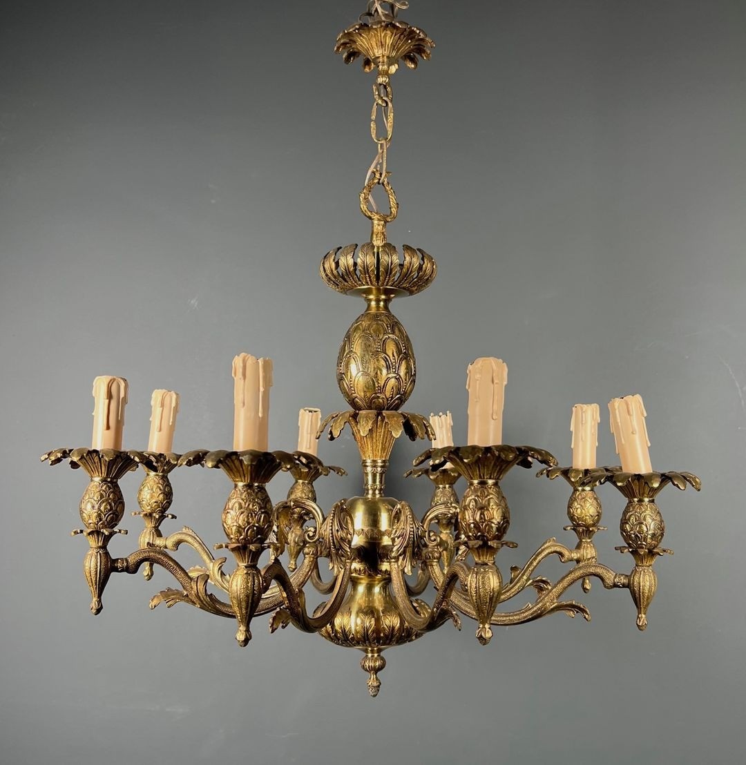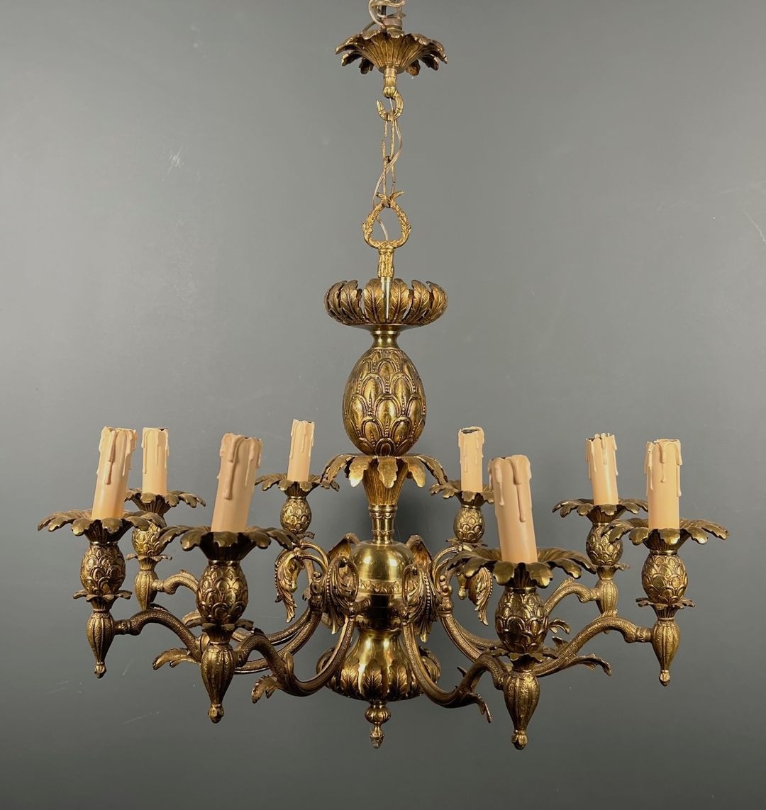 This chandelier is a characteristic example of that revival: eight arms in patinated bronze radiate from a central stem crowned by a pineapple in full three-dimensional relief, each arm ending in a candle nozzle that amplifies the warm tone of the metal. The casting is accomplished and confident, the proportions well-judged at 71 cm in diameter, the overall silhouette closer to a welcoming domestic scale than to the monumental bronze chandeliers of the grands salons. The work follows the manner of Maison Charles — the Paris house that, through the 1950s to 1980s, became the definitive address for bronze lighting of this character.