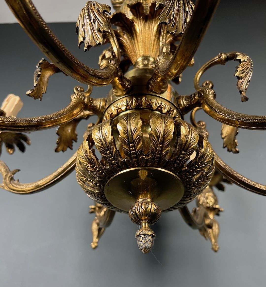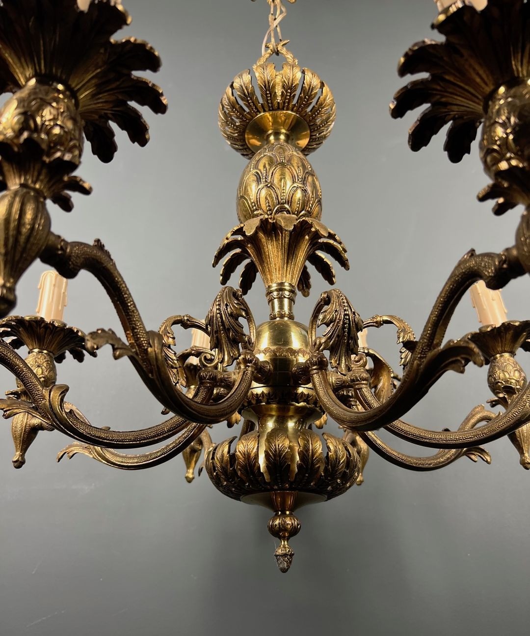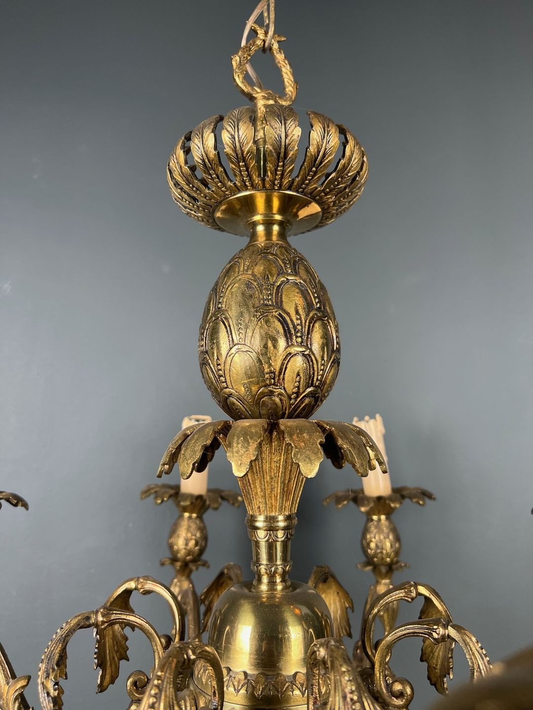 This chandelier is a characteristic example of that revival: eight arms in patinated bronze radiate from a central stem crowned by a pineapple in full three-dimensional relief, each arm ending in a candle nozzle that amplifies the warm tone of the metal. The casting is accomplished and confident, the proportions well-judged at 71 cm in diameter, the overall silhouette closer to a welcoming domestic scale than to the monumental bronze chandeliers of the grands salons. The work follows the manner of Maison Charles — the Paris house that, through the 1950s to 1980s, became the definitive address for bronze lighting of this character.