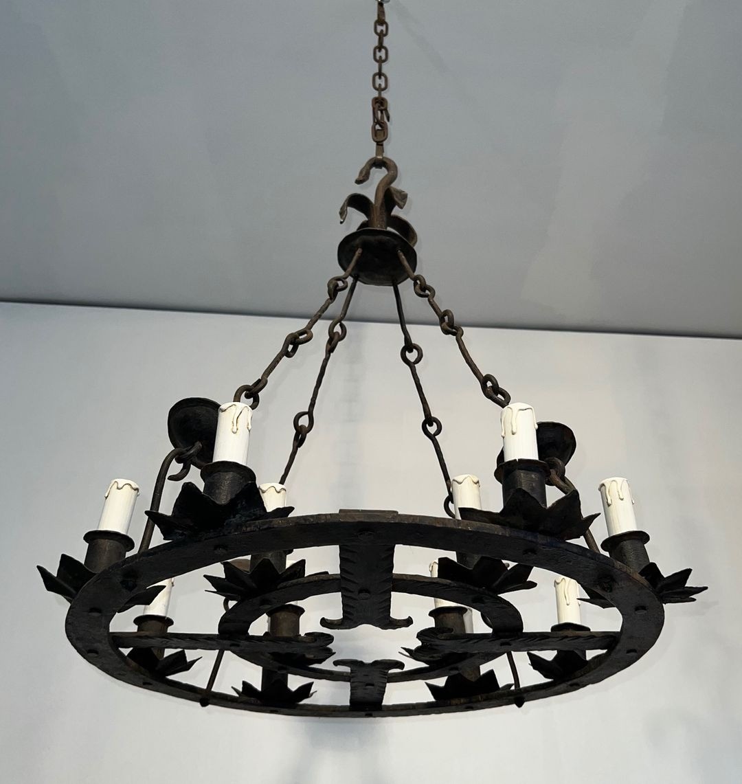 Twelve lights: the number carries an old weight in Gothic ecclesiastical culture, recalling the apostolic crowns of Carolingian and Romanesque chapels and the twelve hours that govern both the liturgical day and the medieval cosmological order. In the hands of a French ironsmith working in the Gothic taste during the 1940s, a twelve-light chandelier was not a casual commission. It implied a grand space — a château vestibule, a galleried staircase hall, a library in the Gothic Revival manner — and demanded of the maker a command of balance, the twelve arms arranged in registers to avoid the visual confusion that too many candles too loosely marshalled could produce.