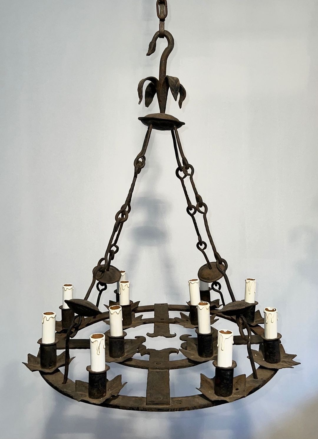 This piece answers that demand with clarity. The 65-centimetre diameter contains twelve arms with disciplined economy, the forged scrollwork at each junction maintaining a visual rhythm around the circumference. The central column is sturdy and well-articulated, typical of the best provincial atelier work of the 1940s, a period in which wrought iron continued to flourish in France as a prestige material even when bronze and cast iron were constrained by wartime economics. The Gothic vocabulary — pointed candle cups, foliate scroll terminals, a silhouette that rises toward a crown — is applied with confidence rather than archaeological pedantry.