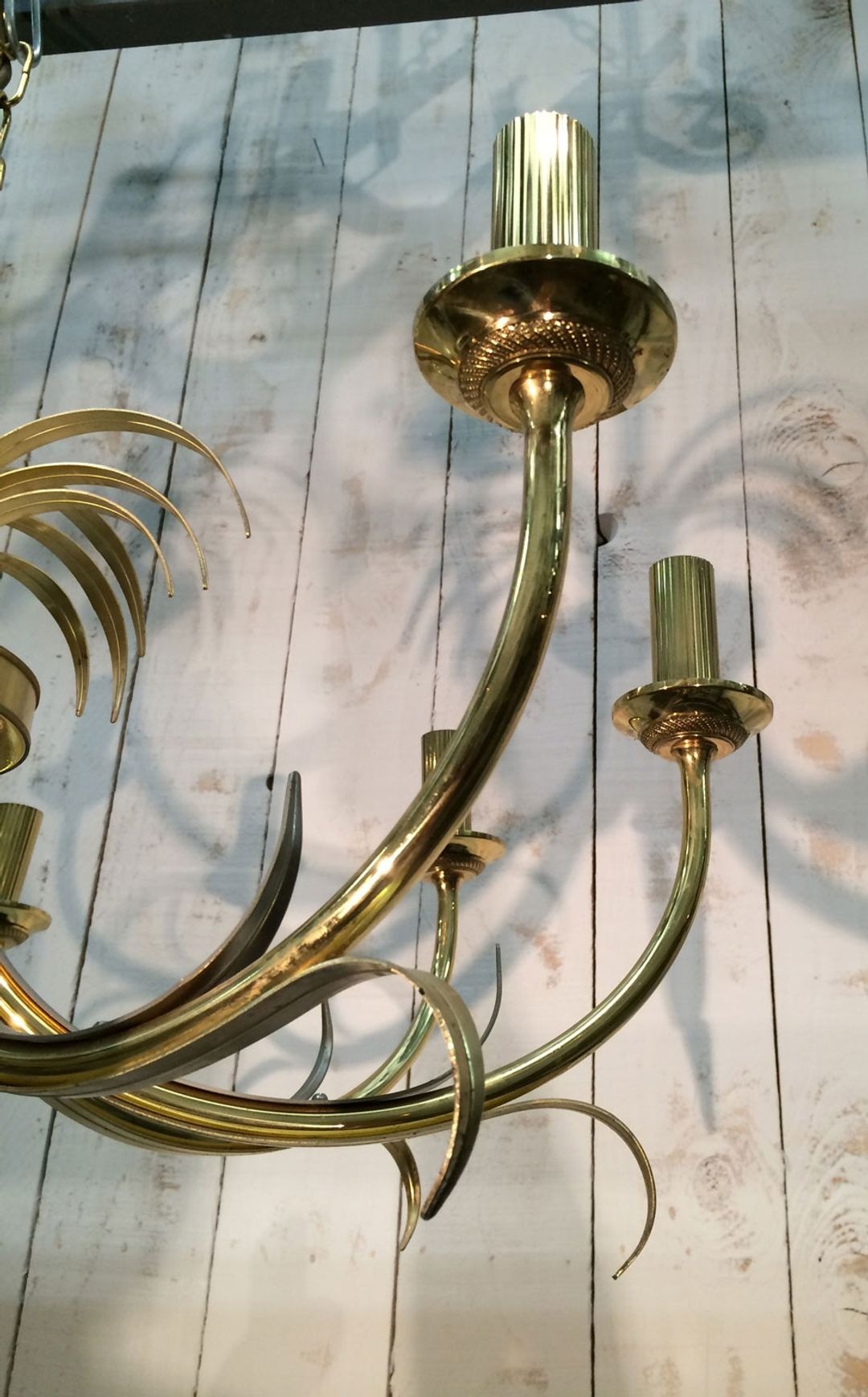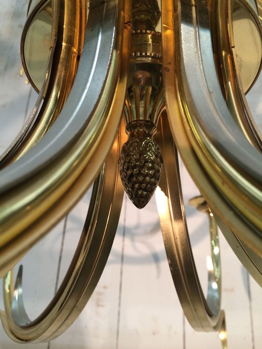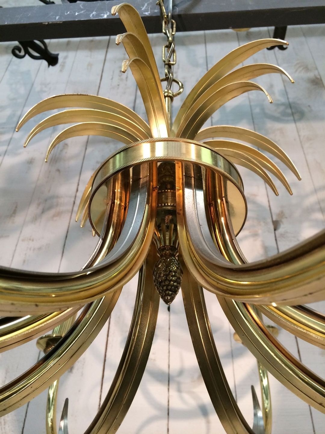 What distinguishes this chandelier from other pineapple examples of the period is the deliberate opposition of surfaces: the body of the fixture is worked in brushed metal, its texture absorbing and softening ambient light, while the pineapple crown and the structural elements are finished in gilt, warm and reflective. This chromatic and textural dialogue — matte against brilliant, cool grey-silver against yellow gold — is a characteristic stratagem of French luxury design in the 1970s, when interior decorators began treating metalwork with the same sophistication previously reserved for textiles and lacquerwork. The result is a piece that changes character as the viewer moves around it.