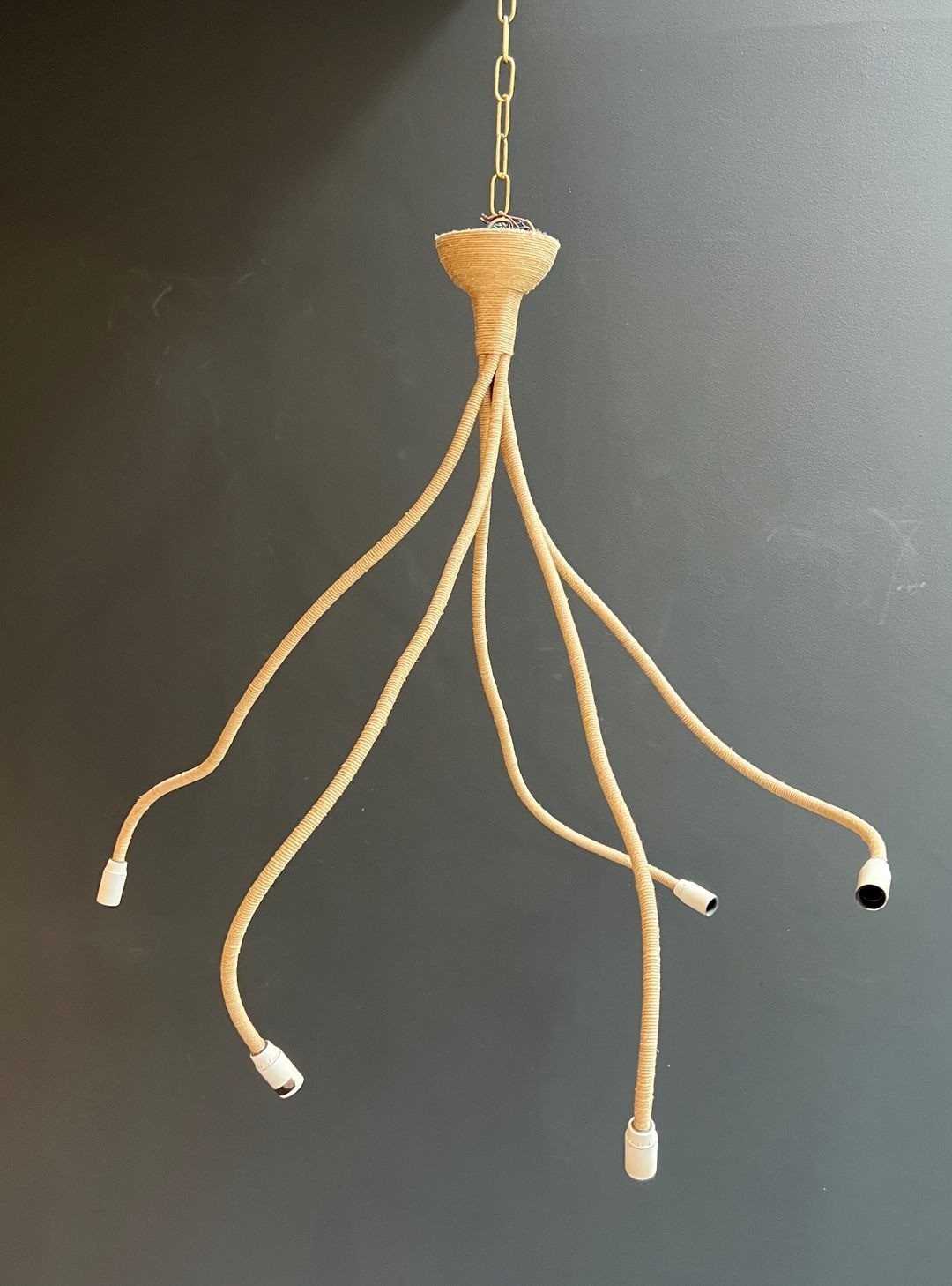 This chandelier, worked in rope with the assurance of a trained craftsman, is substantial: at 88 centimetres wide and 87 in height, it commands space in the manner of a traditional bronze chandelier but with a radically different material proposition. The structure of the piece exploits the inherent properties of the cord — its weight, its twist, its capacity to hold form when knotted or coiled — to create a three-dimensional object that is at once lamp and sculpture. The warm, neutral tonality of natural rope reads beautifully against white plaster, exposed stone or the warm timber panelling of a 1970s interior.