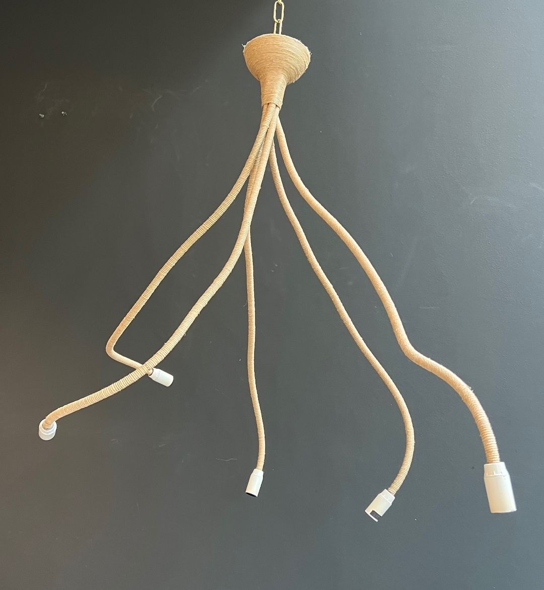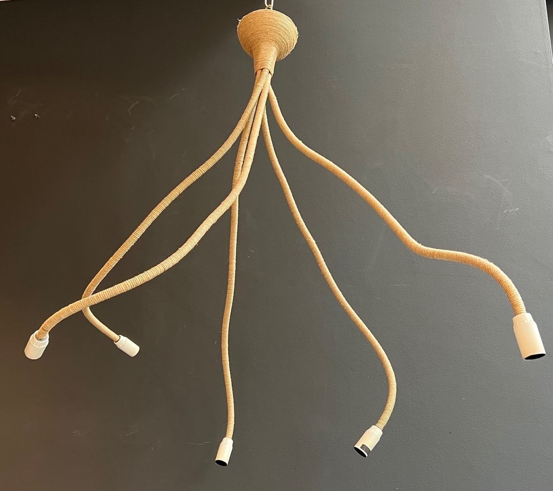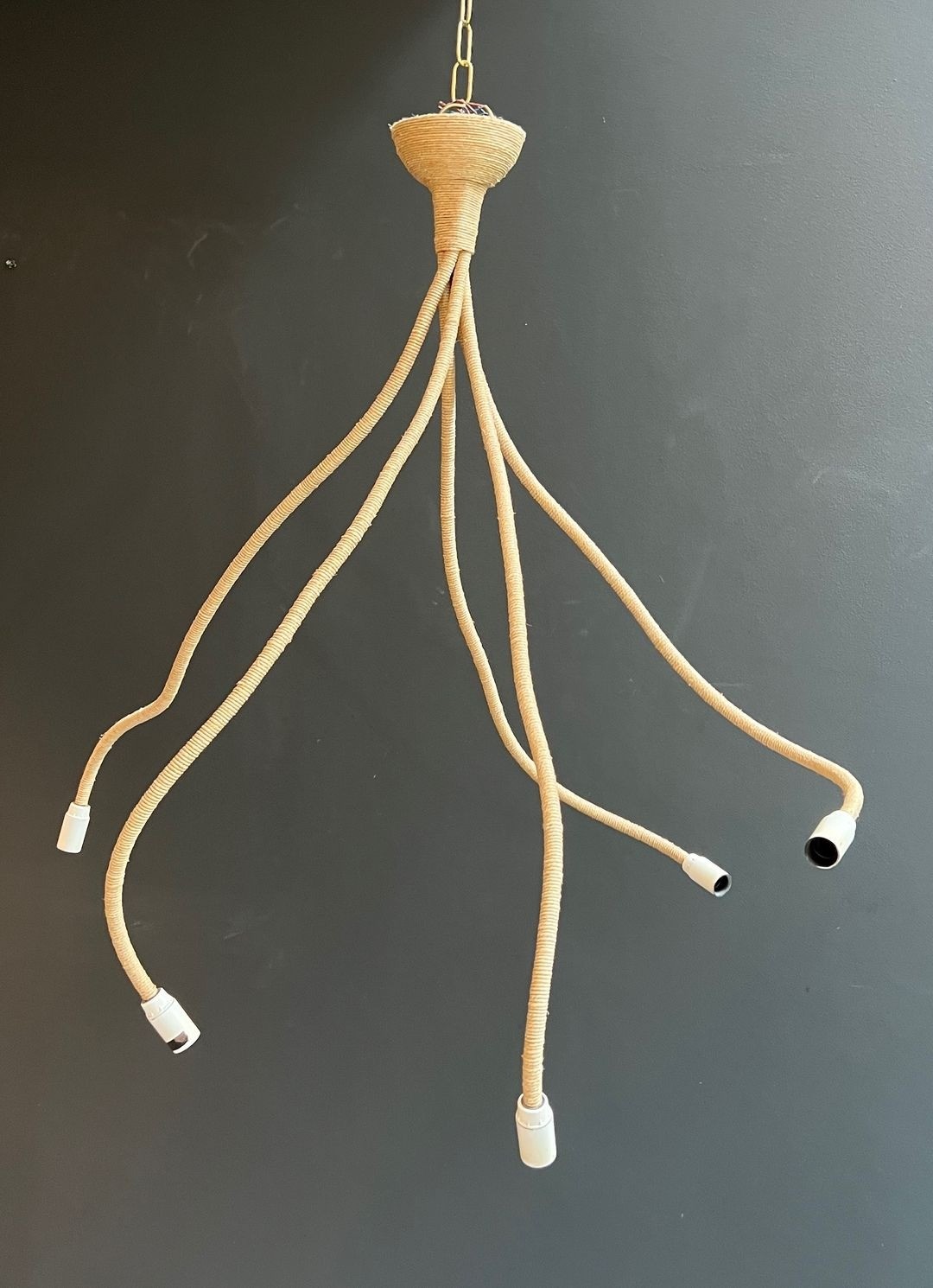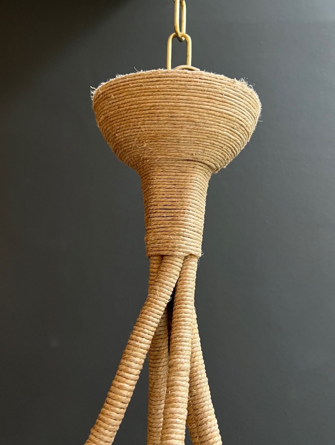 Today the rope chandelier occupies a distinctive position in the market for French mid-century decorative objects: neither as recognisably collectible as the canonical designs of the post-war ateliers, nor as anonymous as a purely functional piece, it offers the collector an object of real presence at a point where its cultural moment is being reassessed with renewed interest. In excellent condition. Width 88 cm, depth 73 cm, height 87 cm.