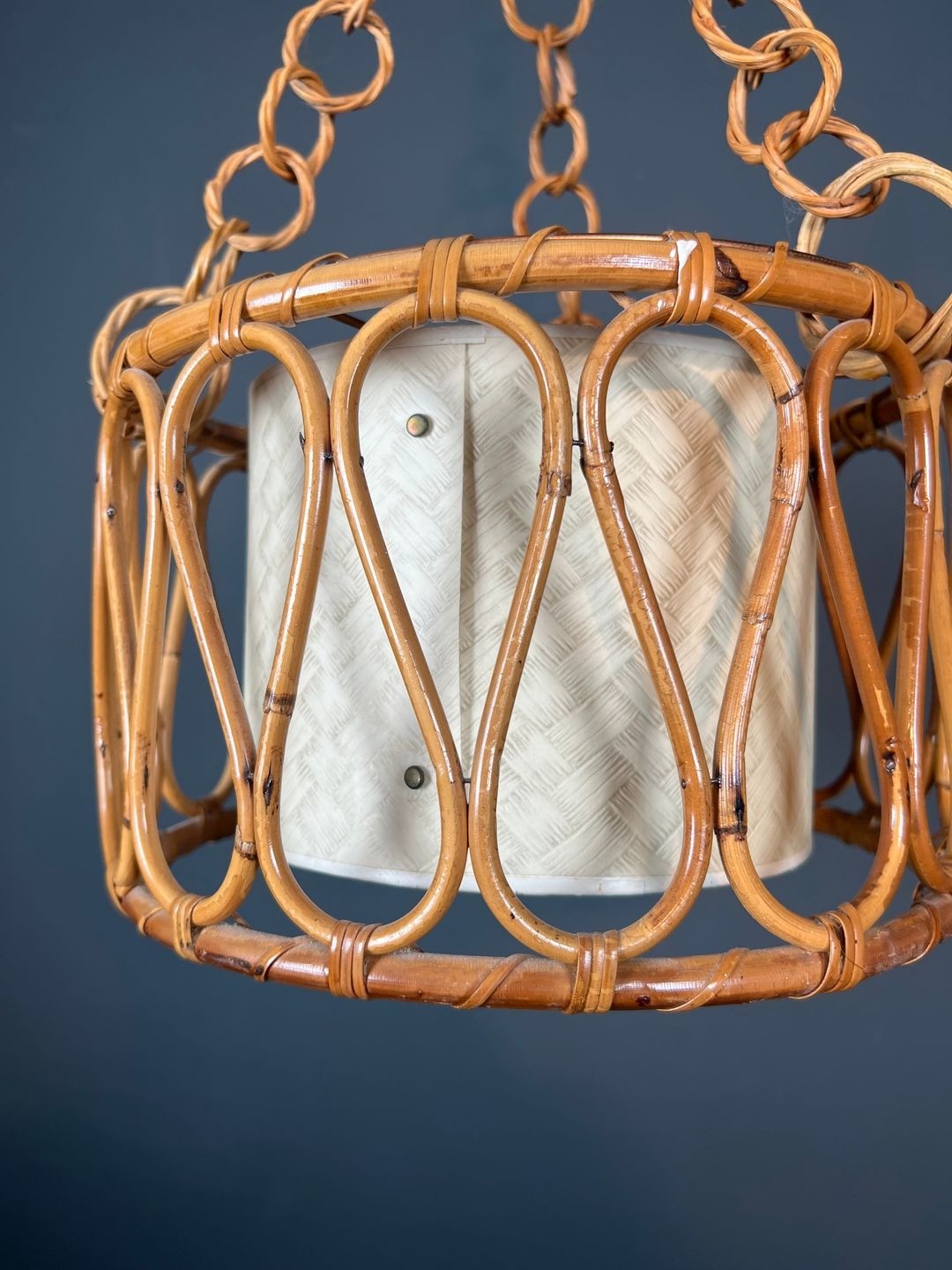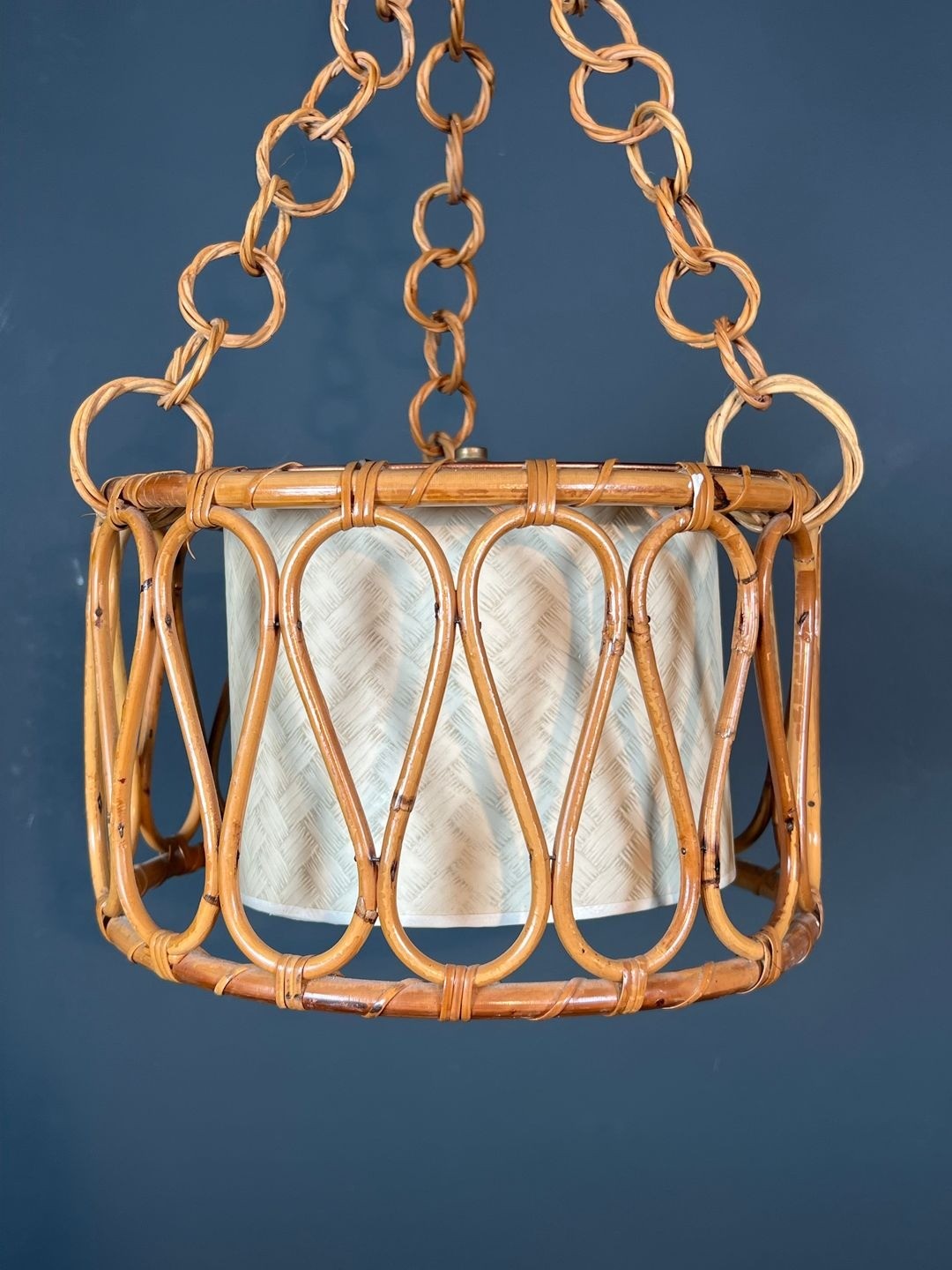 Chandeliers in the Audoux-Minet manner are rarer on the market than their table lamps or floor lamps, partly because the practical challenges of working rattan in a suspended format were greater, and partly because fewer were made. This example, with its tight vertical geometry and disciplined woven structure, exemplifies the best qualities of the genre: it is an object in which material and form are in complete agreement, where nothing is superfluous and the beauty lies entirely in the making. A worthy addition to any collection devoted to the organic modernism of mid-twentieth-century France.