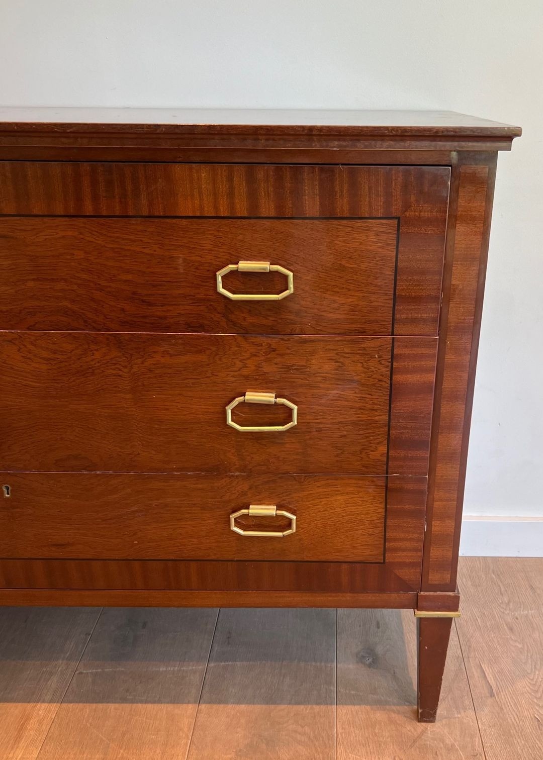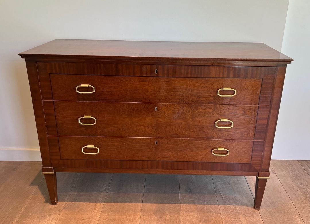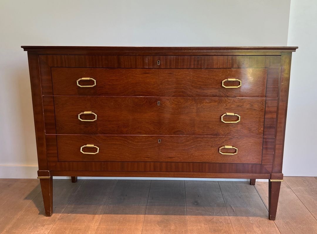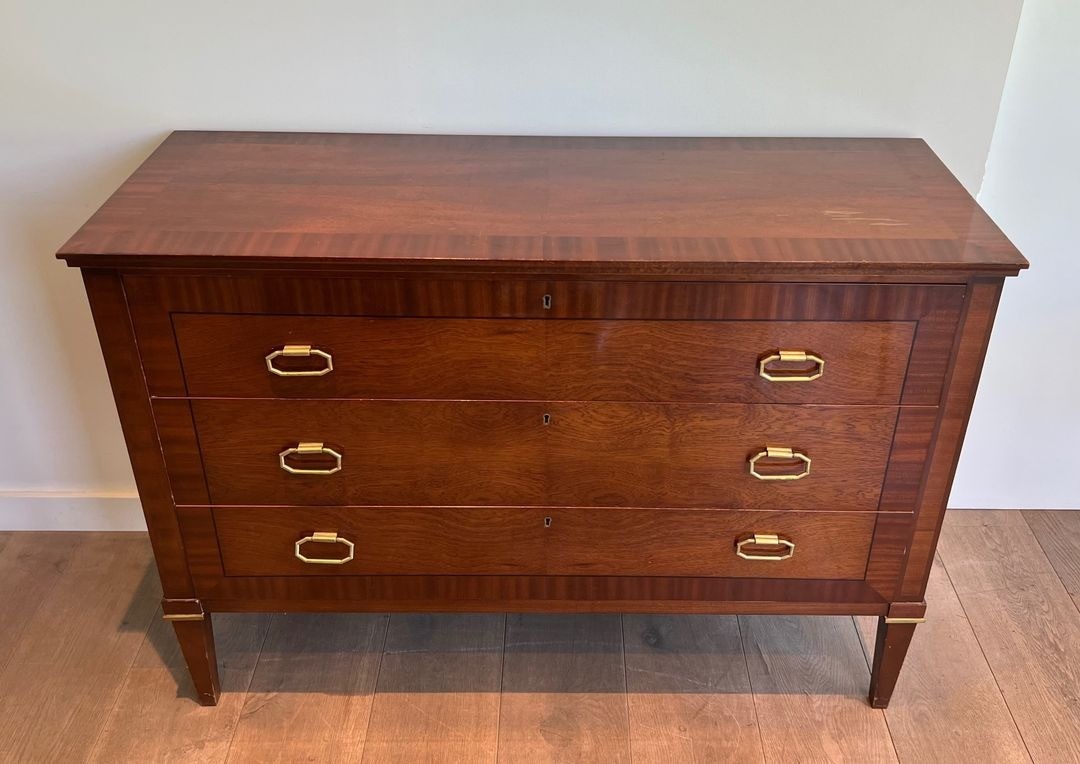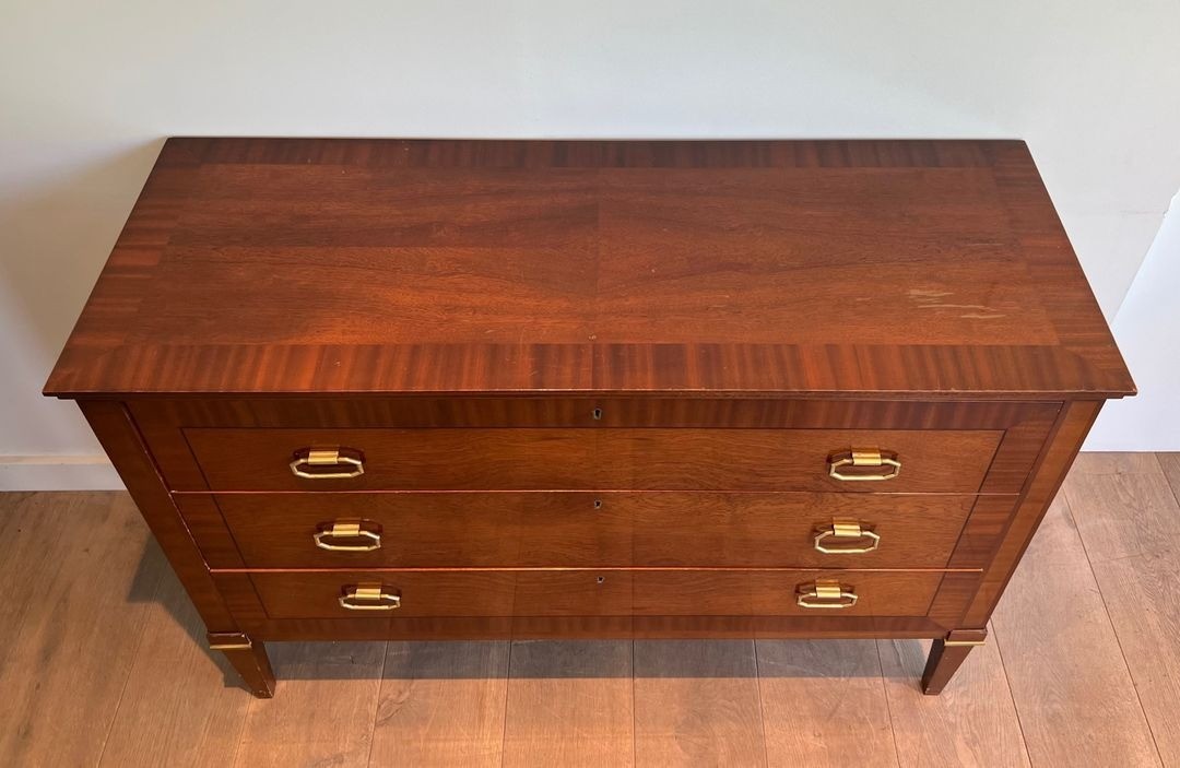 This substantial commode, dressed in closely matched mahogany veneer and detailed with applied brass mouldings at the drawer fronts and base rail, is a characteristic product of the firm’s mature neoclassical vocabulary. The proportions are bold yet precise: the wide carcass of 123.5 cm, paired with a relatively shallow depth of 47 cm, gives the piece the authority of a grand meuble without encroaching on the room. The brass accents — reeded mouldings, ring pulls, and escutcheons — are handled with a restraint that speaks of the post-war paring-back of ornament: decoration enough to confer distinction, never at the expense of the underlying structural clarity.