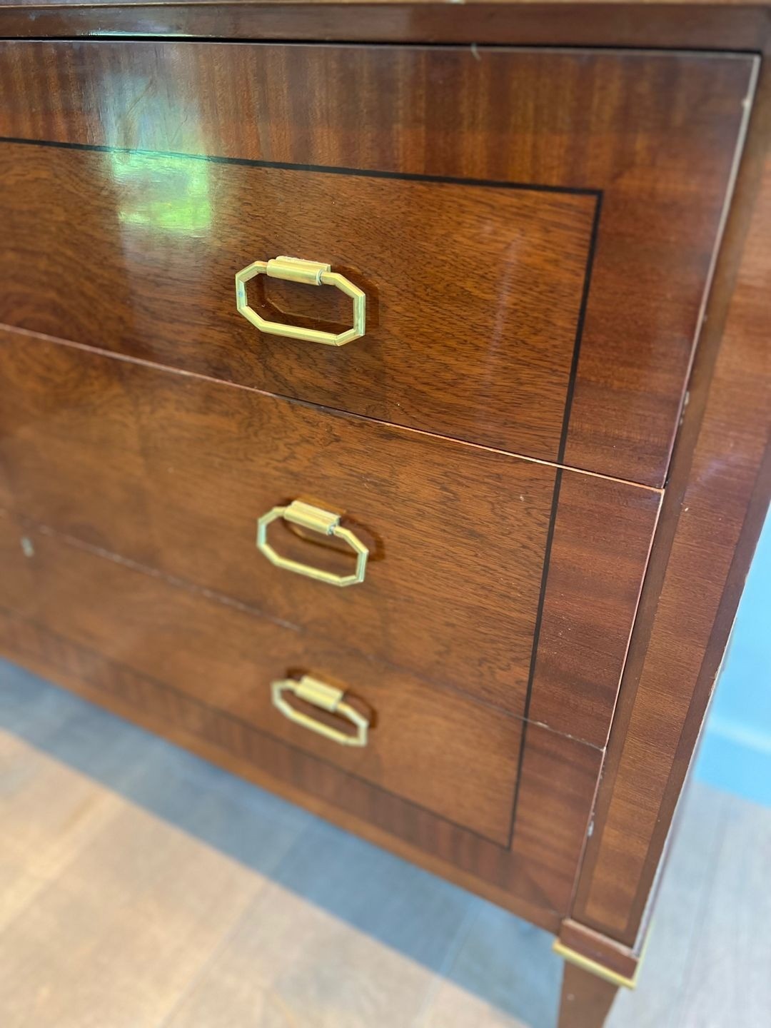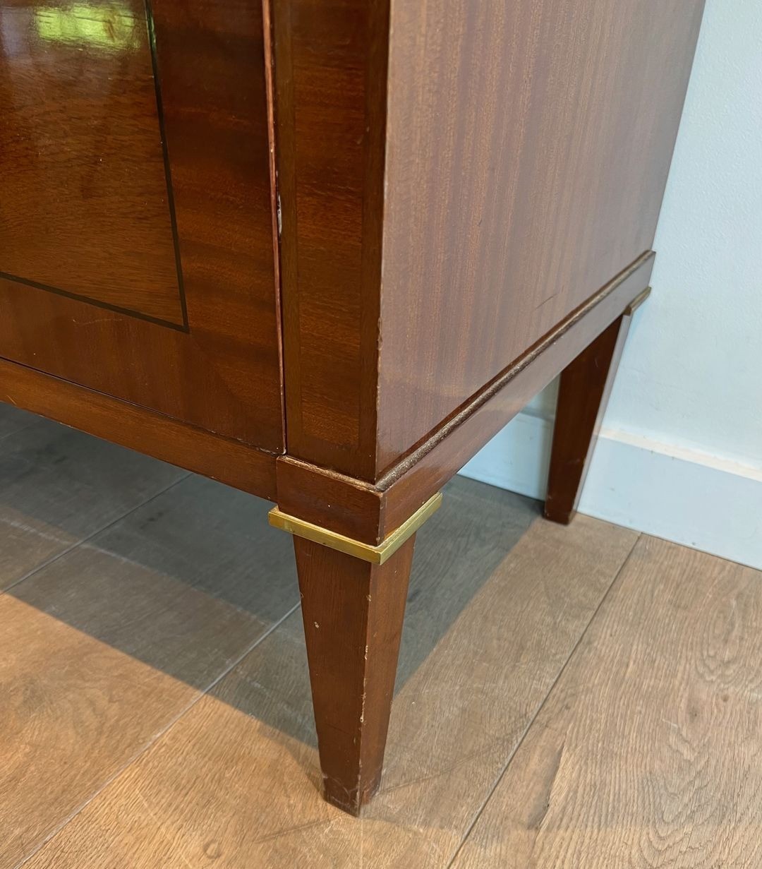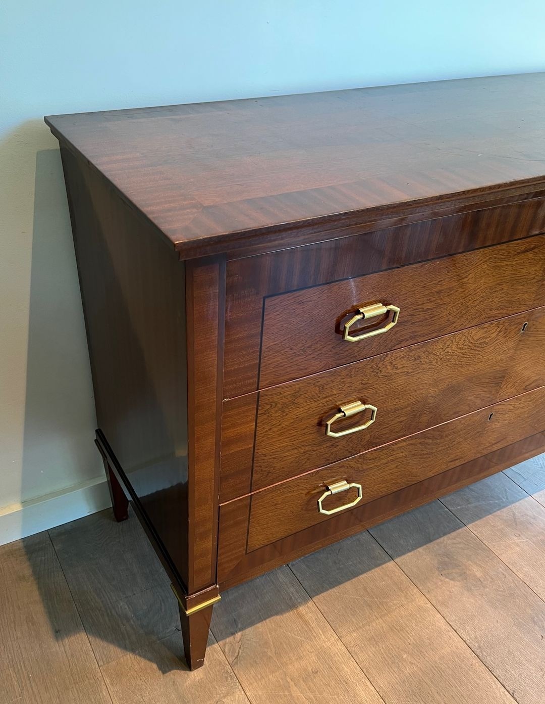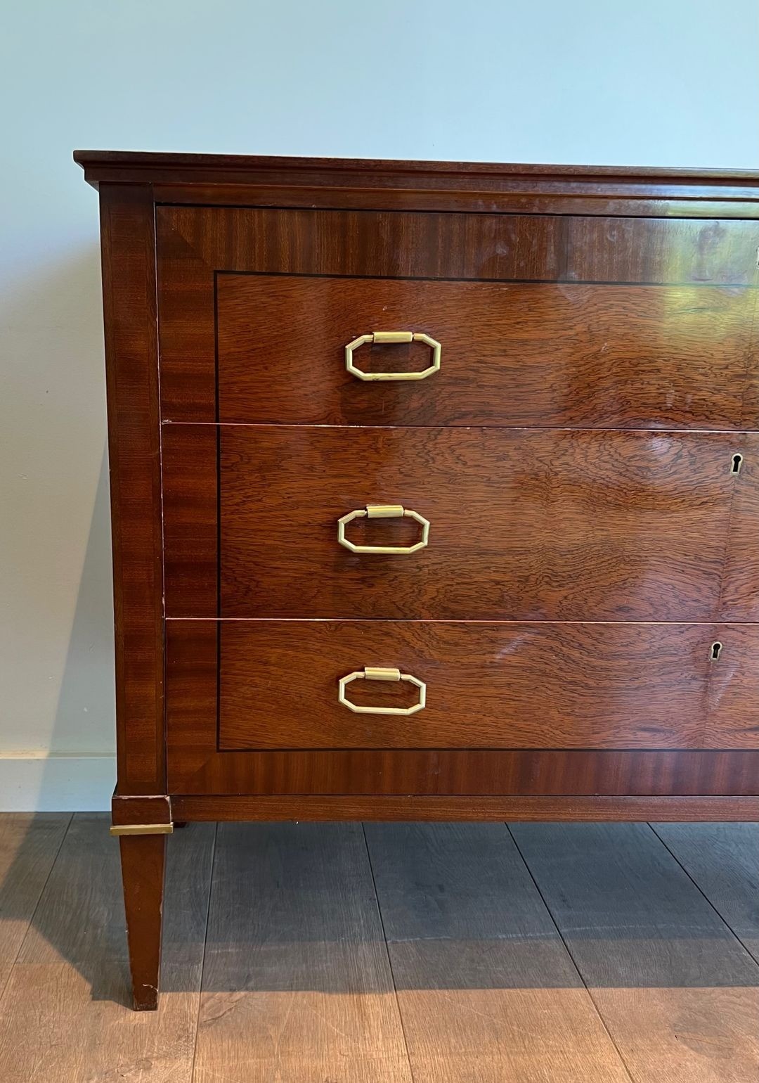 This substantial commode, dressed in closely matched mahogany veneer and detailed with applied brass mouldings at the drawer fronts and base rail, is a characteristic product of the firm’s mature neoclassical vocabulary. The proportions are bold yet precise: the wide carcass of 123.5 cm, paired with a relatively shallow depth of 47 cm, gives the piece the authority of a grand meuble without encroaching on the room. The brass accents — reeded mouldings, ring pulls, and escutcheons — are handled with a restraint that speaks of the post-war paring-back of ornament: decoration enough to confer distinction, never at the expense of the underlying structural clarity.