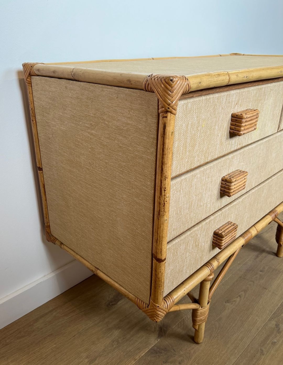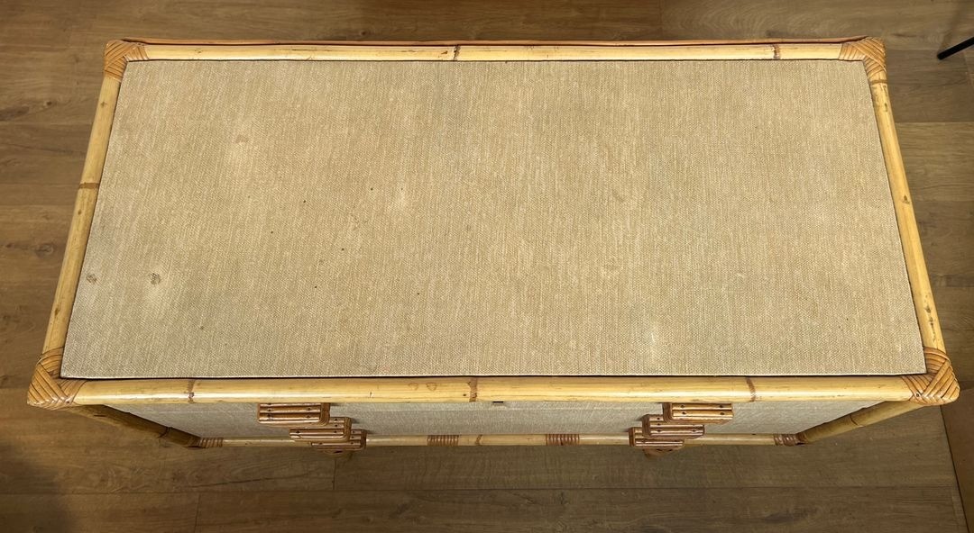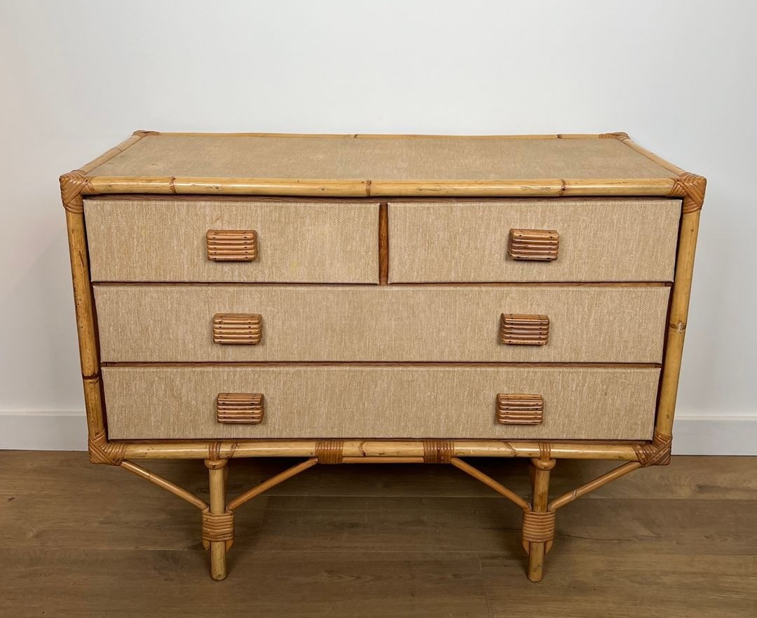 This chest of drawers is a testament to that larger vision. Built from bamboo, rattan, solid wood, and raffia — the same quartet of materials that animates their most celebrated lighting designs — it brings the Audoux-Minet vocabulary into the realm of case furniture. The bamboo frame provides structural rigidity, the rattan weave animates the drawer fronts and side panels with texture and rhythm, while raffia bindings at the joints give the piece the handmade intimacy that distinguishes Audoux-Minet from the sleek certainties of contemporary industrial design. At 101.5 cm wide, the commode carries a presence fully appropriate to a principal room.