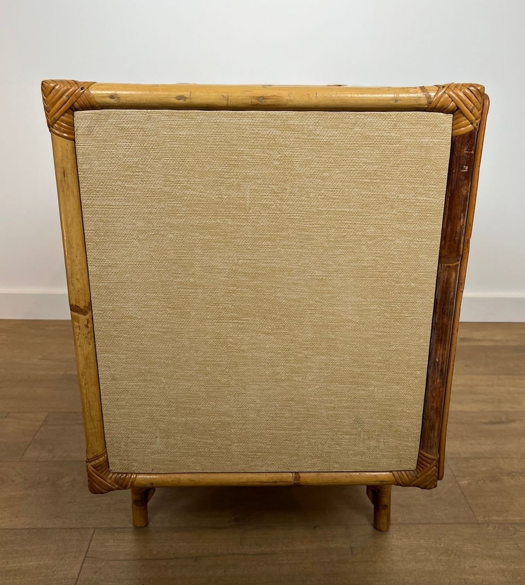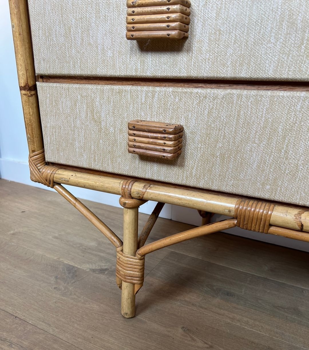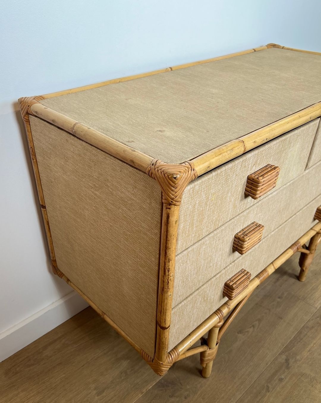 This chest of drawers is a testament to that larger vision. Built from bamboo, rattan, solid wood, and raffia — the same quartet of materials that animates their most celebrated lighting designs — it brings the Audoux-Minet vocabulary into the realm of case furniture. The bamboo frame provides structural rigidity, the rattan weave animates the drawer fronts and side panels with texture and rhythm, while raffia bindings at the joints give the piece the handmade intimacy that distinguishes Audoux-Minet from the sleek certainties of contemporary industrial design. At 101.5 cm wide, the commode carries a presence fully appropriate to a principal room.
