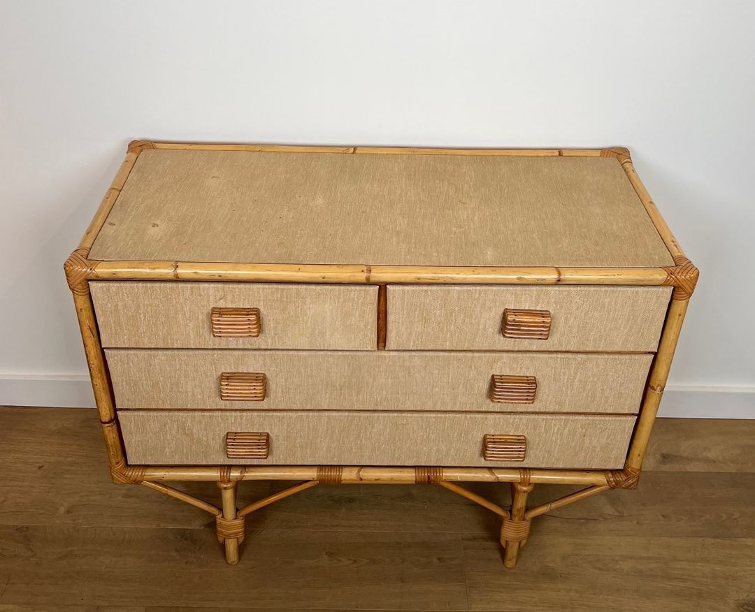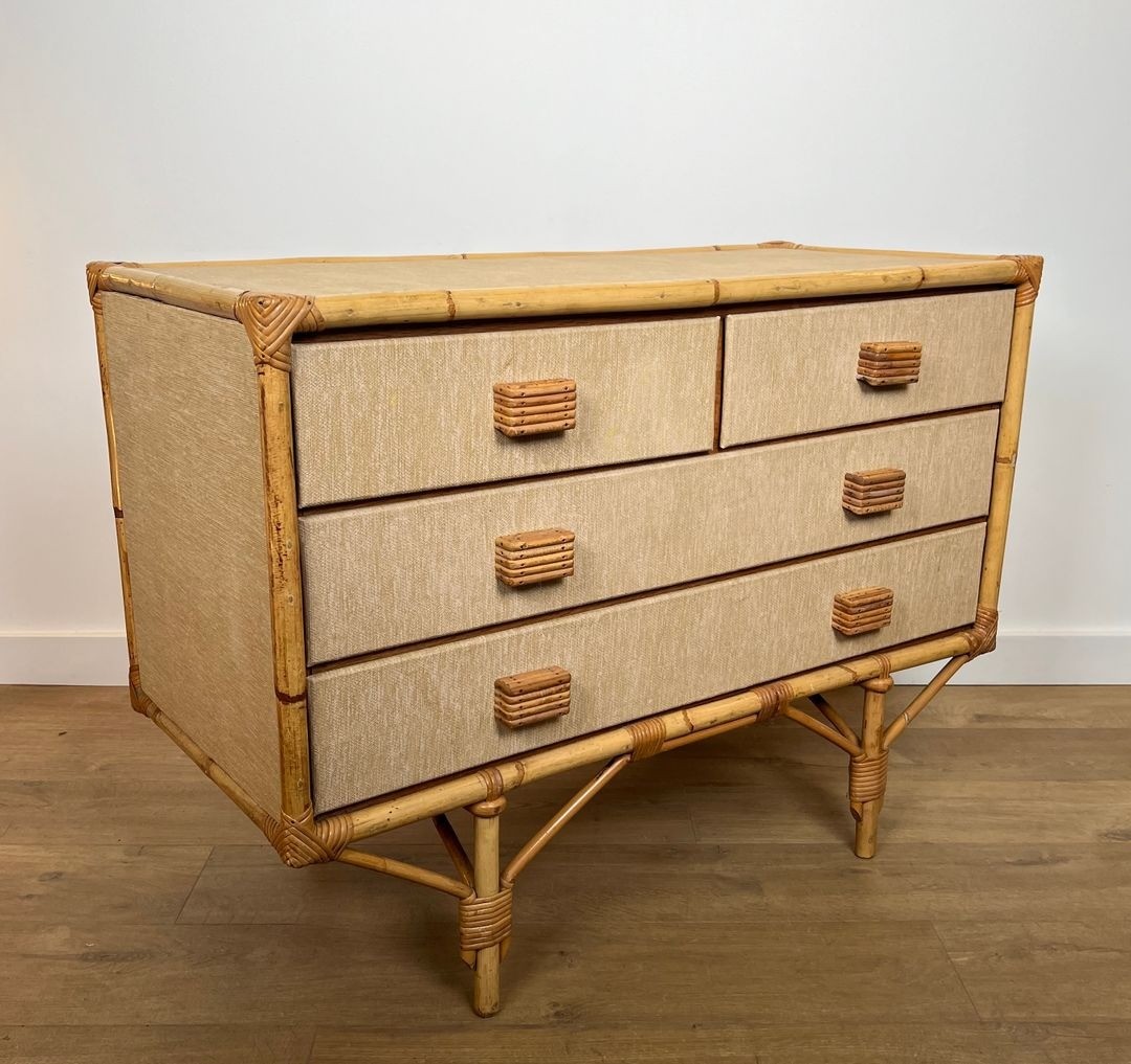 Bamboo, Rattan, Wood and Raffia Chest of Drawers, Audoux-Minet, France, circa 1950