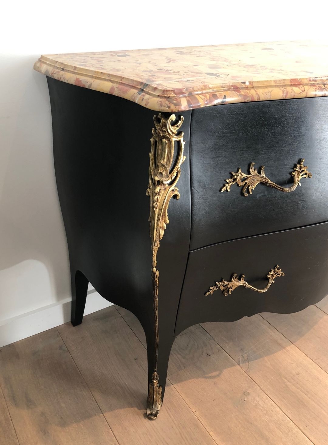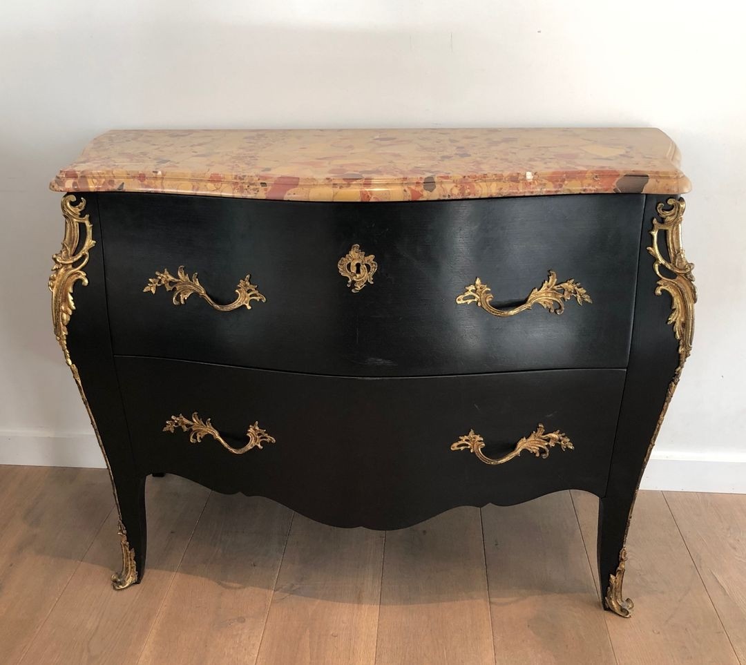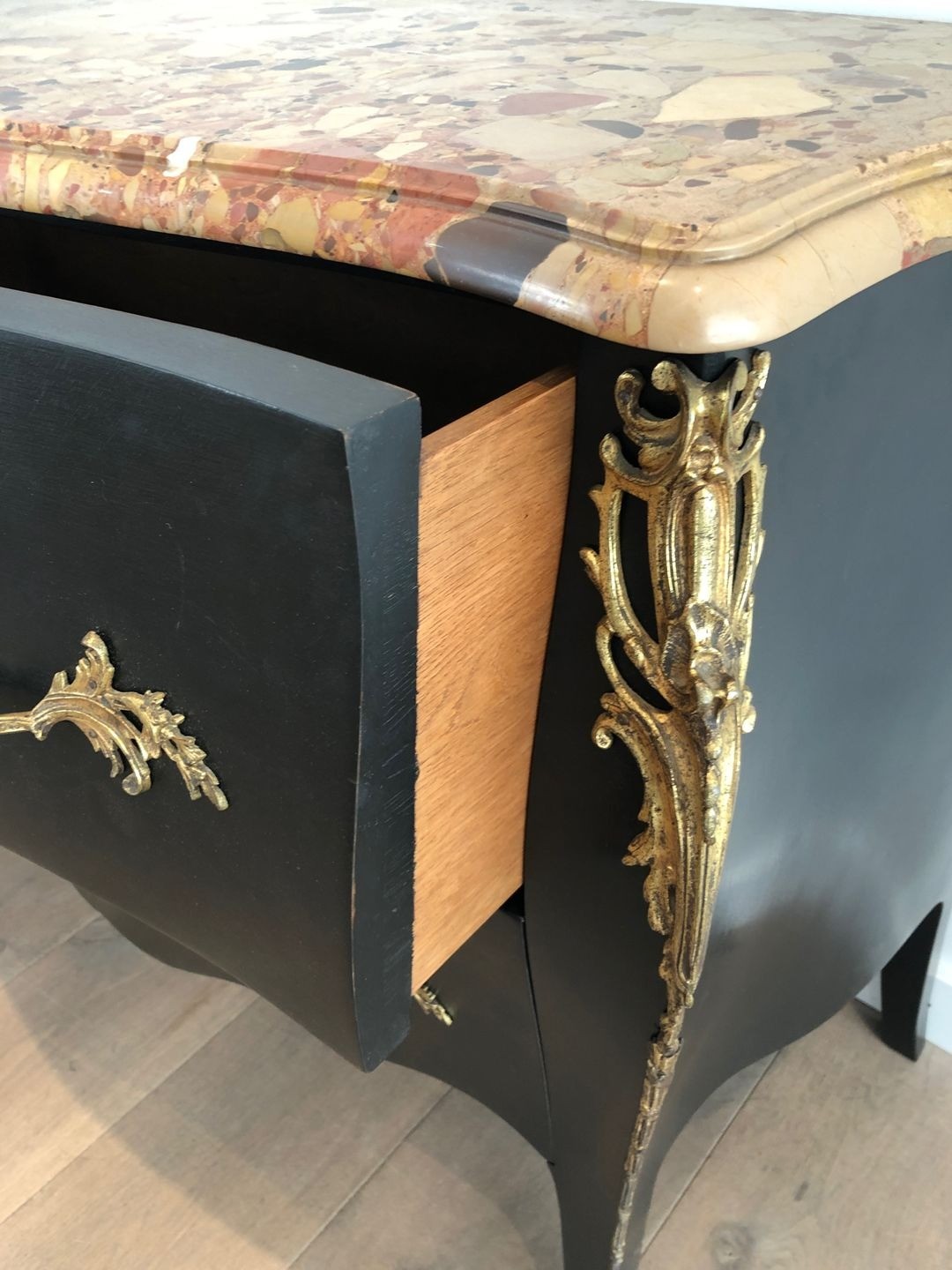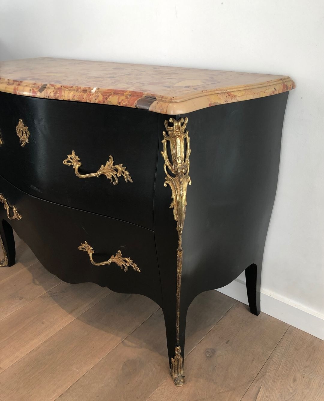 This curved commode bears the De Beyne stamp and exemplifies the style in its most accomplished expression. The gently bowed form — 118 centimetres wide and 87 centimetres tall — gives the piece its fluid, organic quality, while the ebonized finish provides the dark, mysterious ground against which the bronze mounts glow warmly. A marble top crowns the composition, adding a note of cool luxury to the ensemble.