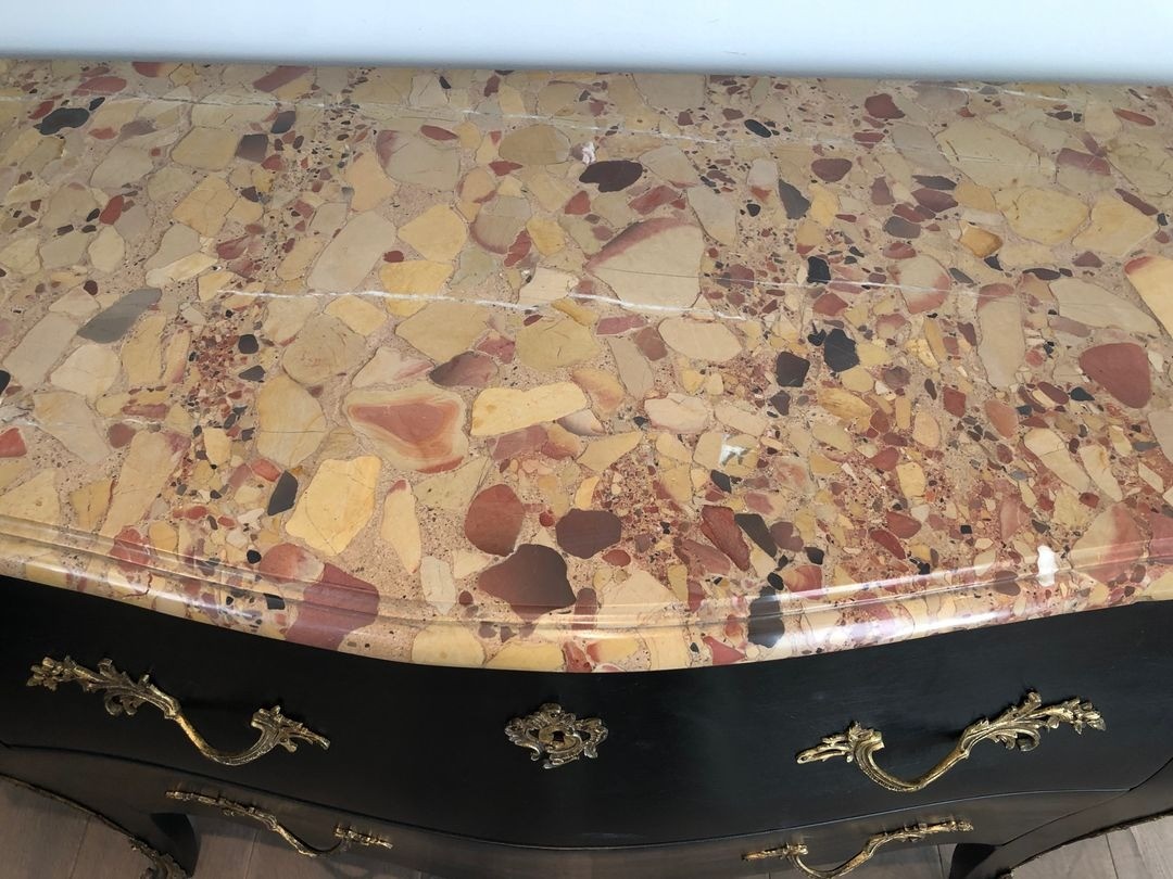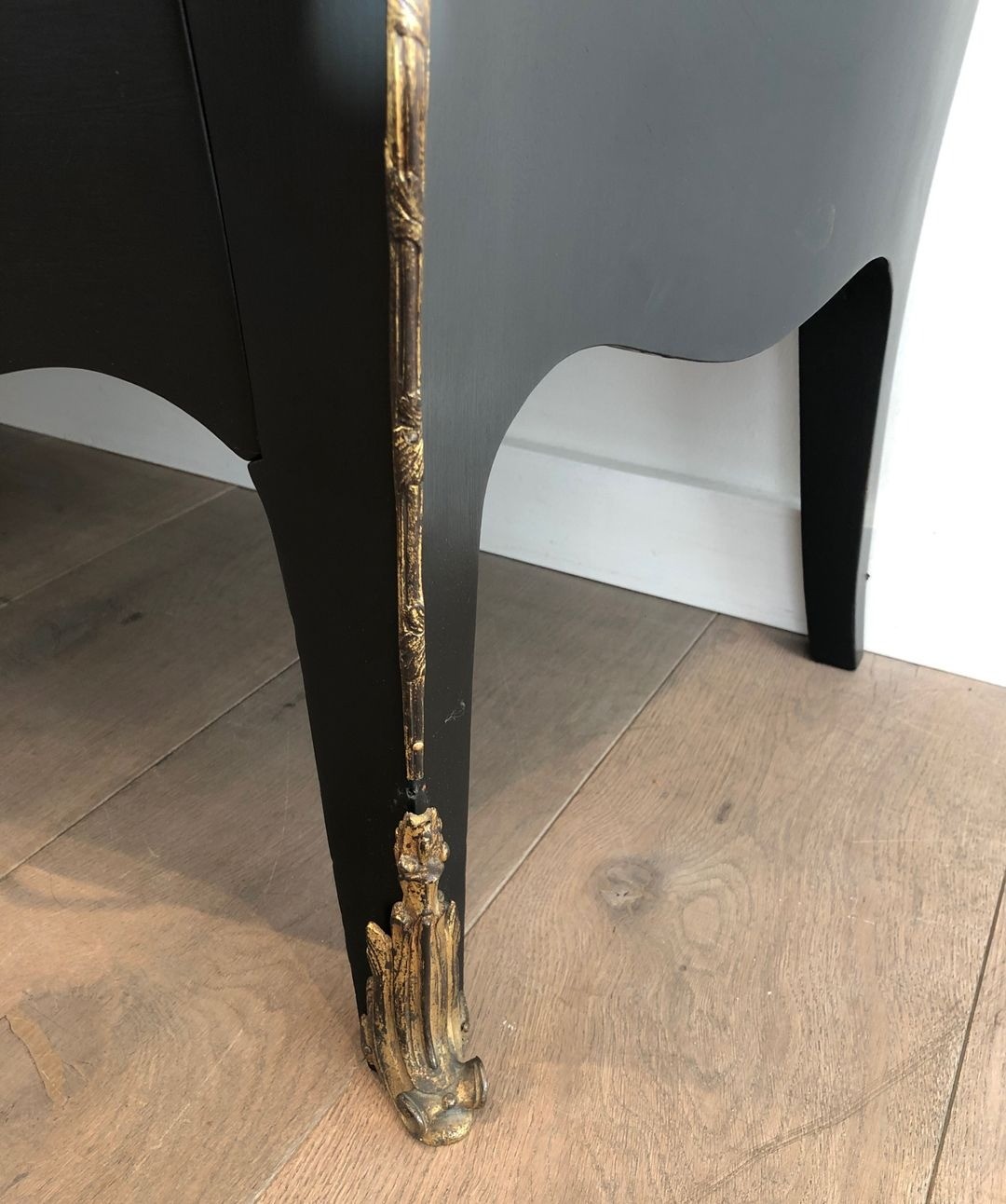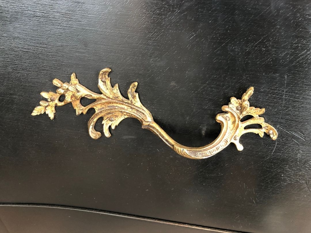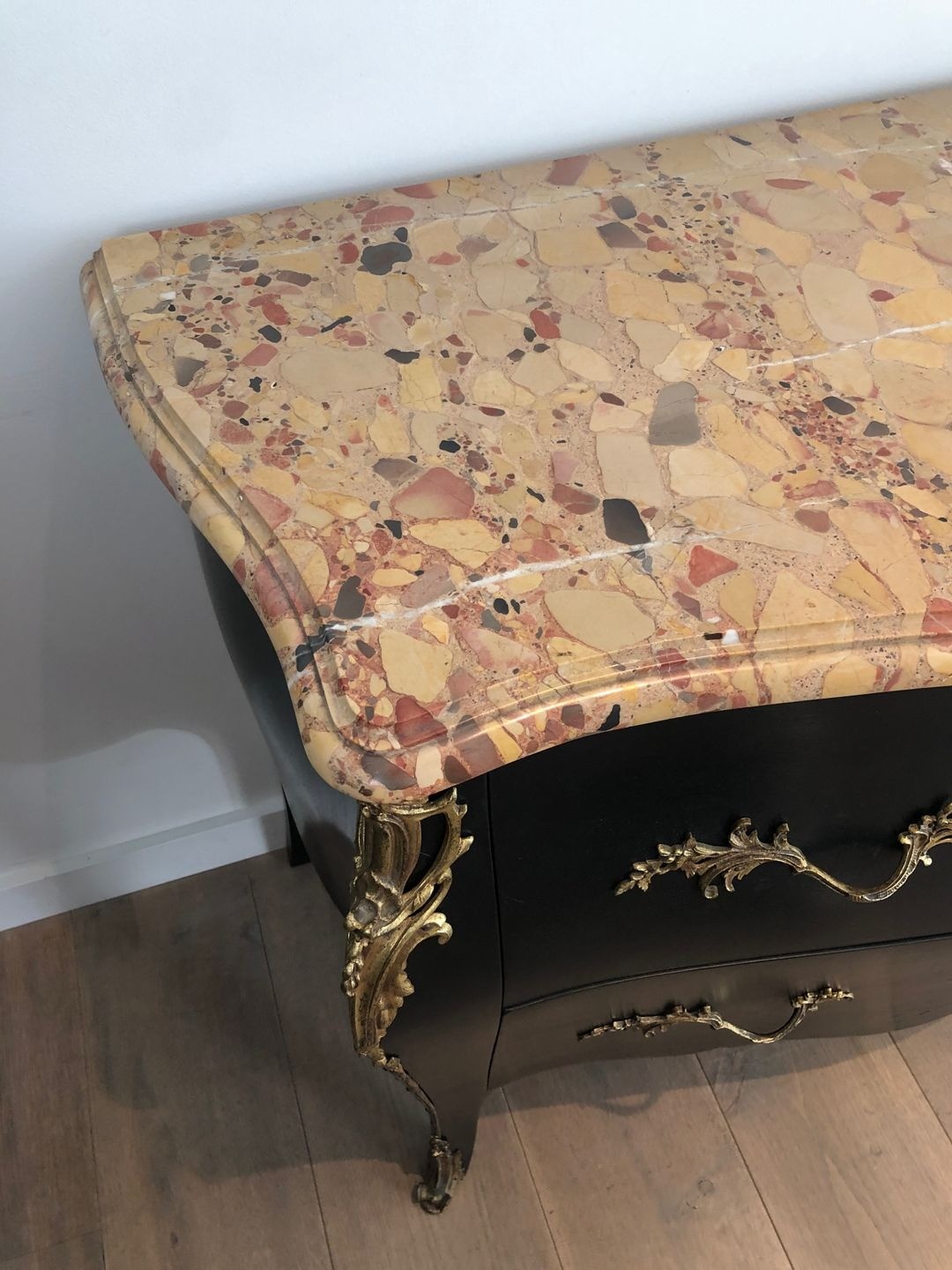 This curved commode bears the De Beyne stamp and exemplifies the style in its most accomplished expression. The gently bowed form — 118 centimetres wide and 87 centimetres tall — gives the piece its fluid, organic quality, while the ebonized finish provides the dark, mysterious ground against which the bronze mounts glow warmly. A marble top crowns the composition, adding a note of cool luxury to the ensemble.