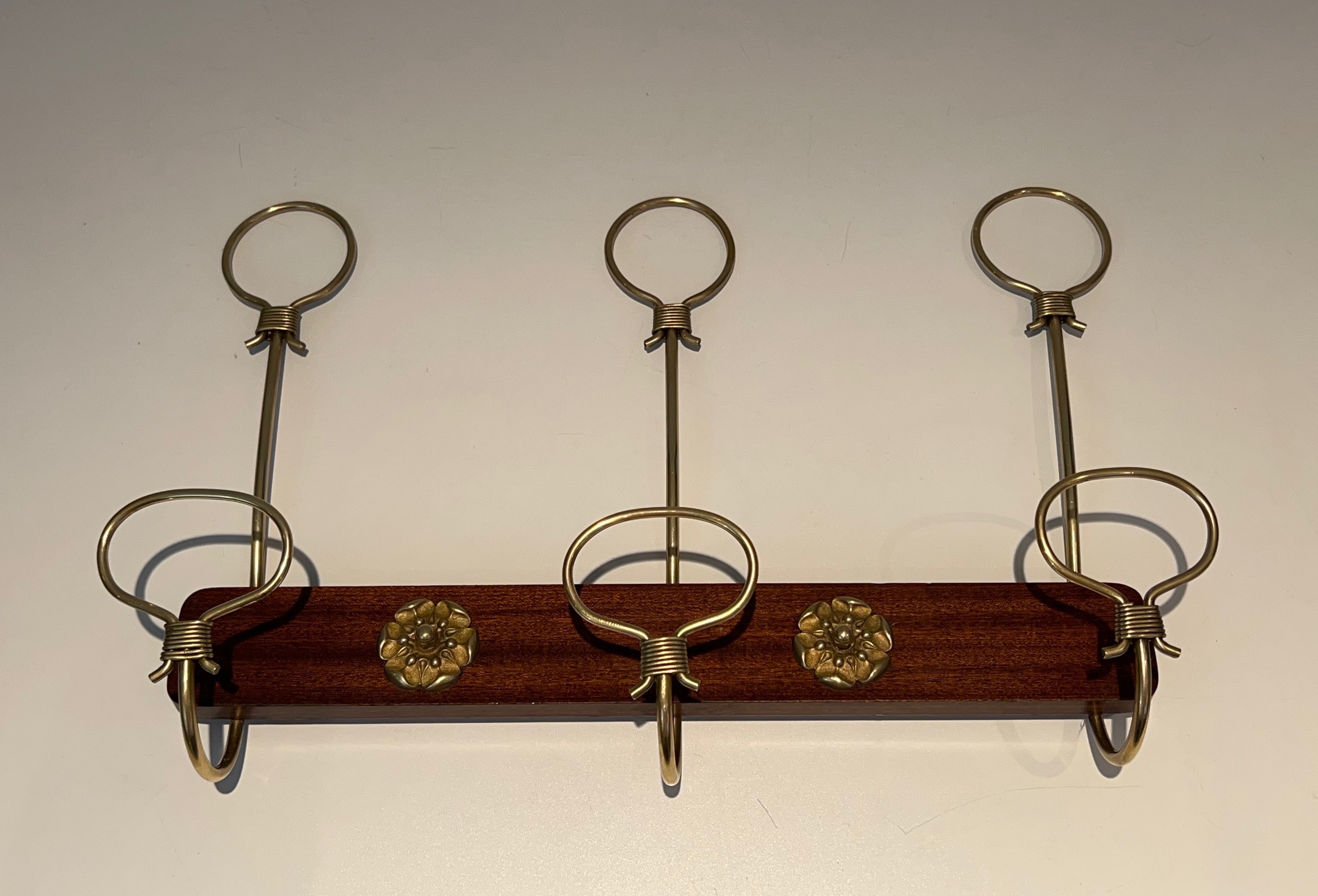 This wall-mounted coat rack in rich mahogany and polished brass exemplifies the refined decorative sensibility of French artisanal production during the interwar period. The warm, deep tones of the mahogany — one of the most prized woods in the French cabinet-making tradition — are elegantly complemented by the glinting brass hooks and fittings, creating a piece that is both functional and aesthetically accomplished. The disciplined design vocabulary, combining the natural warmth of wood with the precision of metalwork, is entirely characteristic of the best French decorative production of the 1940s.