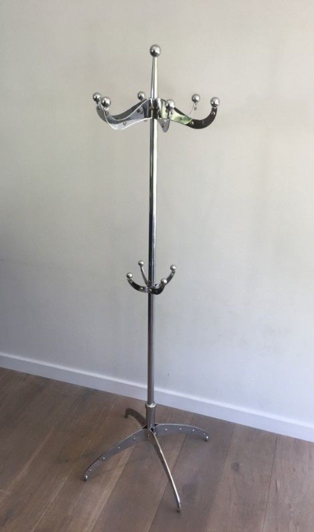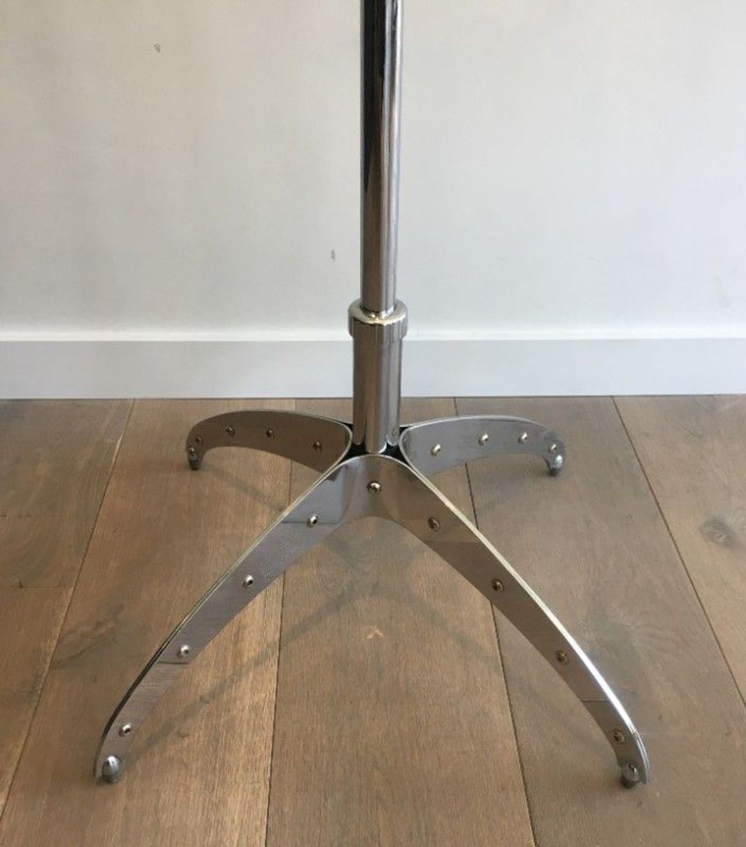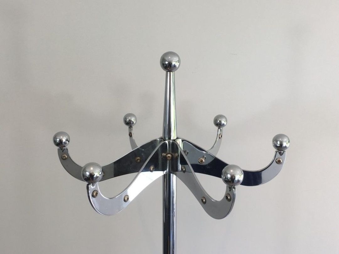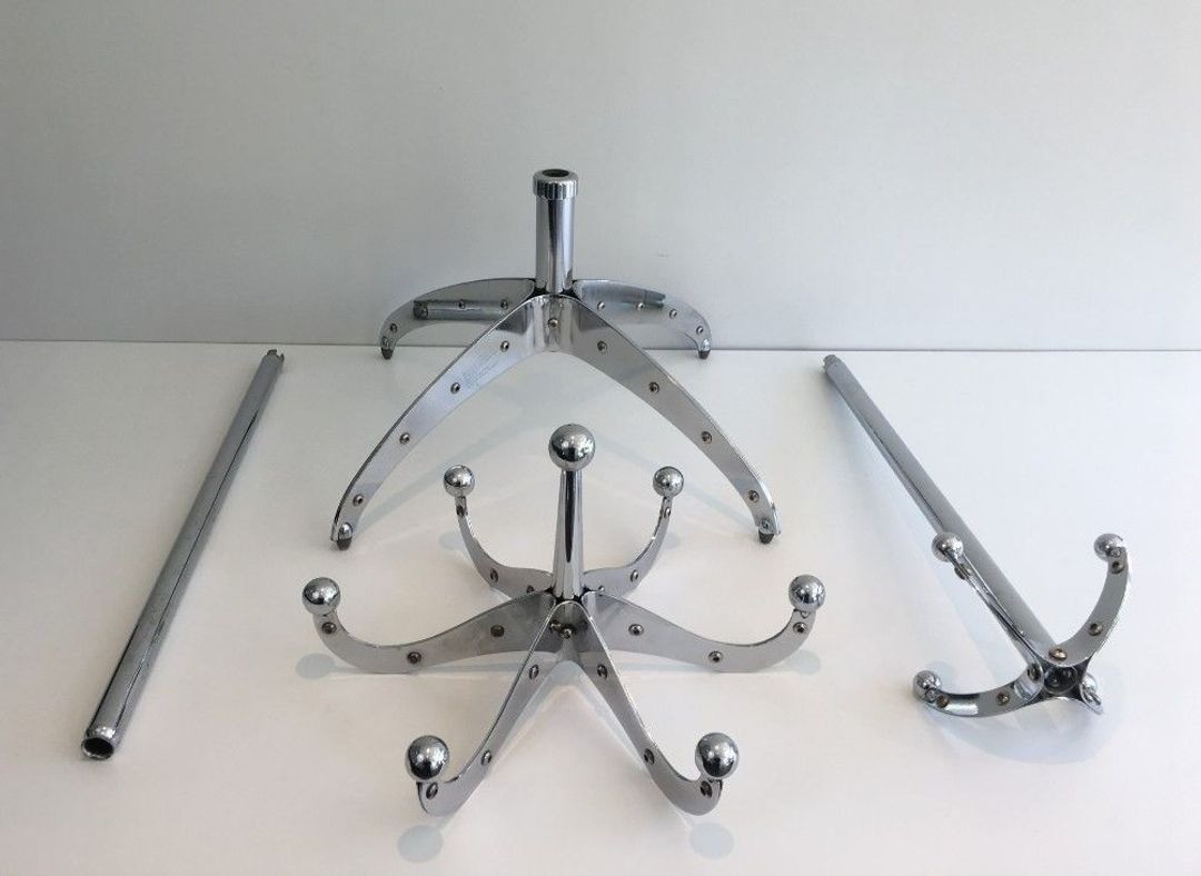 This coat rack exemplifies the Dulton method at its most confident. At 180.5 centimetres tall—almost exactly human height—it commands the entrance hall with the authority of industrial equipment, yet its chromium surfaces are finished to the standard of a luxury object. The rivets that articulate the joints are both structural and declarative: they insist on the language of assembly, of the bolt-and-rivet engineering that built bridges and ships and gasometers, here applied to a domestic coat rack. Chrome, in this context, is not a luxury finish but the coating of the instrument—the bicycle frame, the surgical table, the machine part—elevated from the factory to the foyer without losing any of its original conviction.