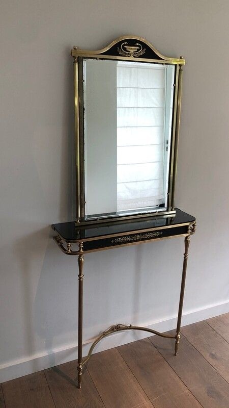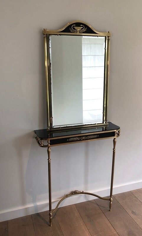 Neoclassical Style Brass and Lacquered Metal Console and Mirror Decorated with Palm Leaves and Swan Necks. French. Circa 1940