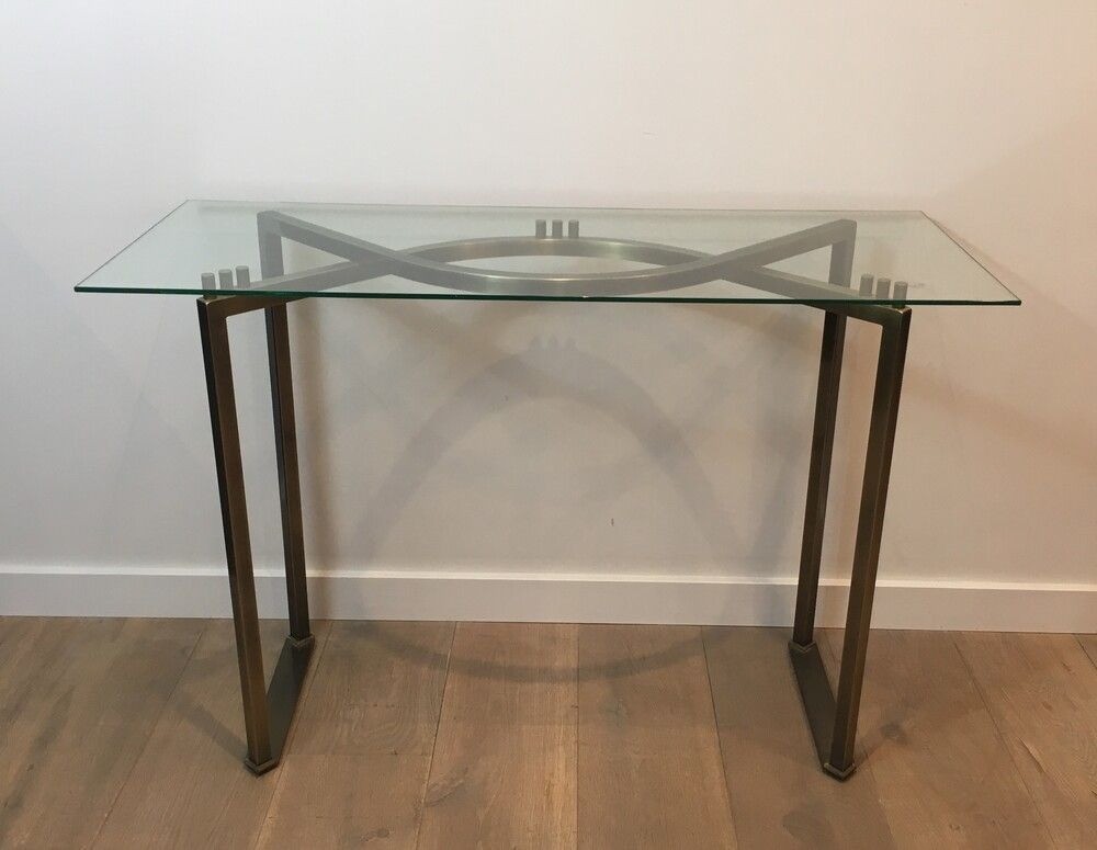 Brushed Steel and Brass Console Table with Glass Shelves. French. Circa 1970