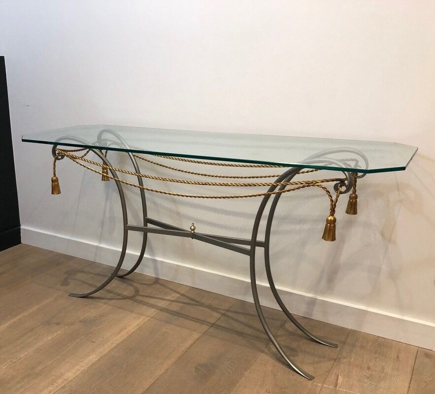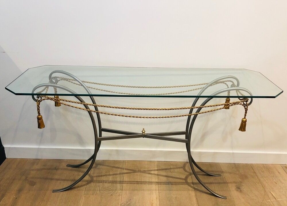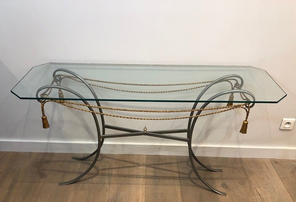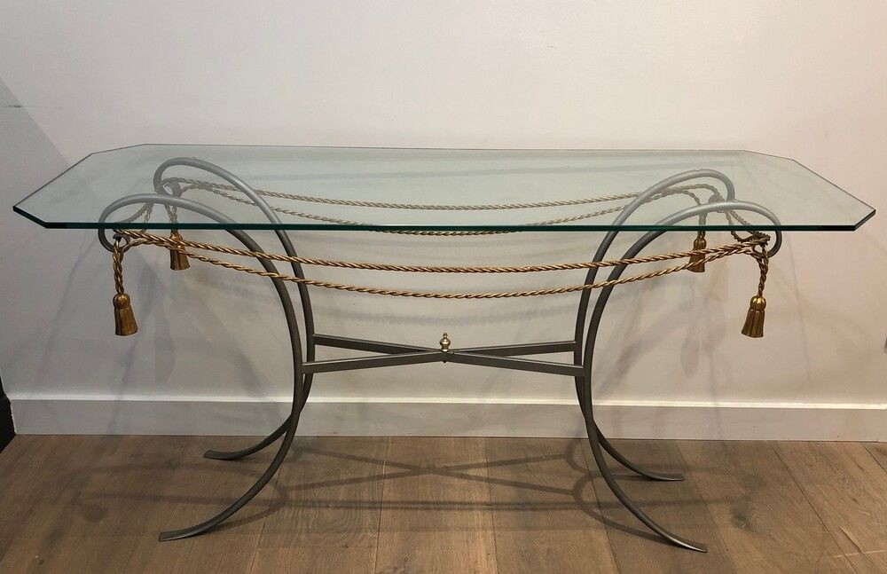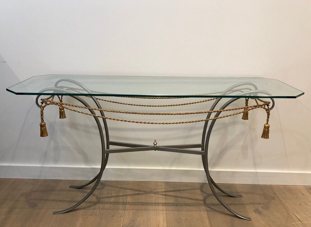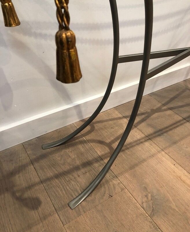 Gun metal console table with gilt metal garlands and pompons and glass top. French work in the style of Coco Chanel. Circa 1970