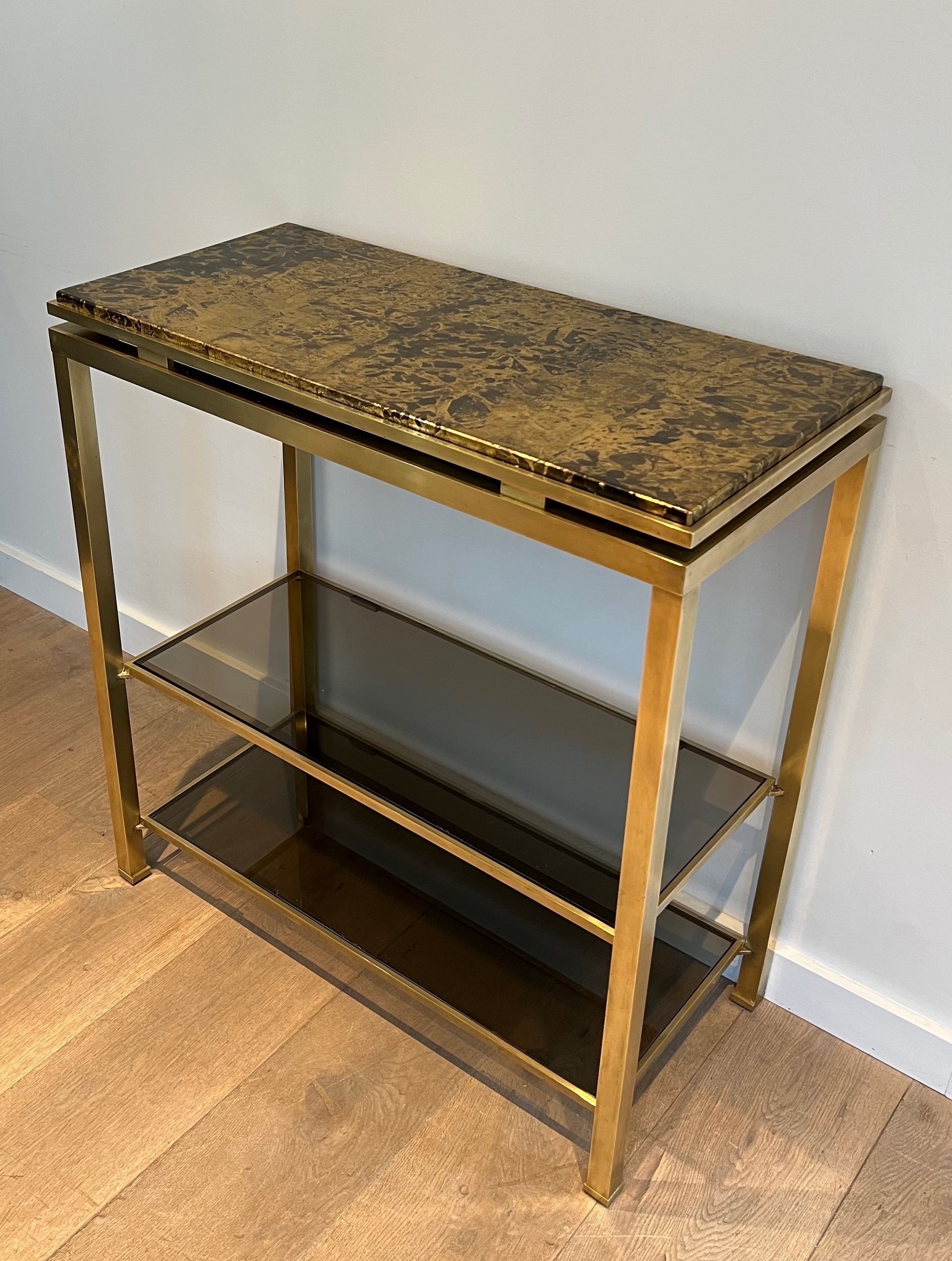 Rare Brass Console Table by Guy Lefèvre for Maison Jansen, Smoked Glass Shelves and Gilt Faux-Marble Top, Circa 1970