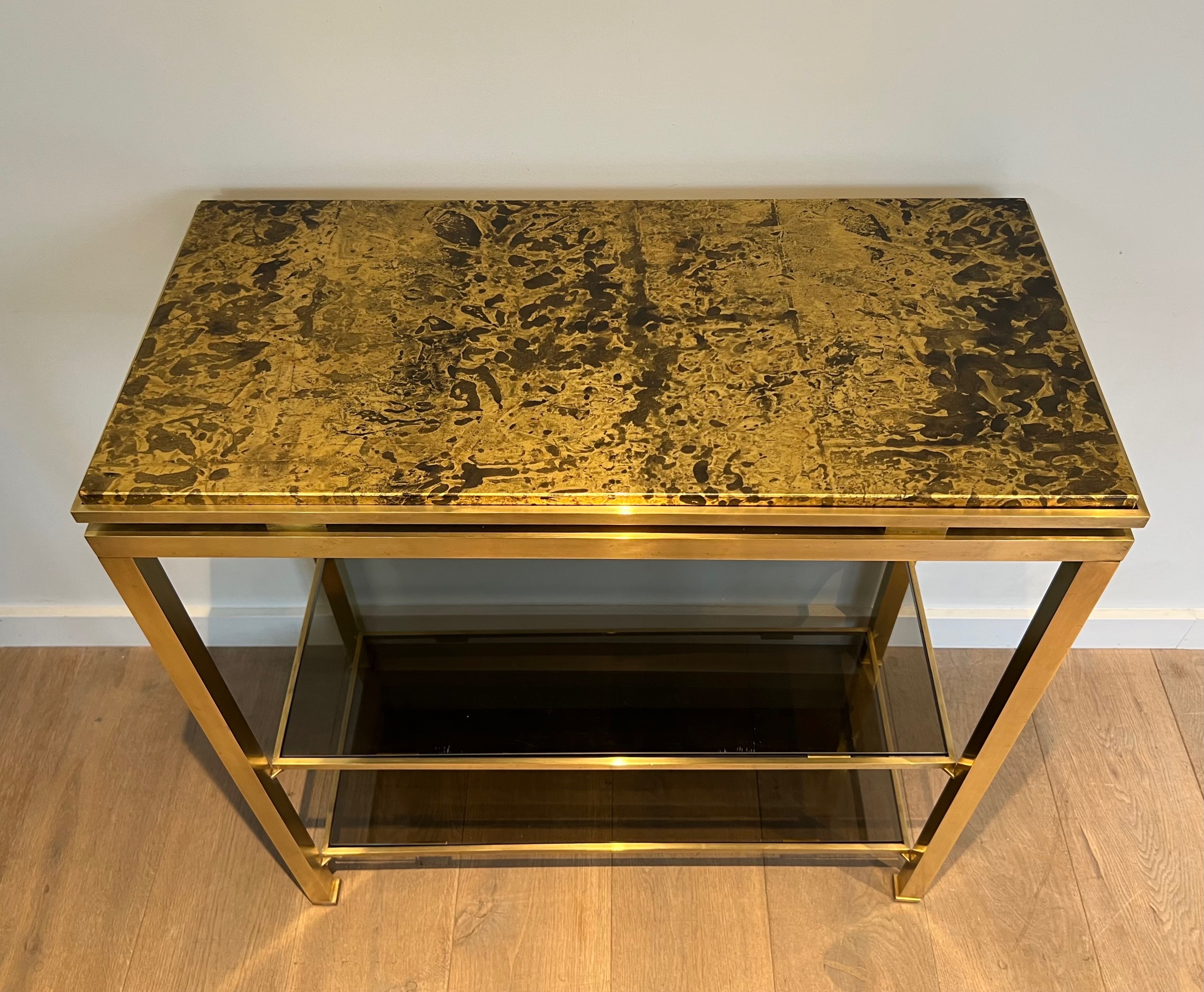 Rare brass console with two smoked glass shelves and gilt top imitating marble. French work by Guy Lefèvre for Maison Jansen. Circa 1970.