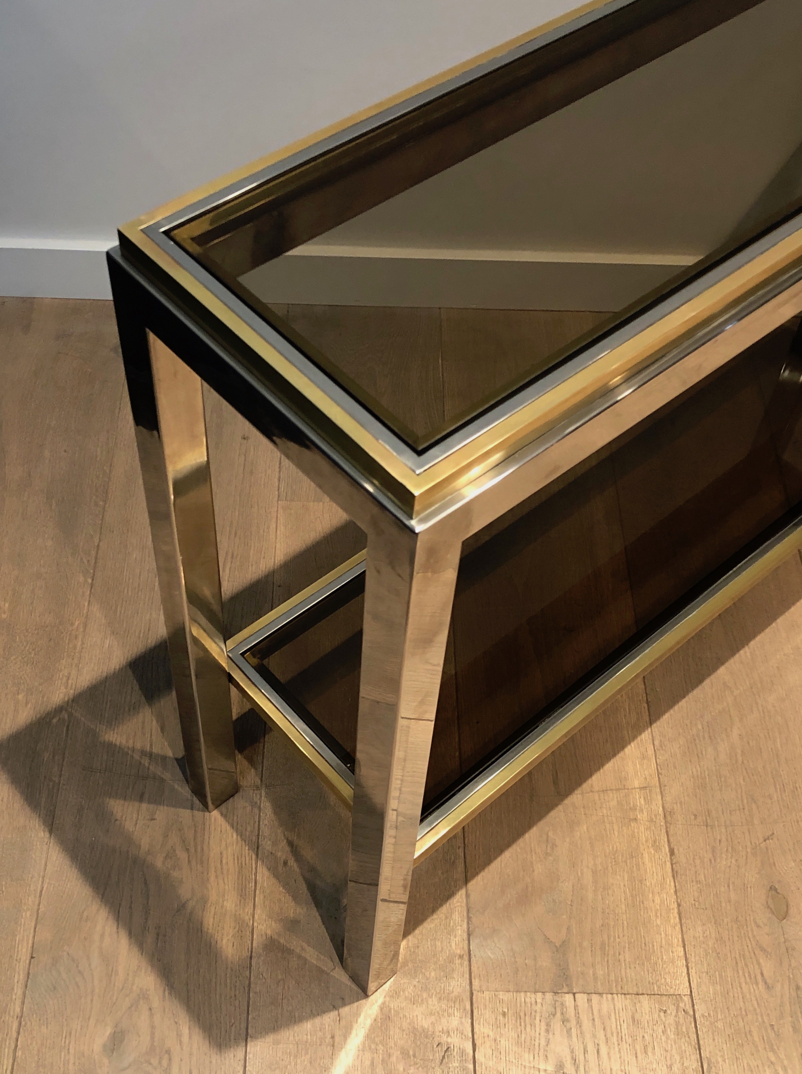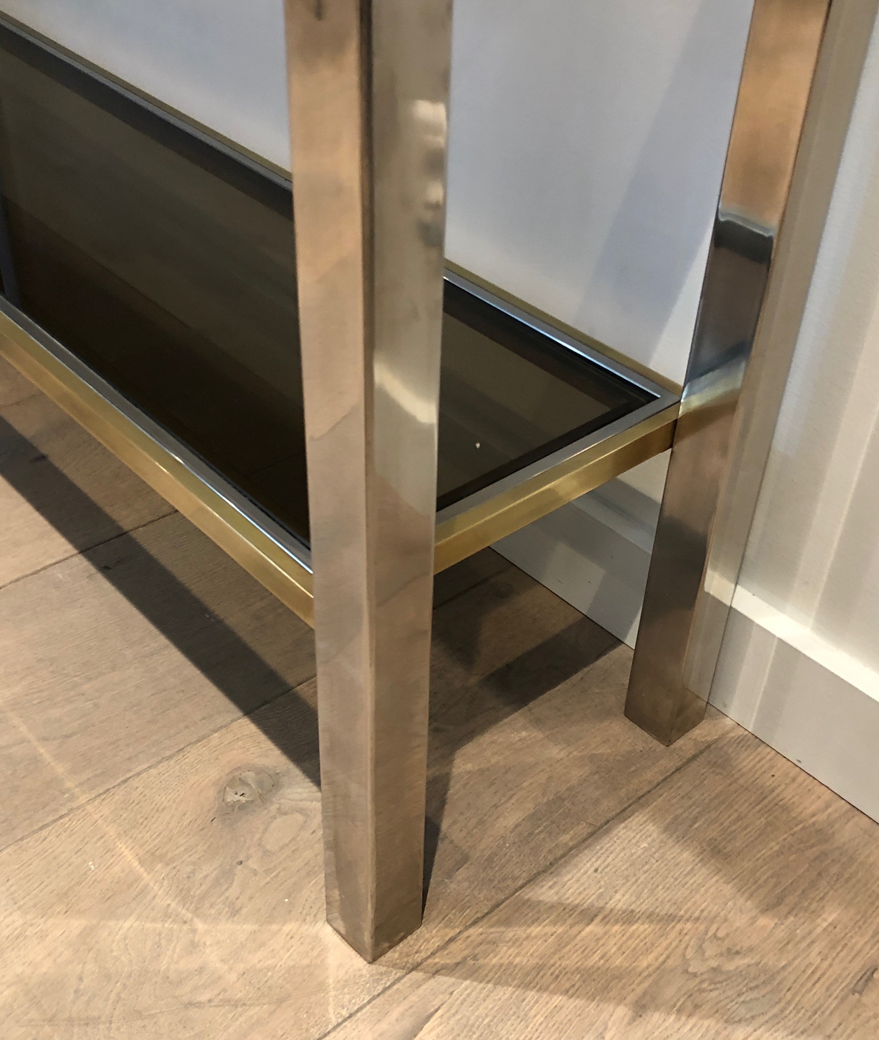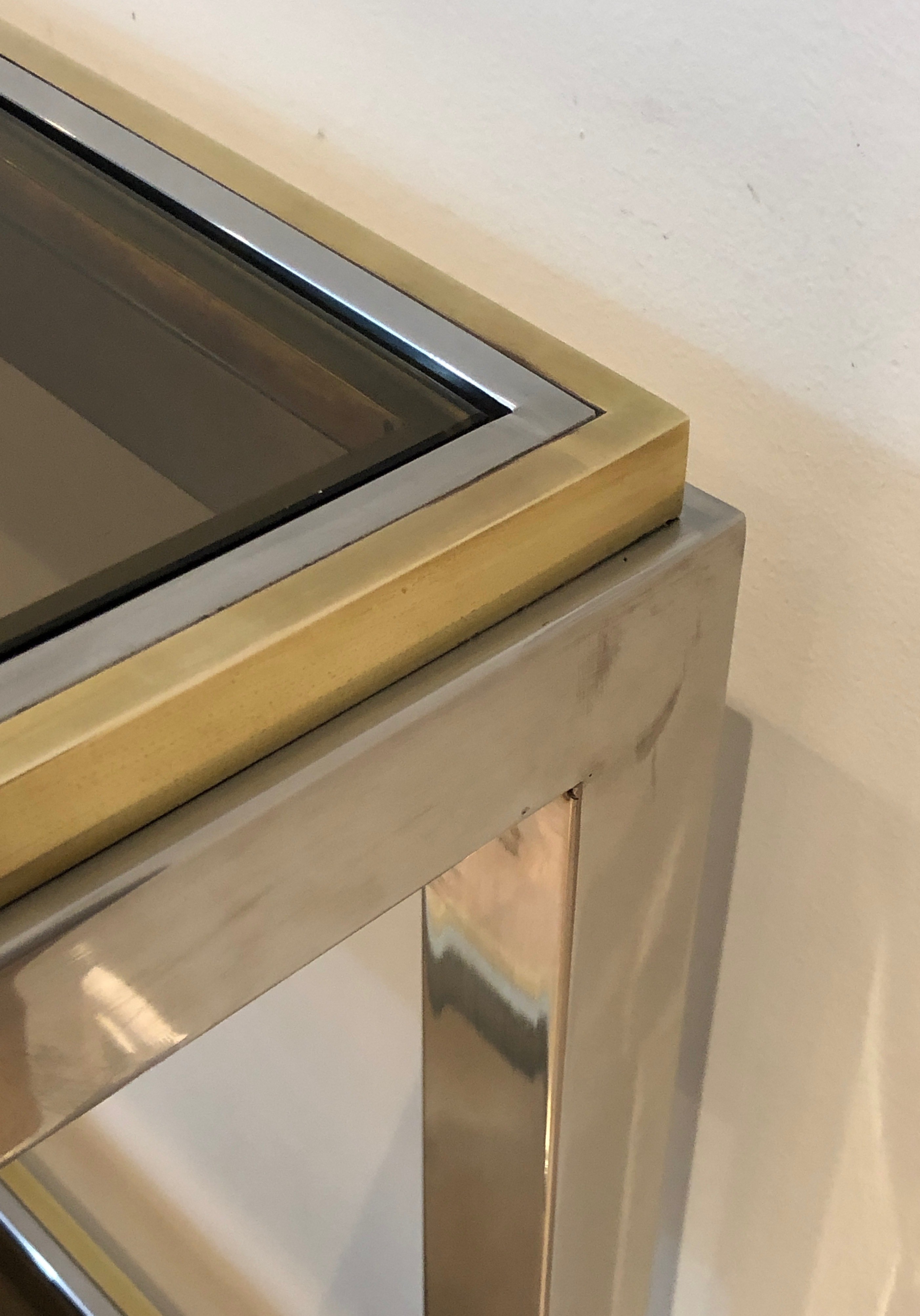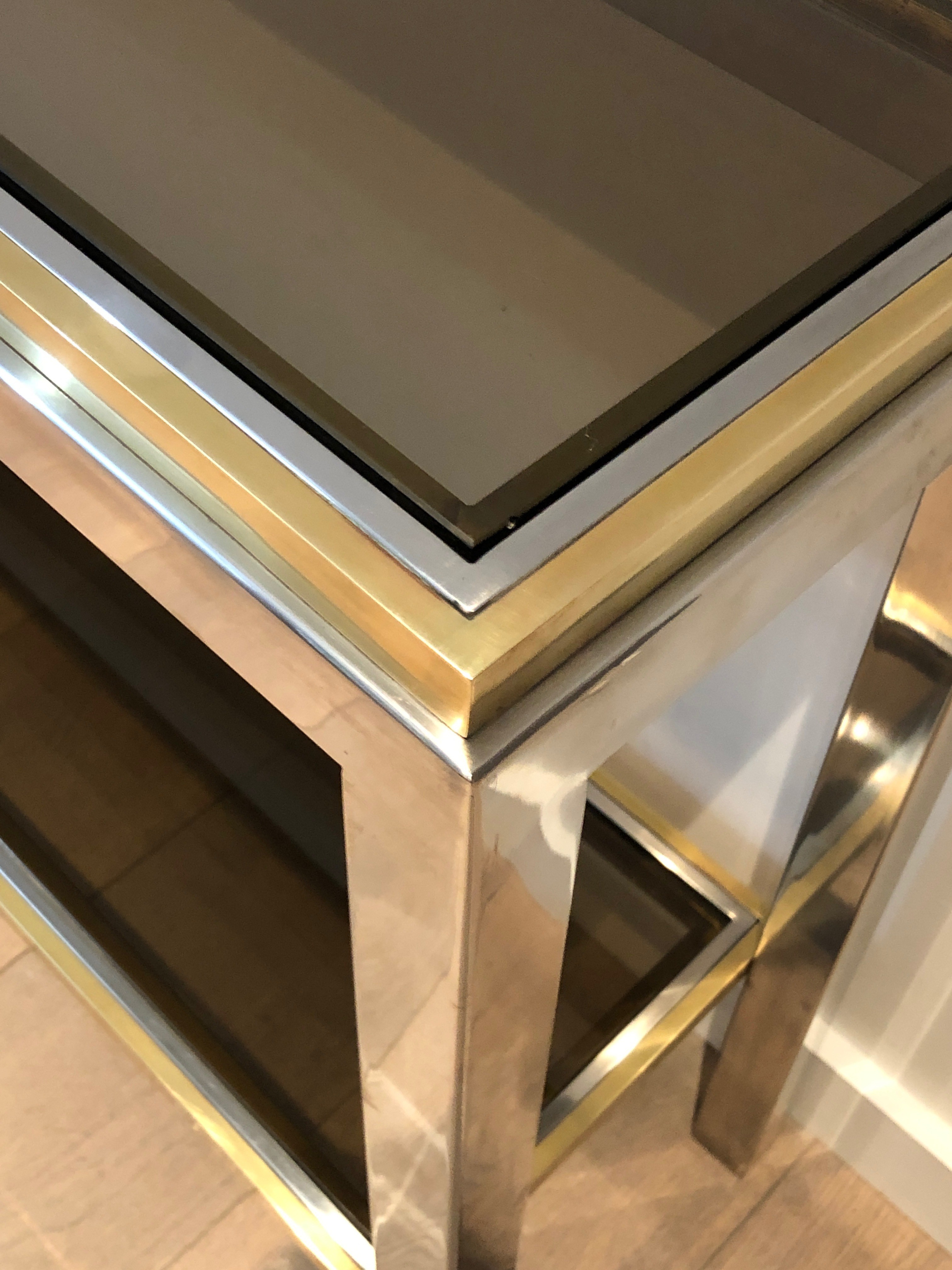 An elegant console table in chrome and polished brass, attributed to the French designer Jean-Charles, presenting the refined geometric aesthetics characteristic of the finest French furnishings of the early 1970s. The interplay of chrome and brass — two metals of contrasting warmth — creates a sophisticated visual tension that speaks to the era's fascination with metallic finishes and architectural forms in furniture design.