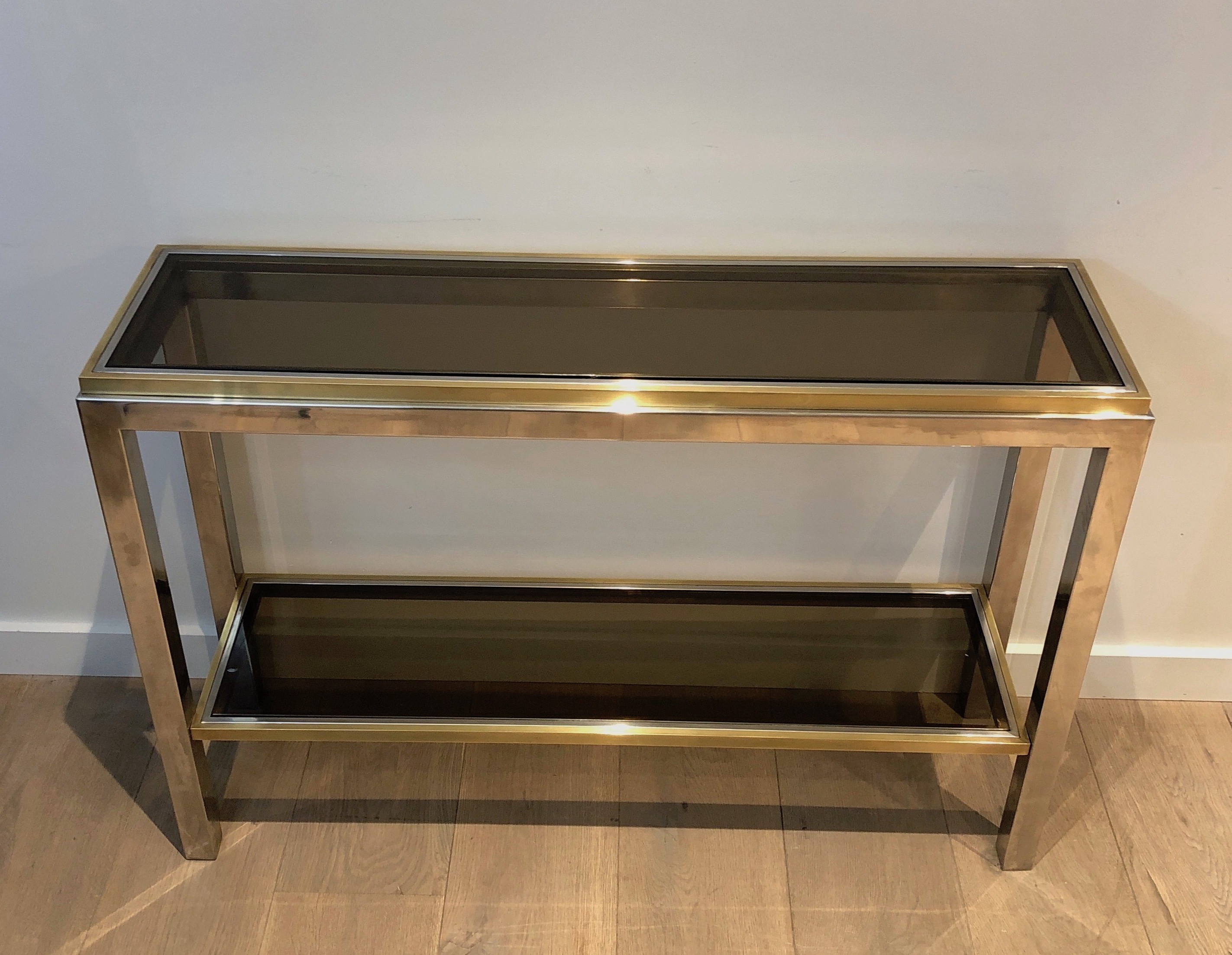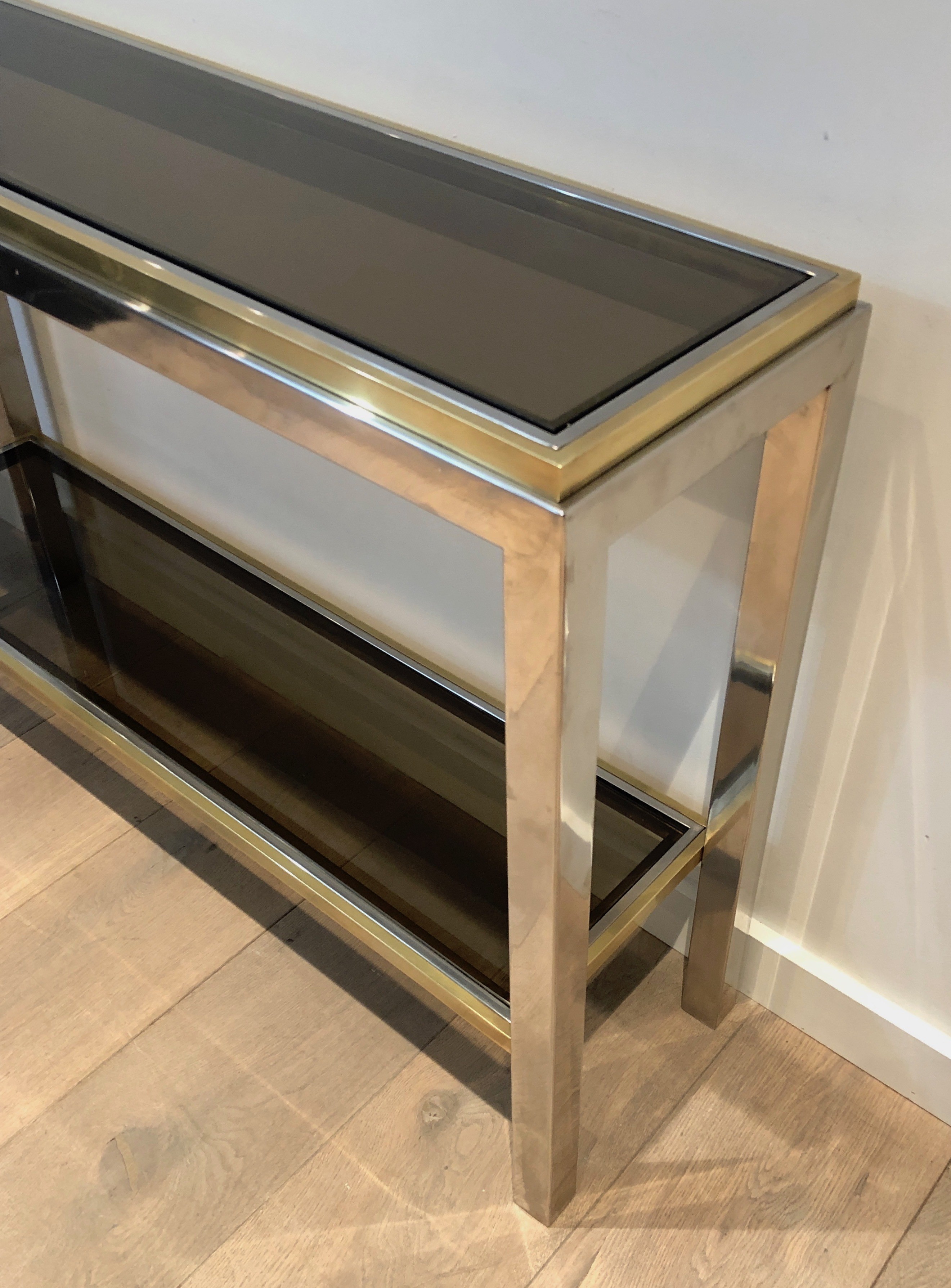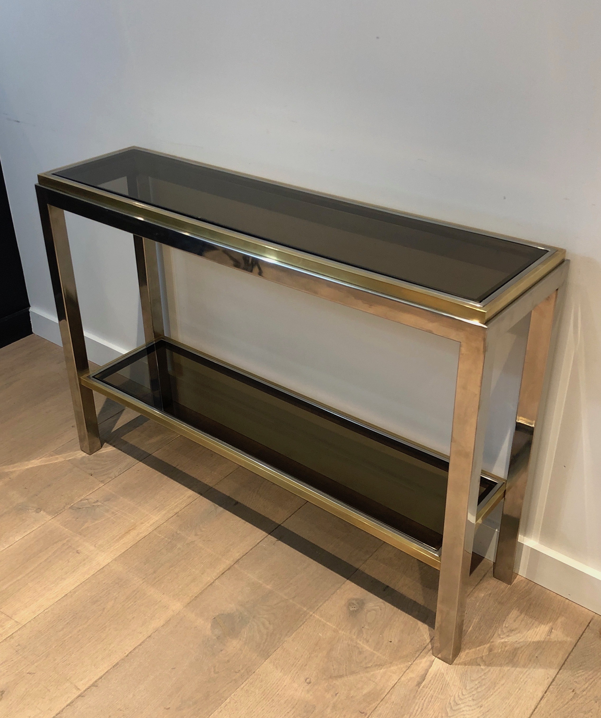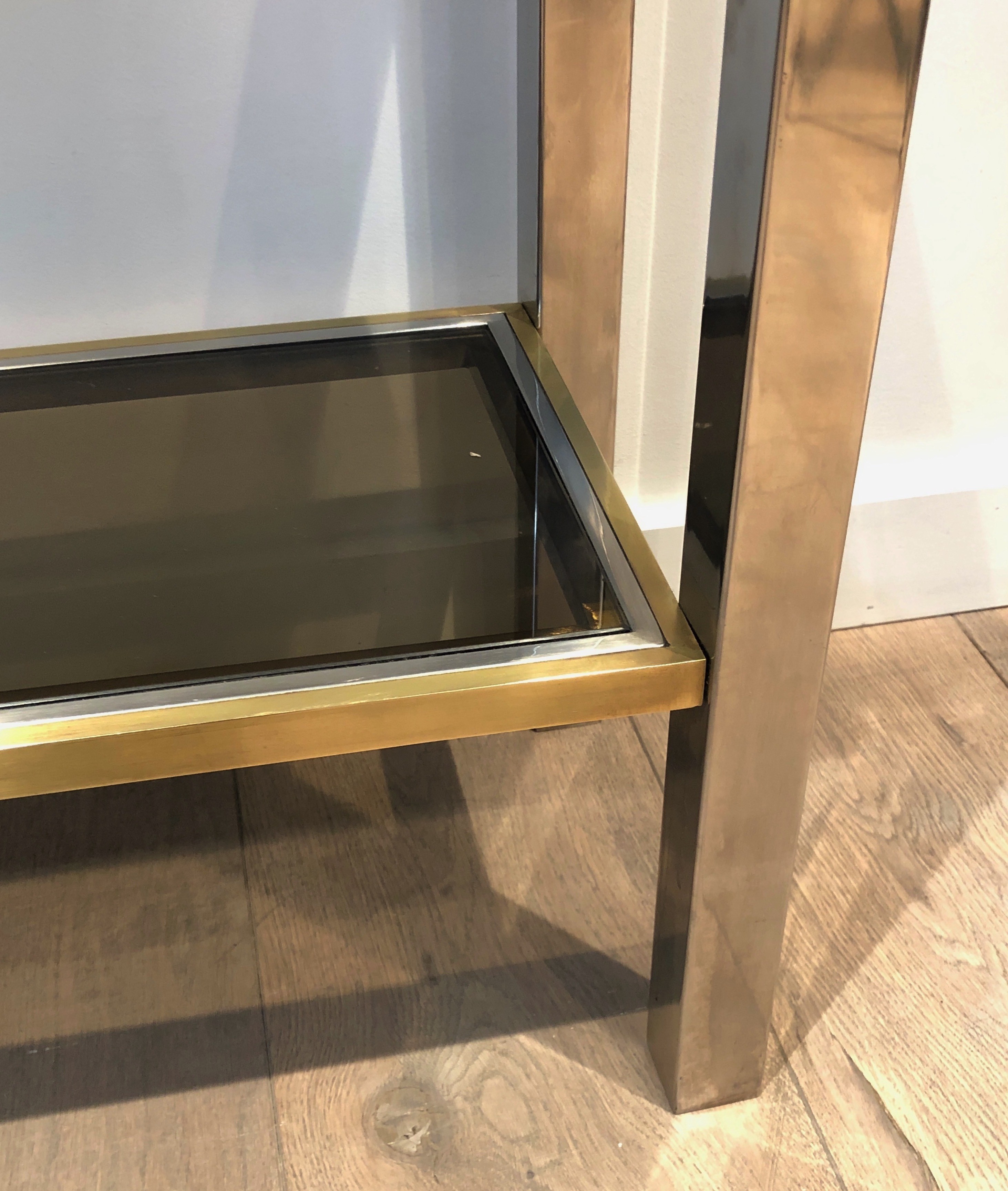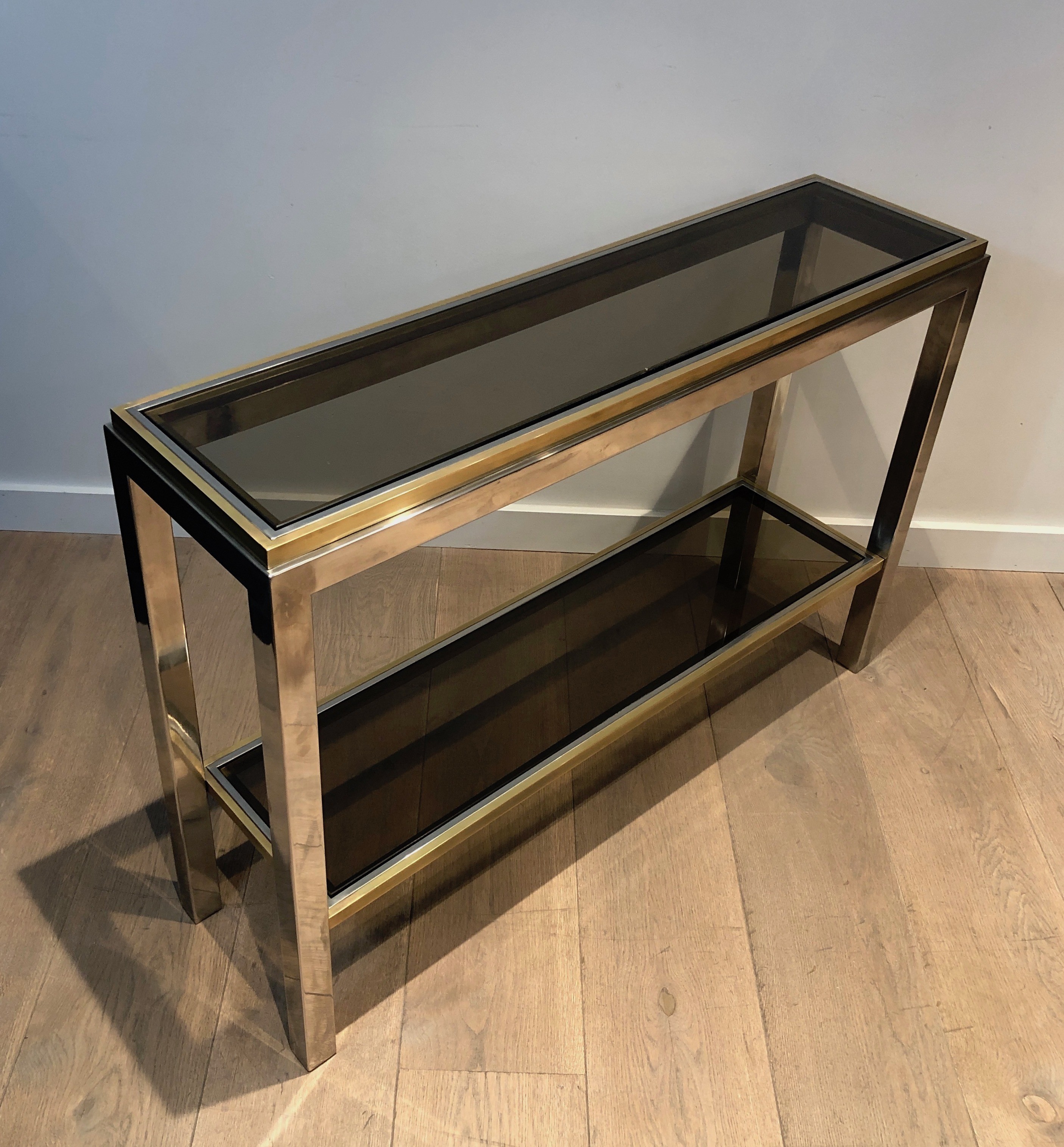 An elegant console table in chrome and polished brass, attributed to the French designer Jean-Charles, presenting the refined geometric aesthetics characteristic of the finest French furnishings of the early 1970s. The interplay of chrome and brass — two metals of contrasting warmth — creates a sophisticated visual tension that speaks to the era's fascination with metallic finishes and architectural forms in furniture design.