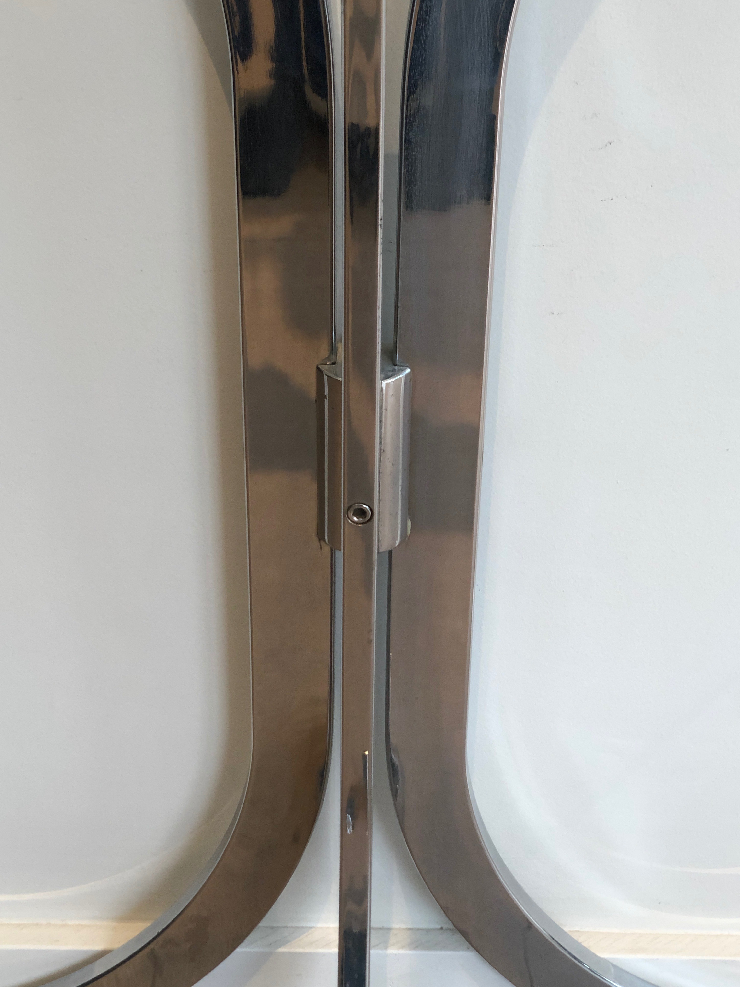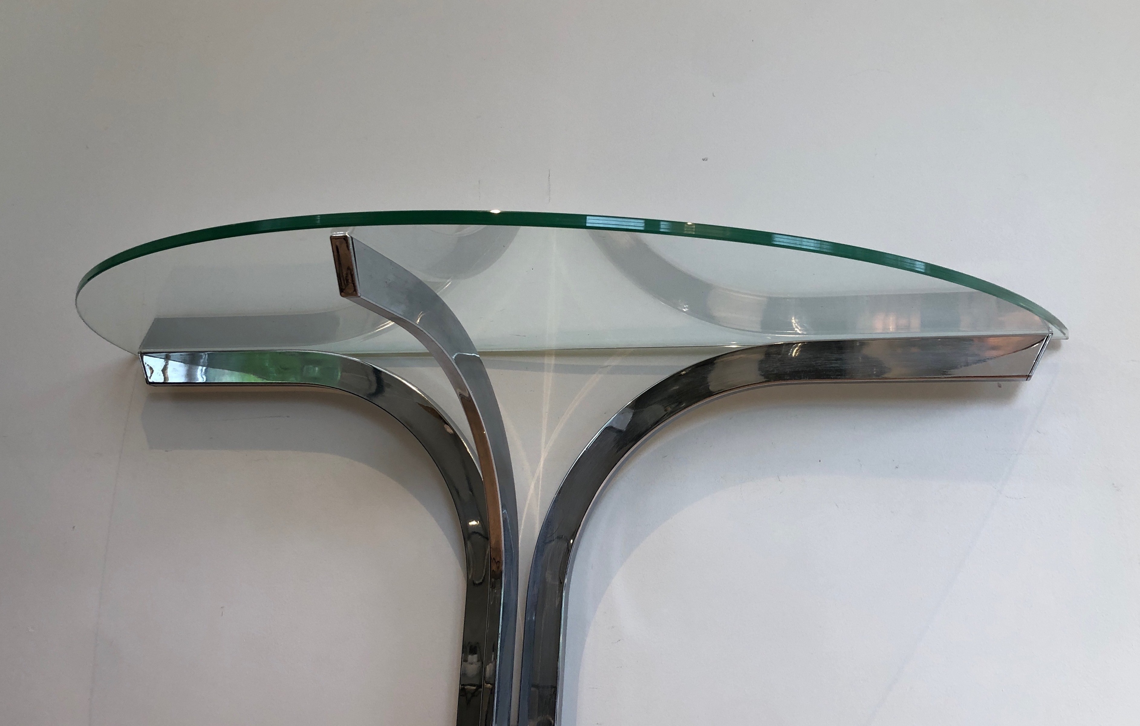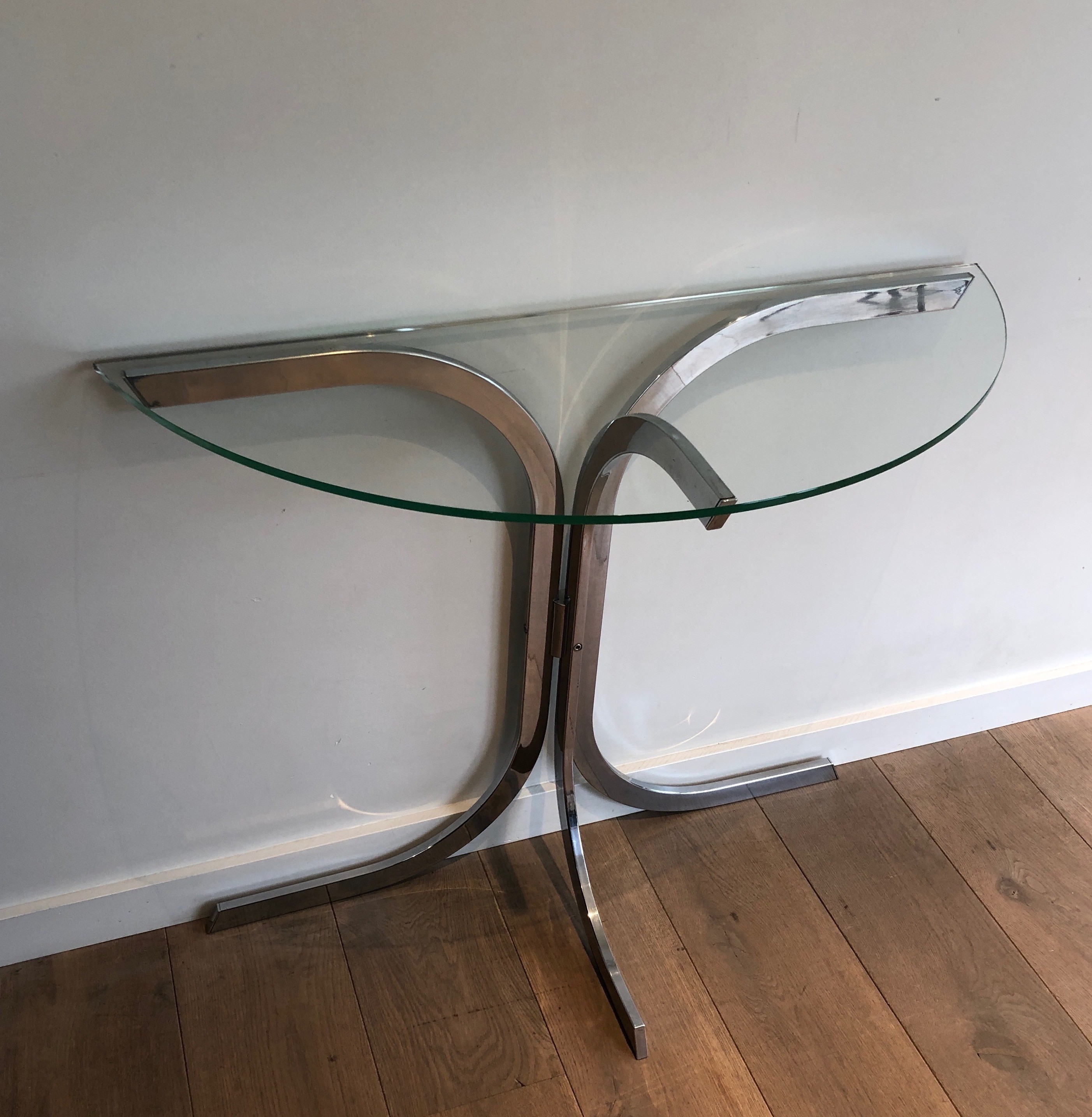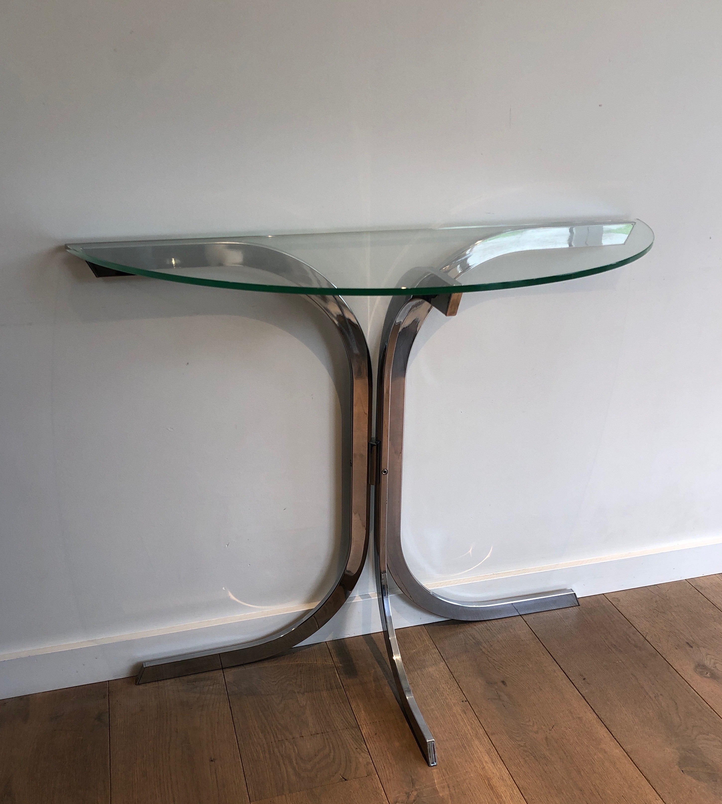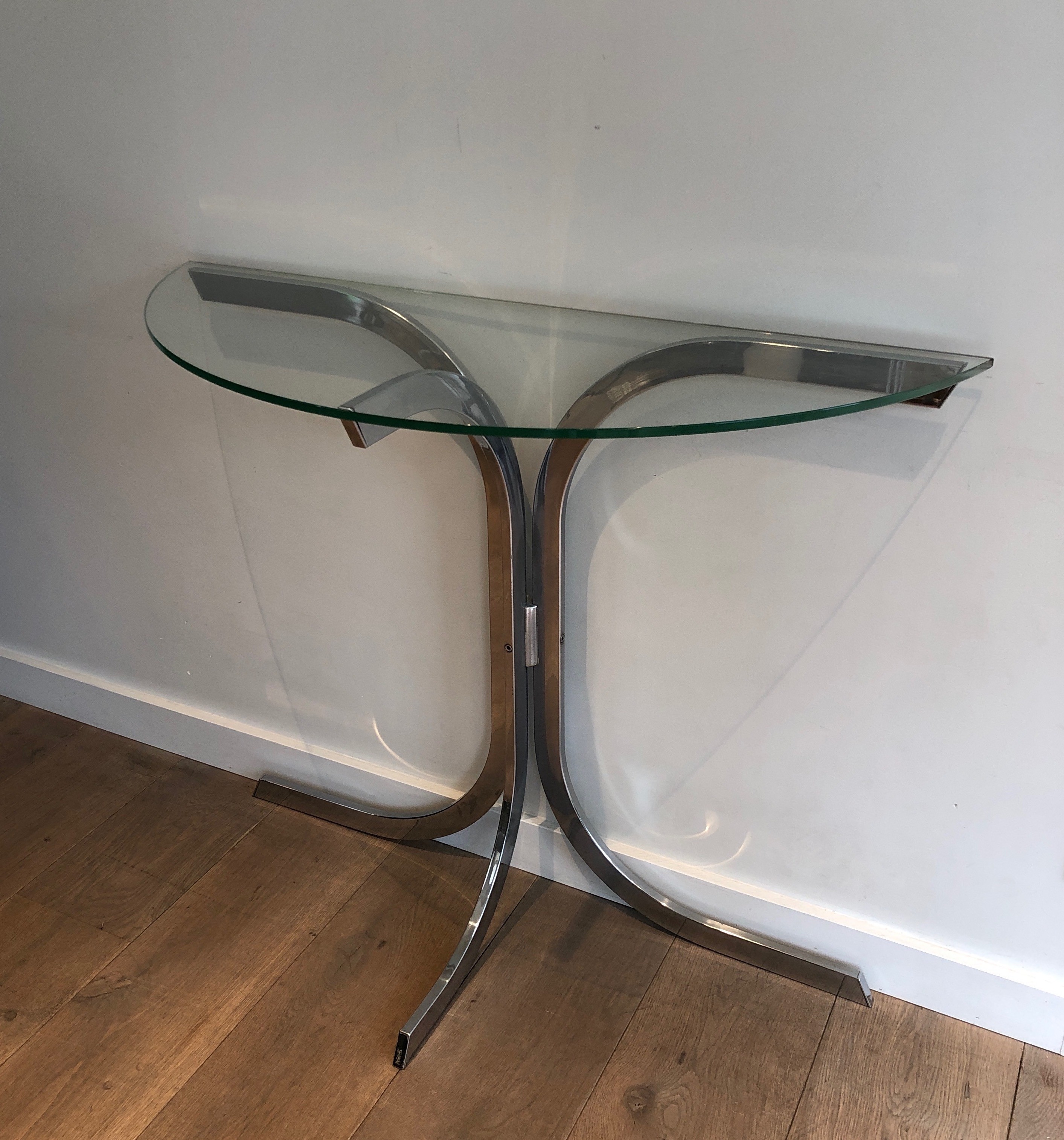 This elegant half-moon console is composed of a chromed metal frame of refined design, supporting a glass top that enhances its lightness and transparency. Its demi-lune form, characteristic of the decorative vocabulary of the 1970s, displays a masterful command of chromium-plated metal, with clean, precise lines that lend it an undeniable graphic elegance.