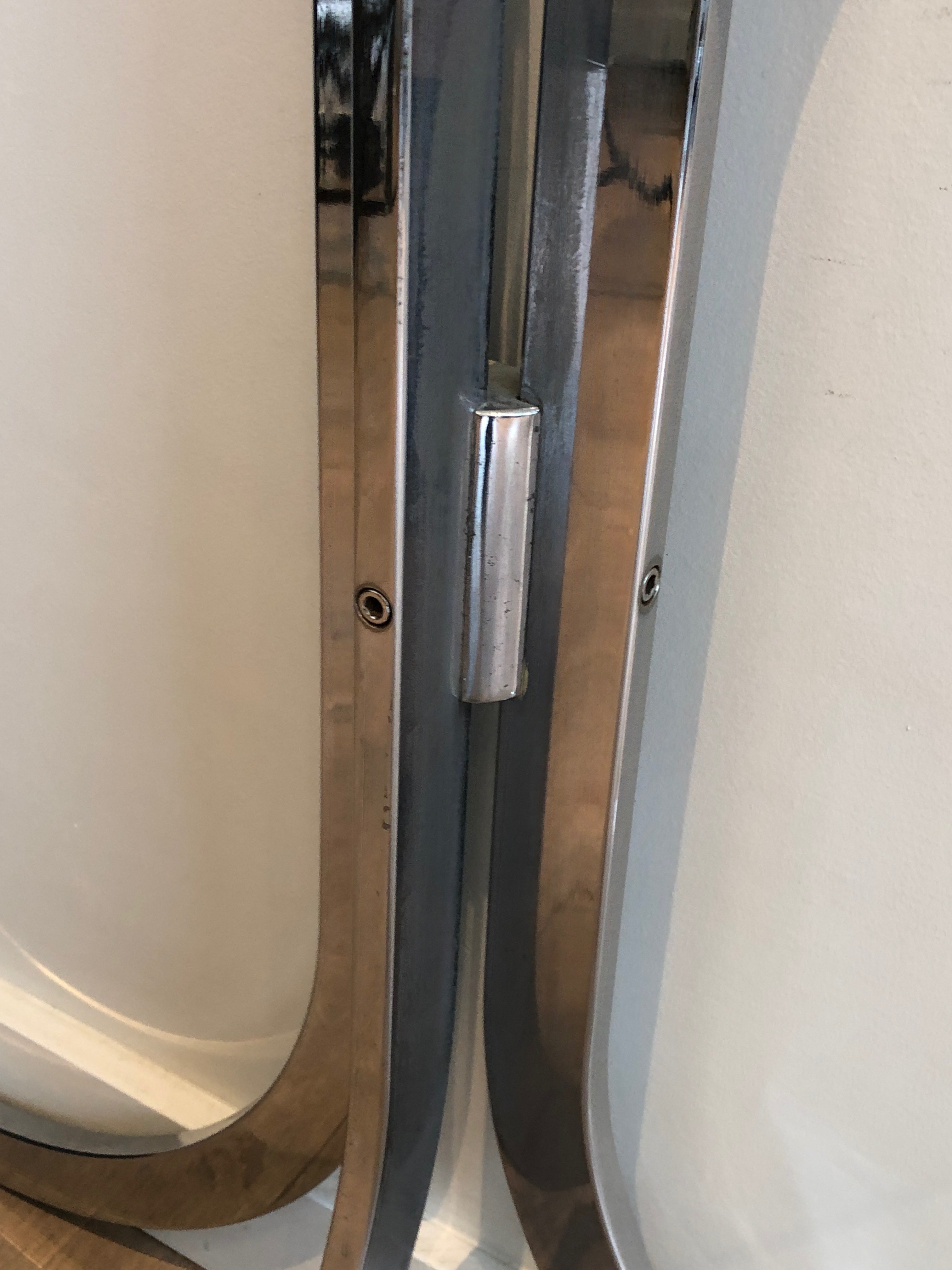 This console would integrate harmoniously into an entrance hall, a drawing room or a dressing room, where its graphic silhouette and luminous chrome would catch the light. A refined piece that brings both functionality and a glamorous, Parisian elegance to any interior.