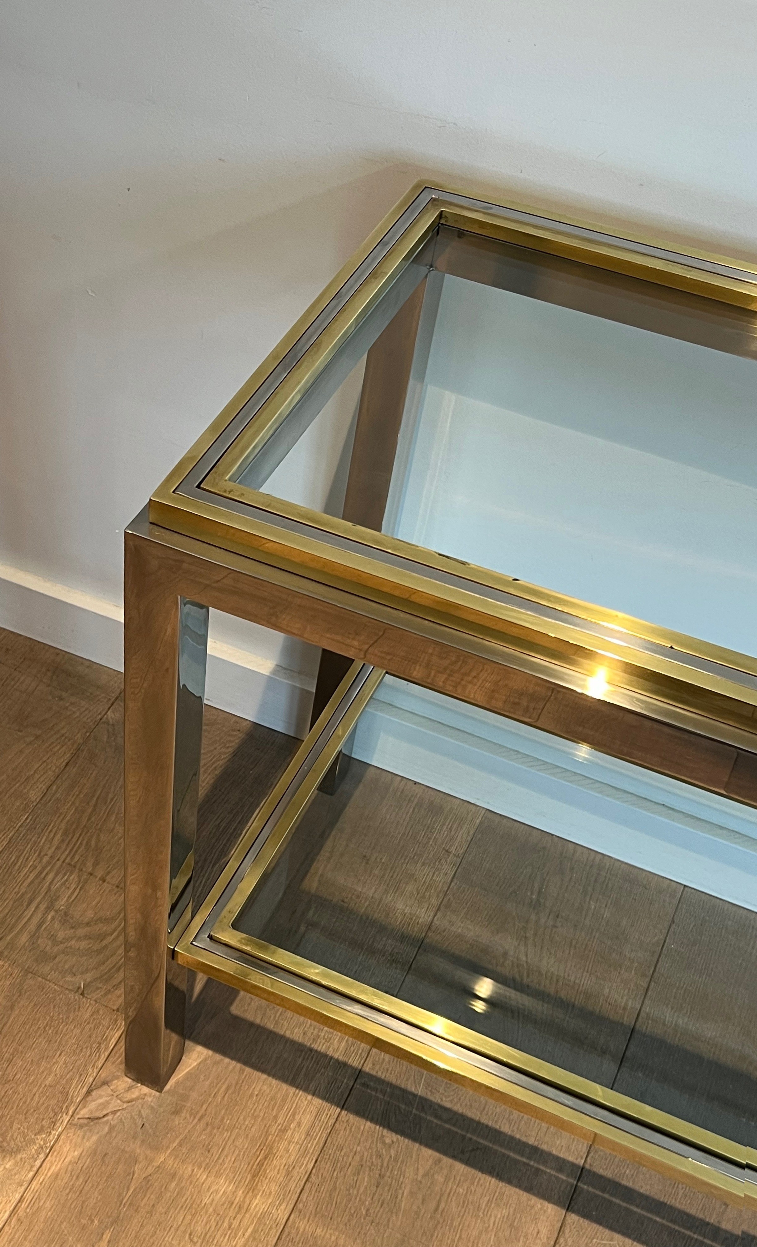 This imposing double-tier chrome and brass console is a characteristic creation of Willy Rizzo, an inescapable figure in French design of the 1970s. The combination of brilliant chrome and gilt brass produces a contrast of materials very typical of Rizzo's vocabulary — luxurious, assertive, resolutely oriented towards the world of Parisian glamour. The two-tier structure, at once functional and sculptural, bears witness to Rizzo's concern for balance between architecture and decoration.