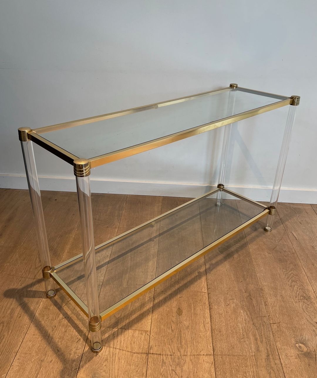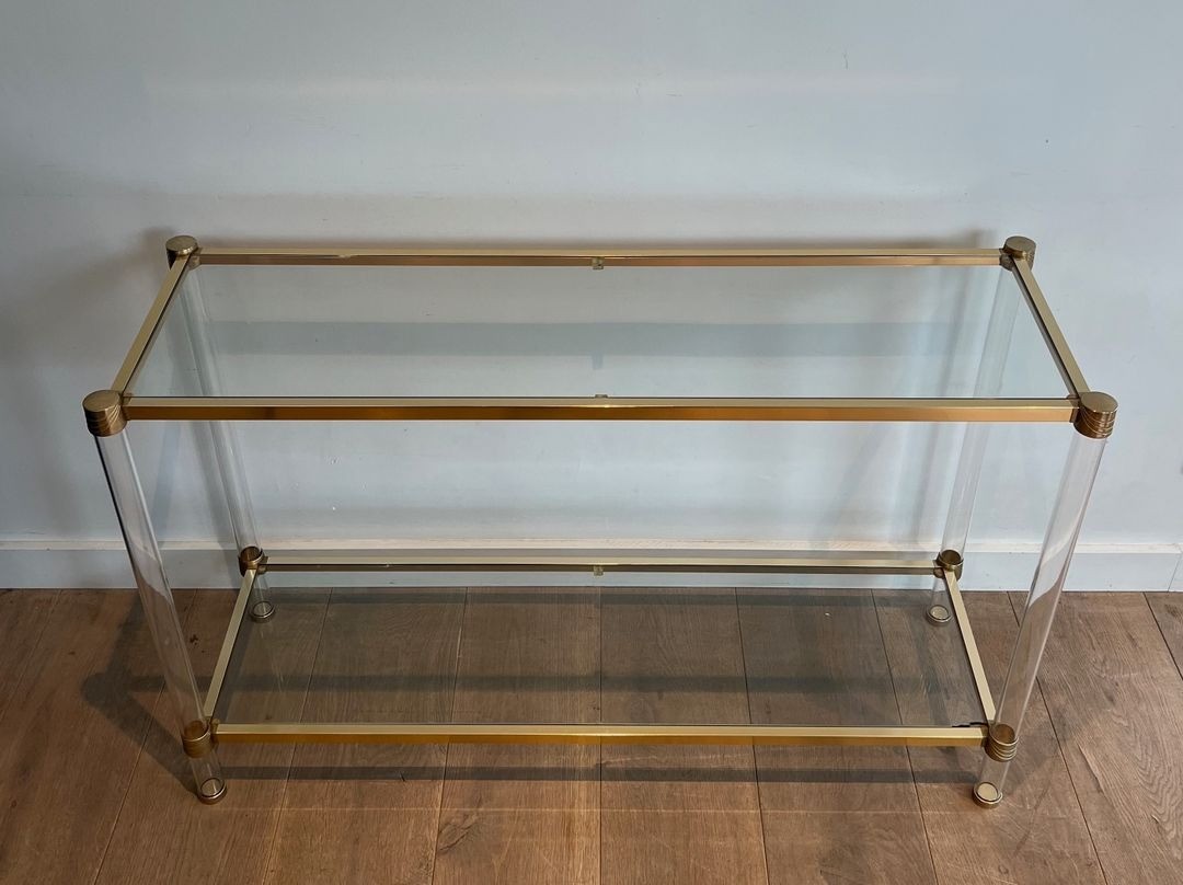 Console tables in lucite and gilt metal occupied a specific niche in the French luxury interiors market of the late 1960s and 1970s, offering a visually dramatic alternative to traditional wooden or marble consoles while remaining entirely within the vocabulary of high-end French craftsmanship. The use of acrylic, elevated from industrial material to luxury object in the hands of leading French designers and workshops, combines here with gilt metal to create a piece that is simultaneously transparent and richly adorned. This console, with its confident proportions and refined bimetallic palette, is an accomplished representative of the era.