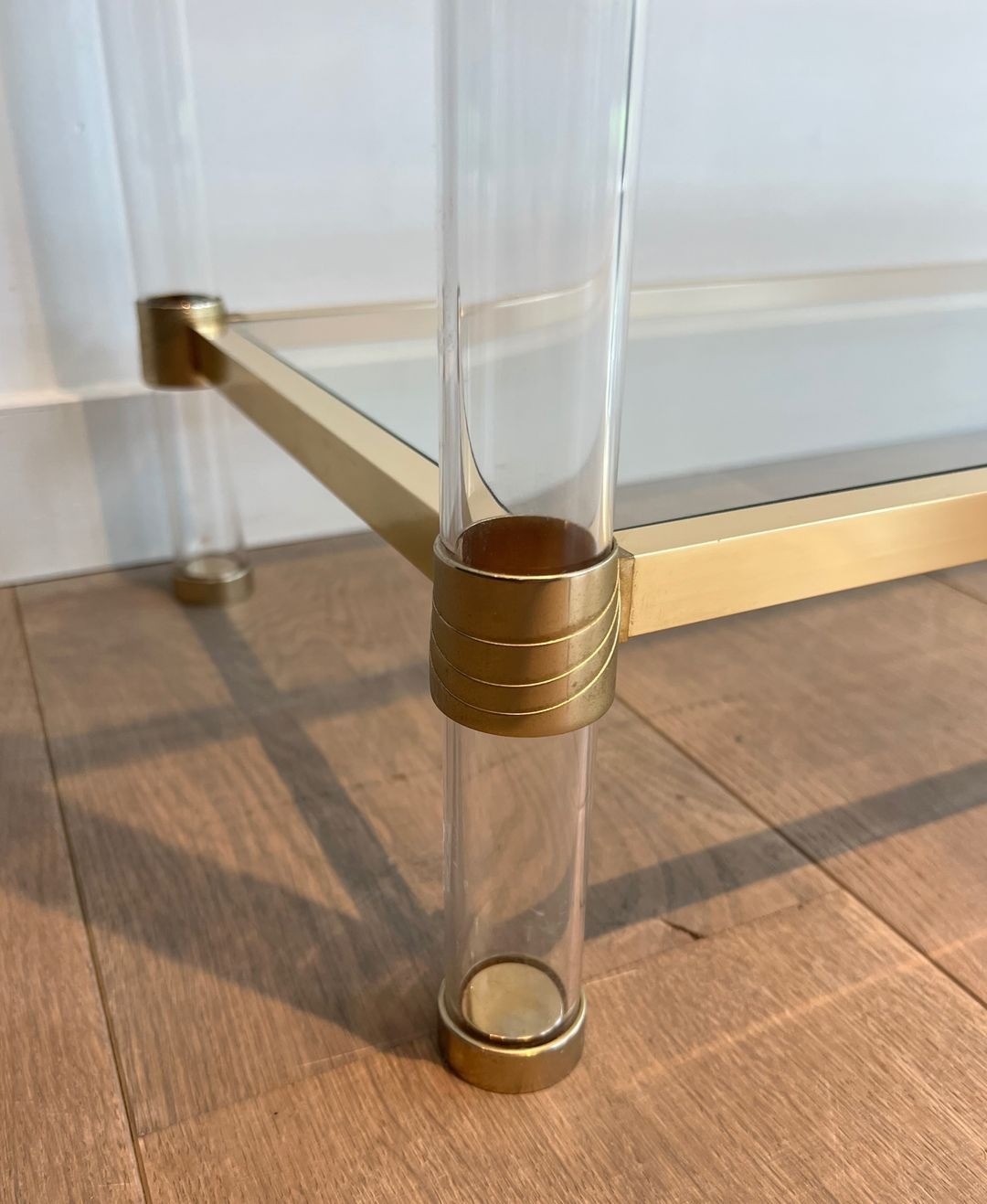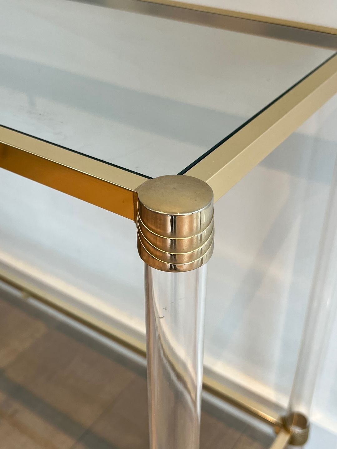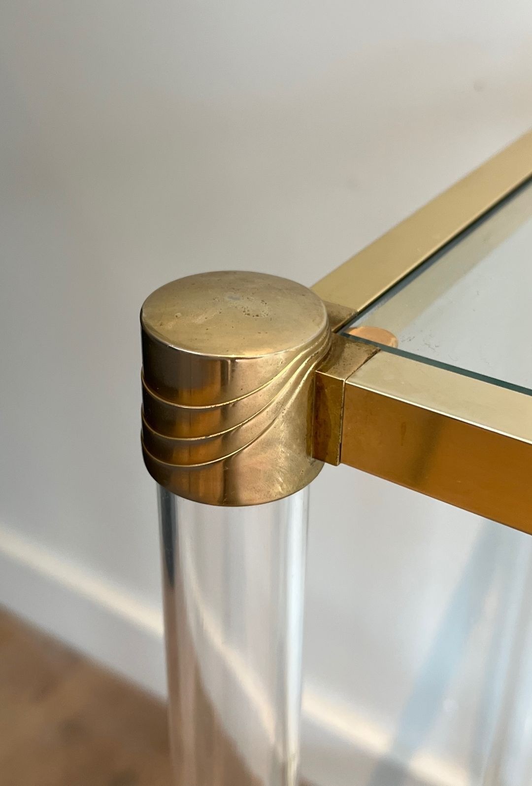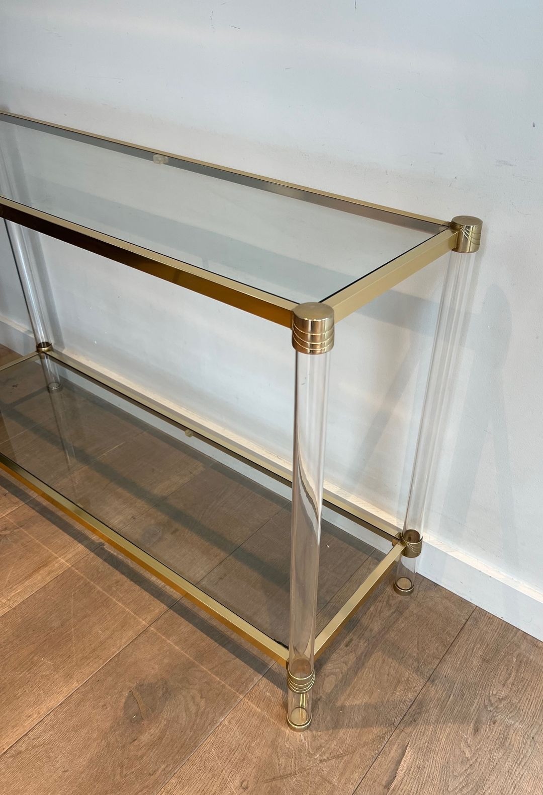 A console table of striking mid-century design in clear lucite and gilt metal, its generous rectangular top in transparent acrylic — a material prized in the 1960s and 1970s for its crystalline clarity and sculptural versatility — supported on a gilt metal base of elegant and refined form. The juxtaposition of the cool transparency of the lucite and the warm golden lustre of the gilt metal produces an effect of simultaneous weightlessness and opulence that is the particular achievement of the best French decorative furniture of the late Space Age.