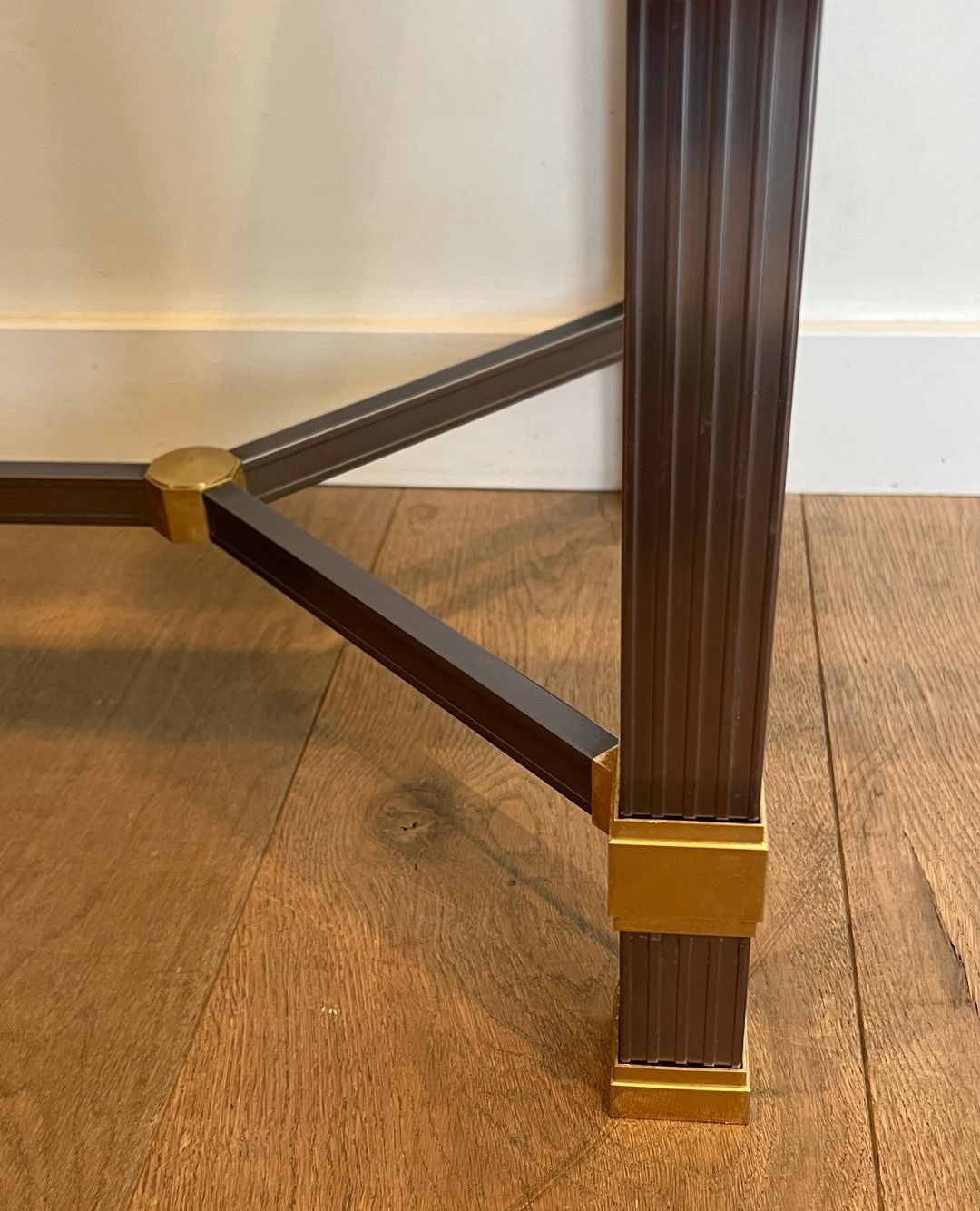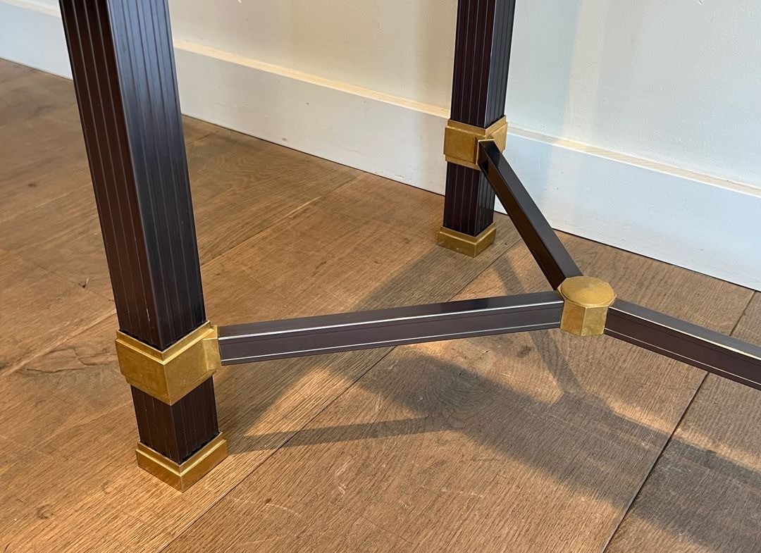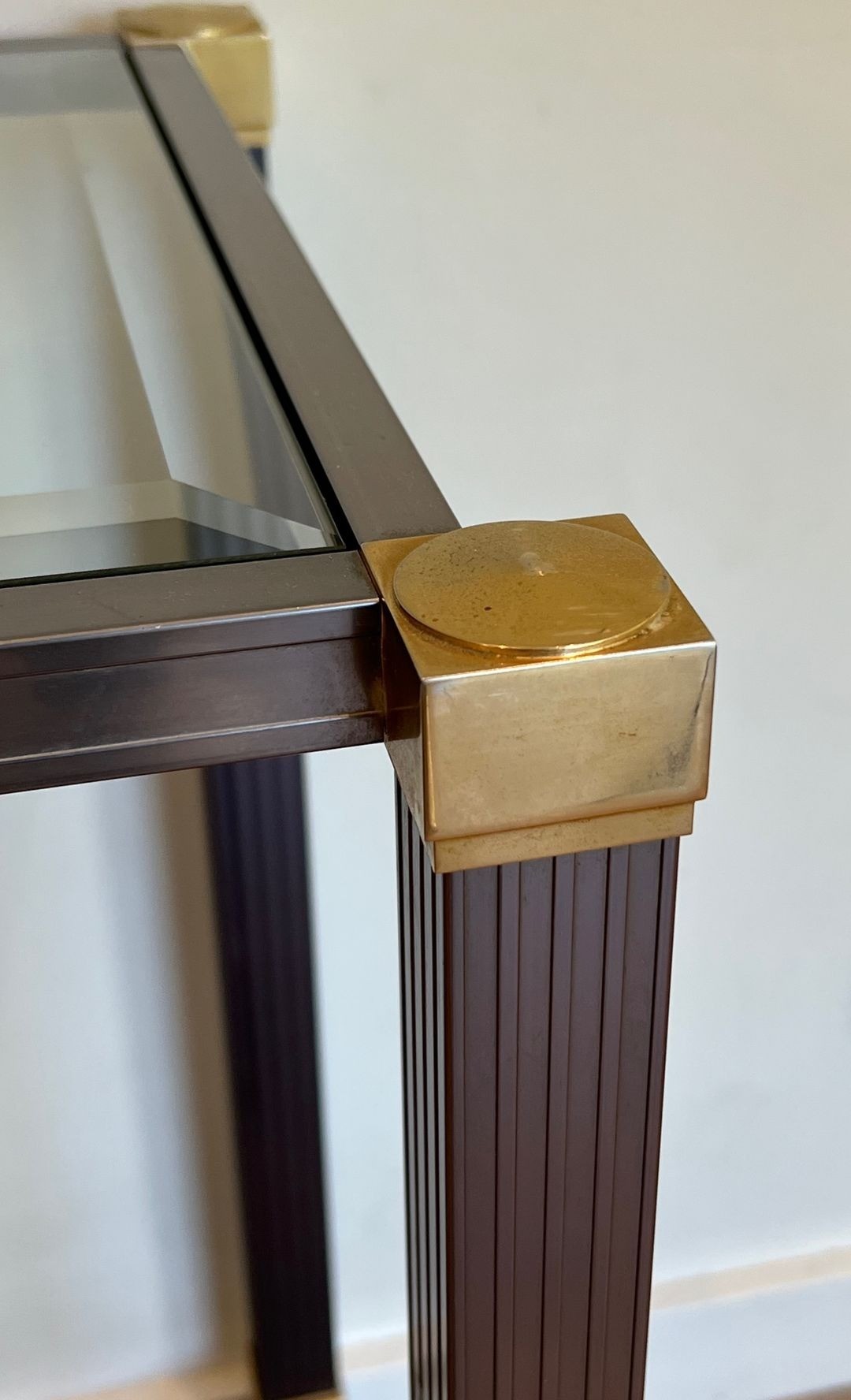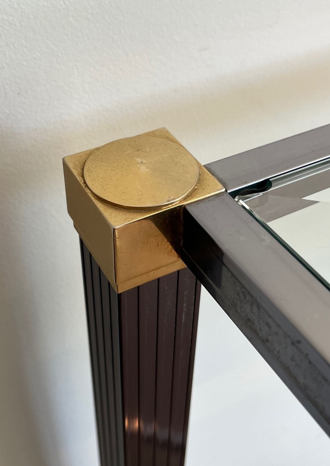 Console table with clear glass top, dark lacquered aluminium frame with fluted legs and gilt metal corner mounts. Signed Pierre Vandel, France, circa 1970. W. 128 × D. 43 × H. 74.5 cm.