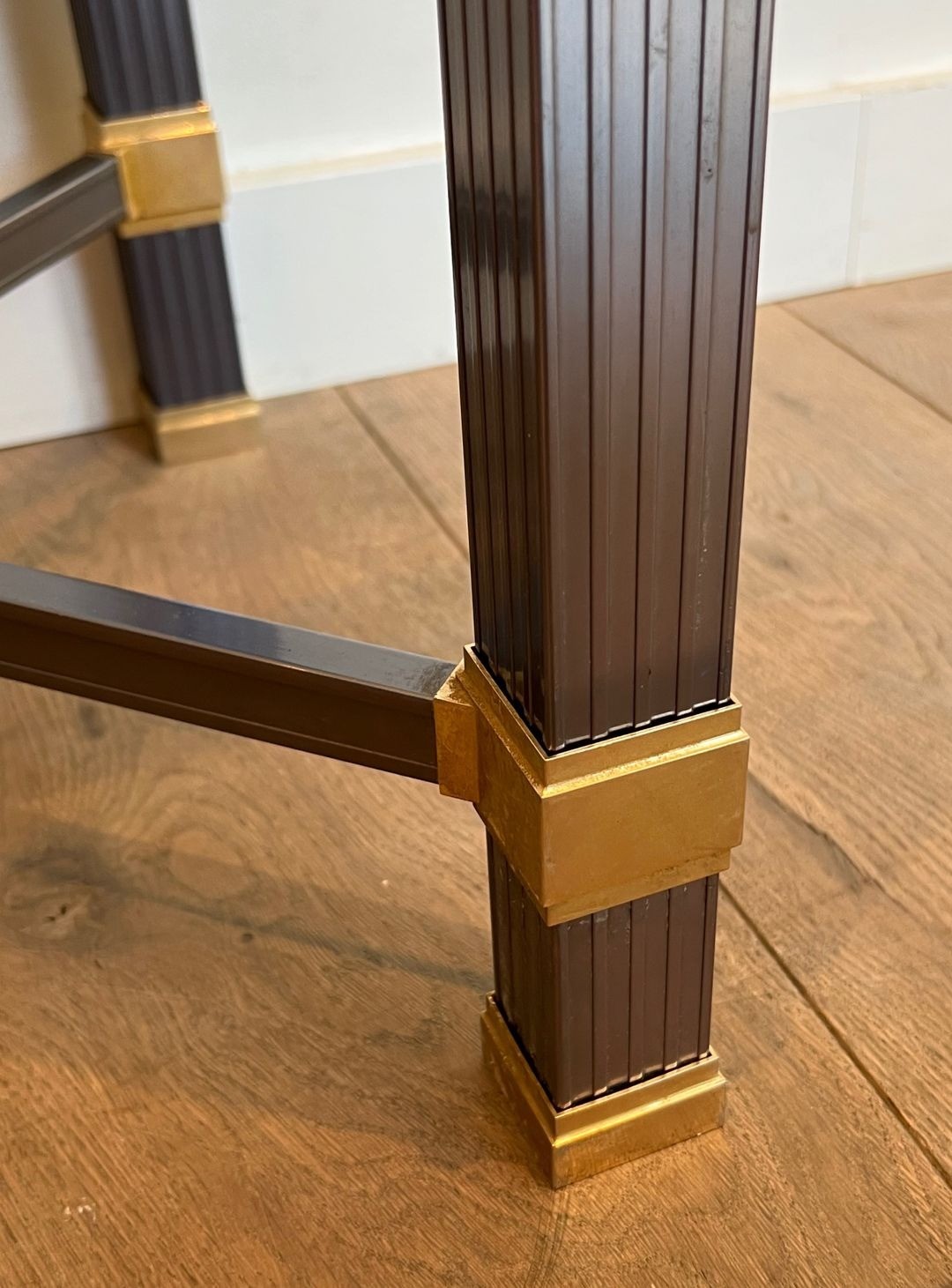 The frame, constructed from dark lacquered aluminium, features fluted legs whose vertical channelling introduces a note of classical rigour into an otherwise resolutely modern composition. The four legs terminate in distinctive square gilt-metal capitals where they meet the horizontal framing members — a detail that recurs in Vandel’s œuvre and serves as one of the house’s defining signatures. The whole is crowned with a clear glass slab that allows the elegant substructure to be read in its entirety.