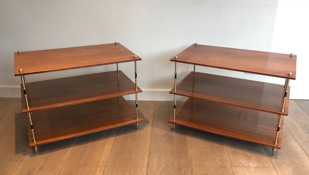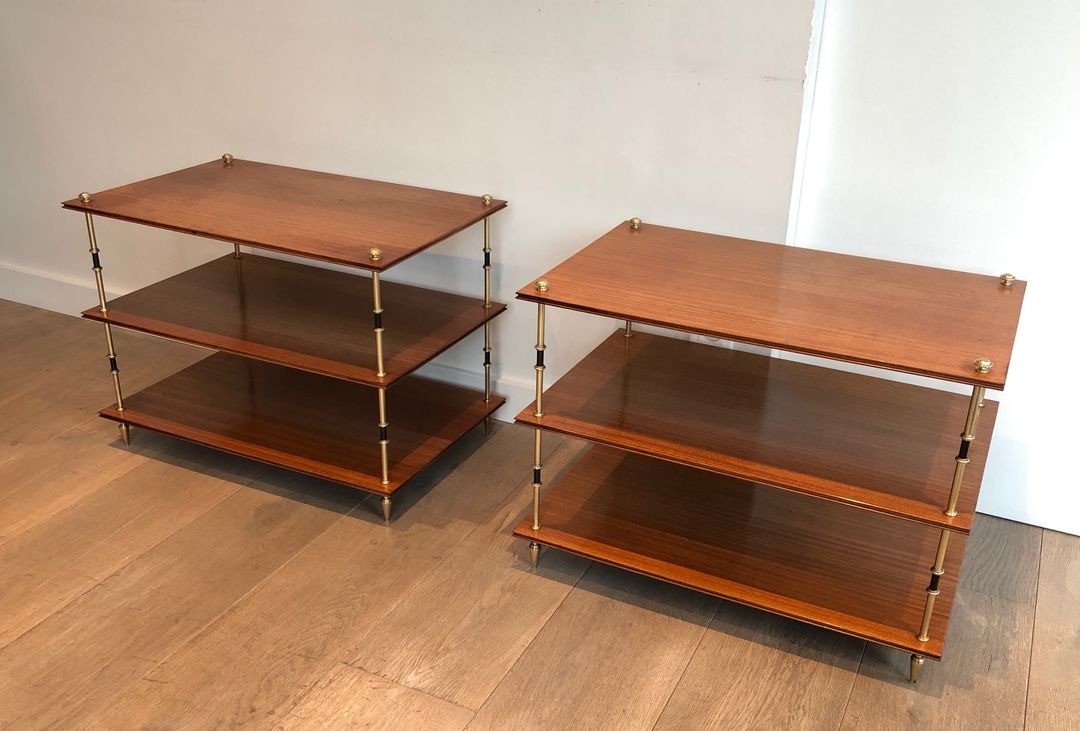 An authoritative pair of three-tier side tables from Maison Jansen, the legendary Parisian decorating house whose unrivalled command of the neoclassical tradition made it the preferred supplier for the world’s greatest private interiors from the Belle Époque through the mid-twentieth century. Each table is constructed with Jansen’s characteristic combination of precious materials and impeccable craft: three rectangular shelves of warm mahogany veneer are supported at each corner by cylindrical columns that alternate sections of polished brass with sections of black lacquered metal, the two materials working together to create a lively, jewel-like rhythm along the height of each support. Small brass knob finials mark the junction of column and shelf on the upper tier, adding a further note of precious decoration that repays close inspection.