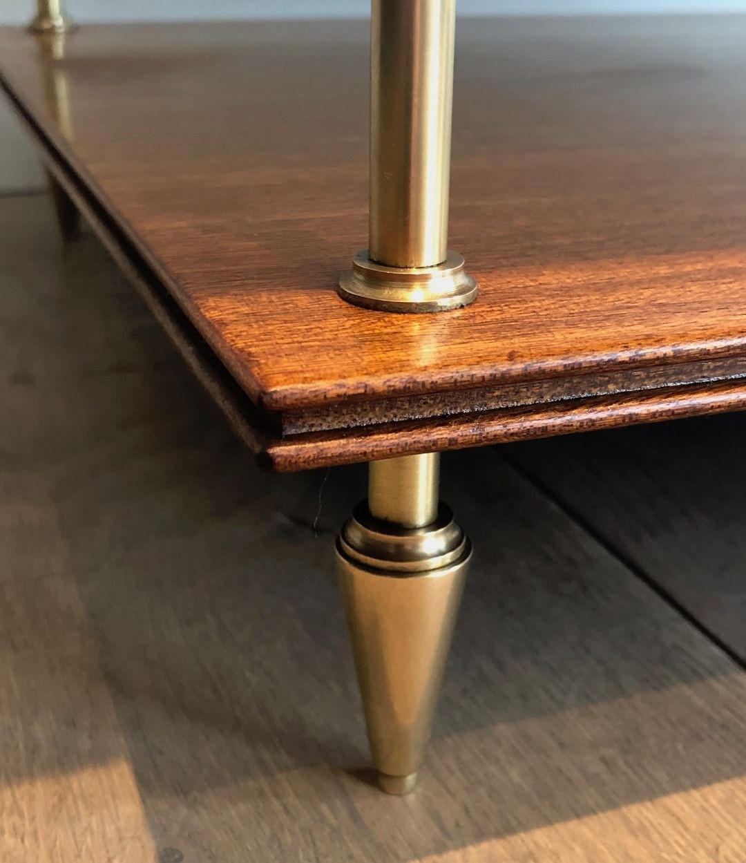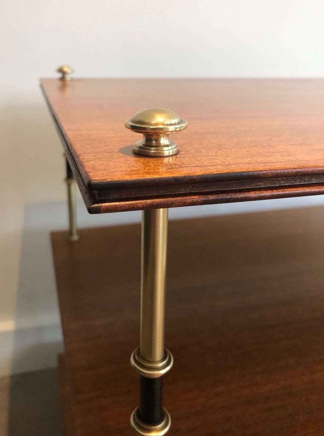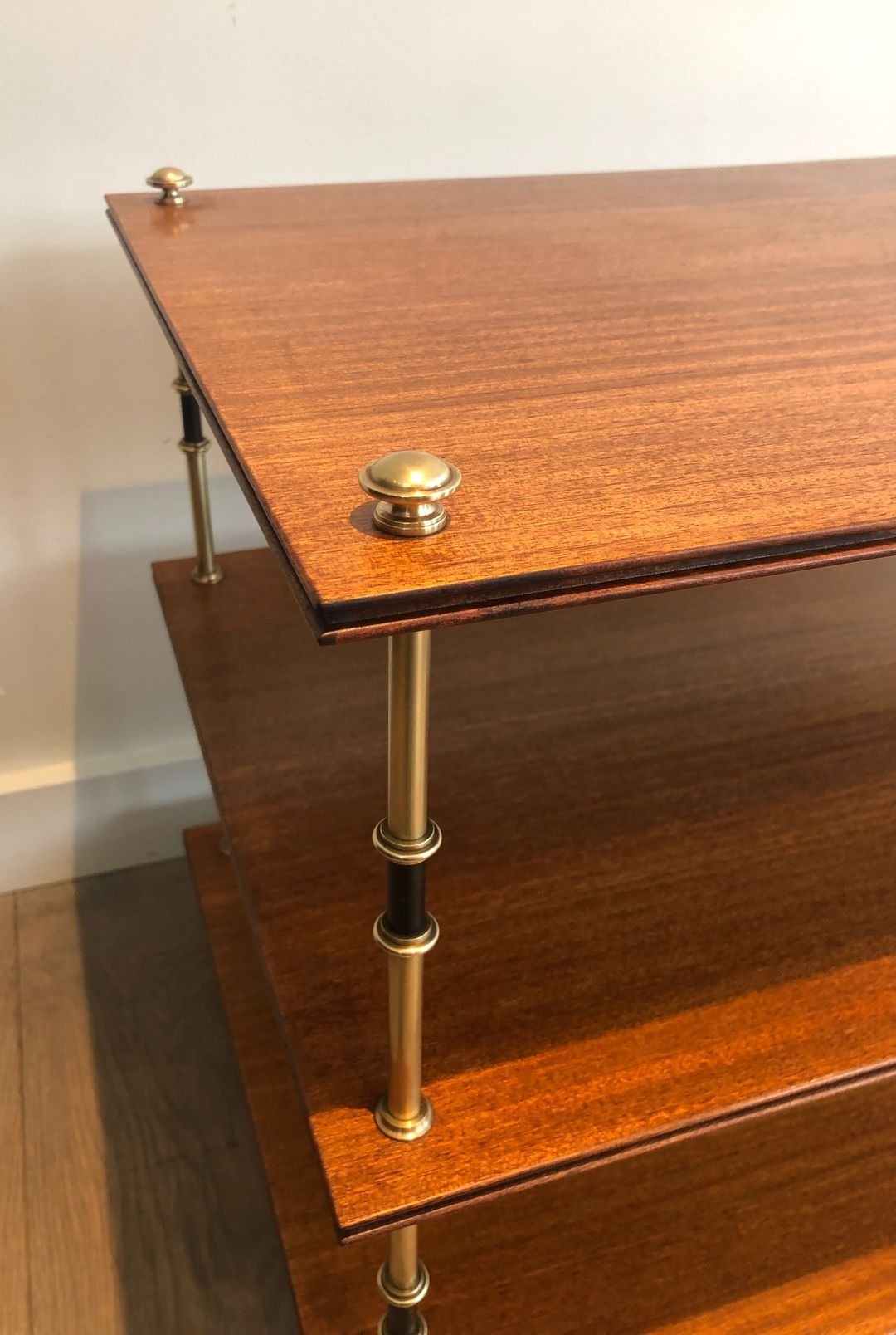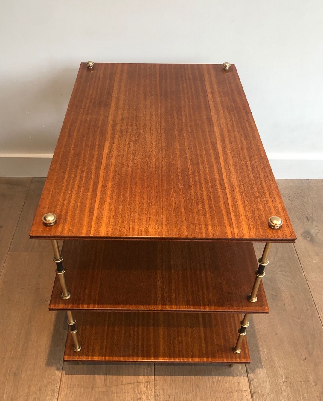 The mahogany surfaces are finished with the smooth, lustrous quality associated with the finest French ébénisterie, their warm reddish-brown grain complementing the golden tones of the polished brass without competing for attention. The alternating brass-and-black treatment of the columns is a Jansen signature that appears across many pieces from this period — a device of neoclassical origin, recalling the carved and gilded supports of Empire-period furniture, here translated into a modern, metal vocabulary.