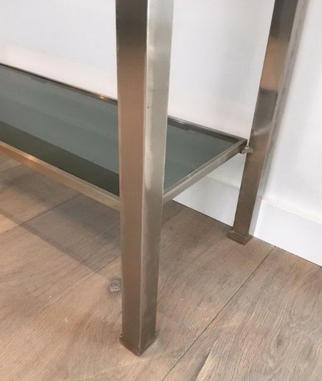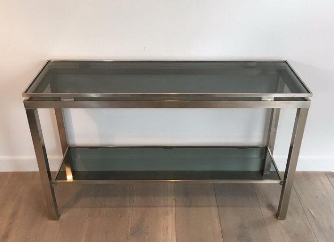 The console table was one of Guy Lefèvre’s most accomplished furniture types at Maison Jansen. Its long horizontal format presented the ideal canvas for the brushed steel and glass aesthetic that he developed during his tenure as the firm’s principal designer — a vocabulary that privileged material quality over decorative elaboration, and structural clarity over surface ornament.