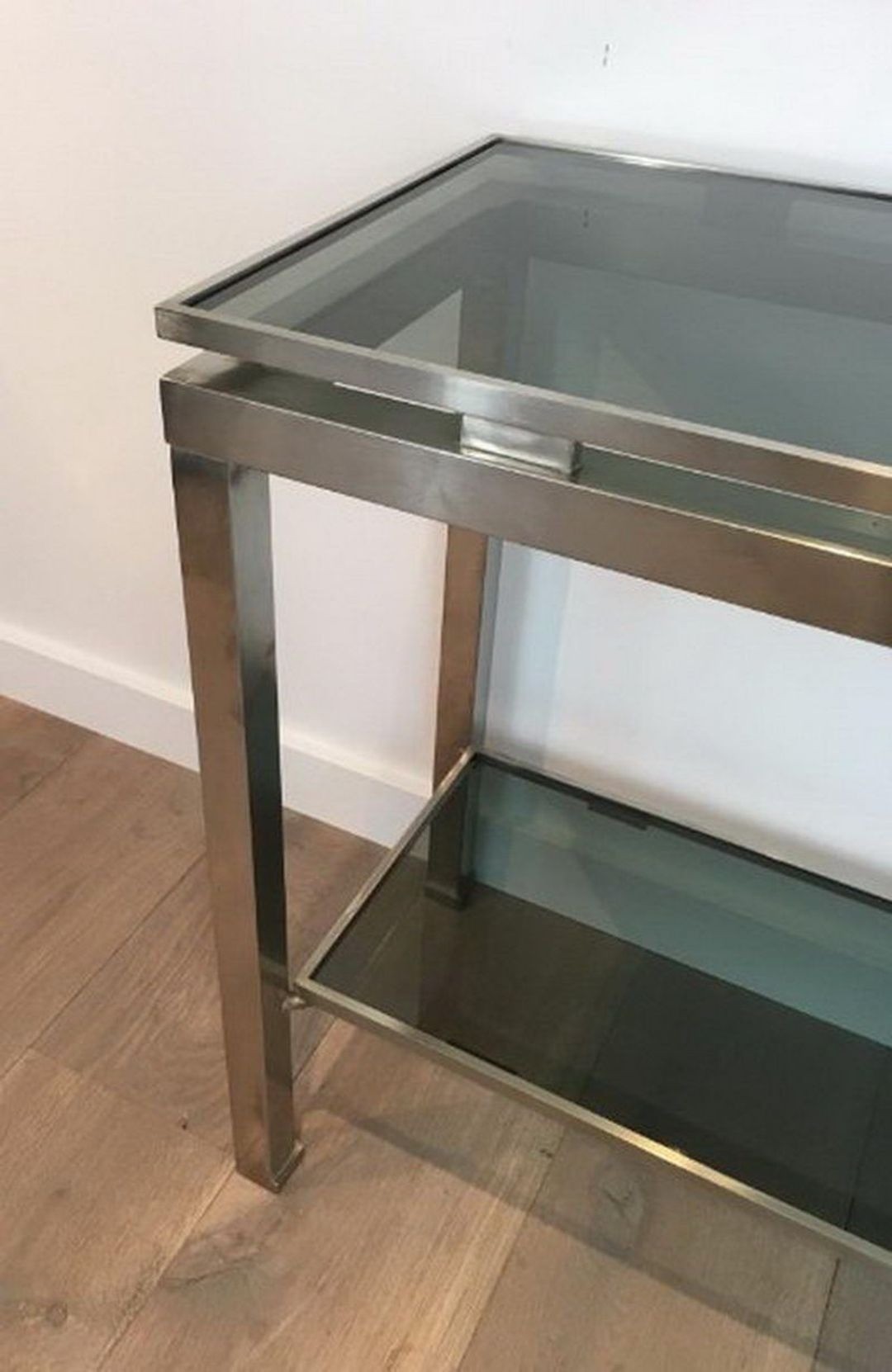 An elegant two-tier console in brushed steel with characteristic rivet detailing, the top surface and lower shelf in smoky blue-tinted glass. Designed by Guy Lefèvre for Maison Jansen, circa 1970. W. 117 × D. 37 × H. 71 cm.