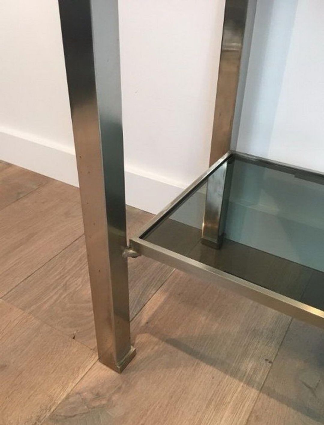 This example combines the principal elements of that vocabulary with particular refinement. The brushed steel frame — with its characteristic rivet detailing along the structural members — provides both the primary material statement and the organisational logic of the piece. Two tiers of blue-tinted glass, one at console height and one as a lower shelf, introduce a colour note of considerable subtlety: the blue-grey of the glass varies with the light, appearing deeper in shadow and almost translucent in direct illumination.