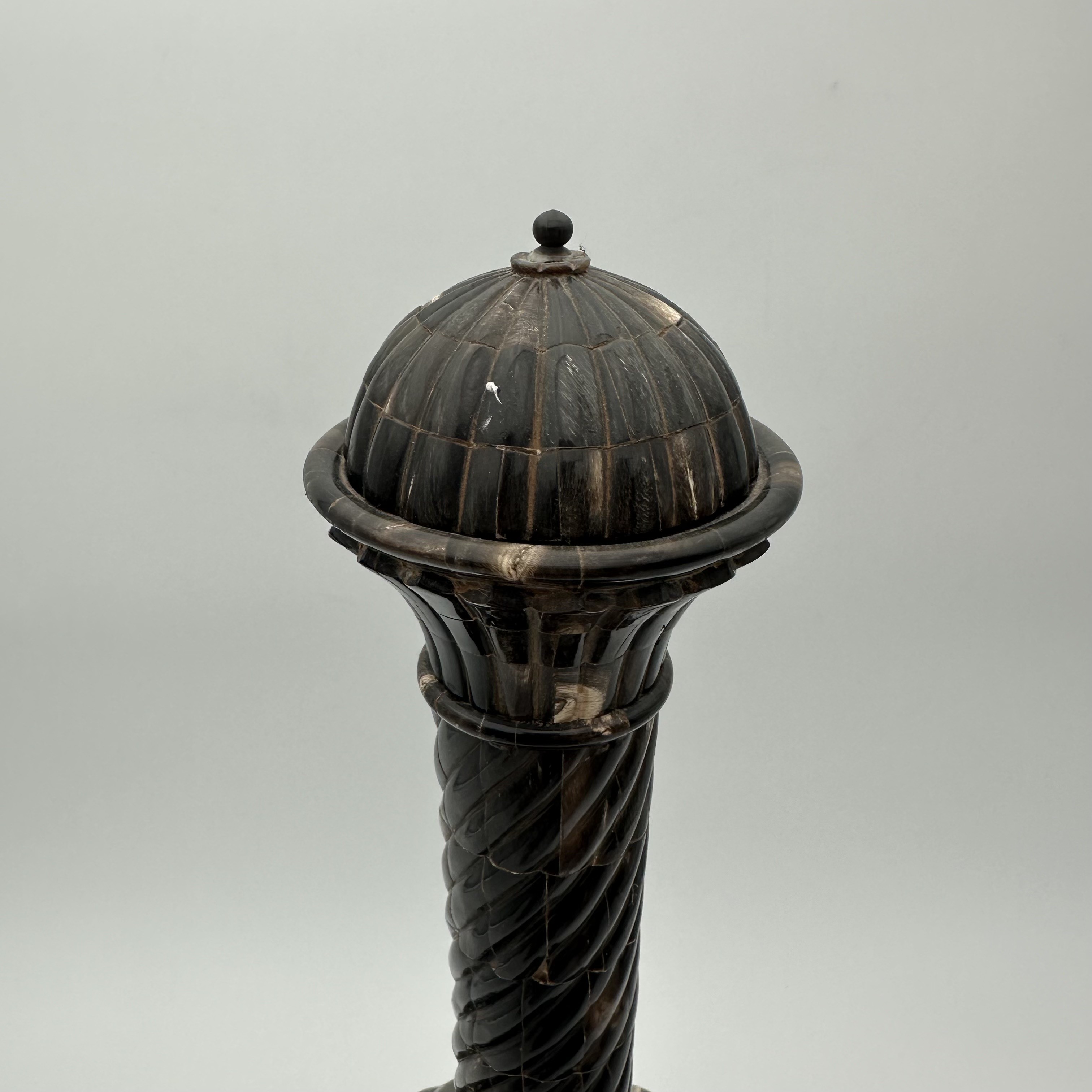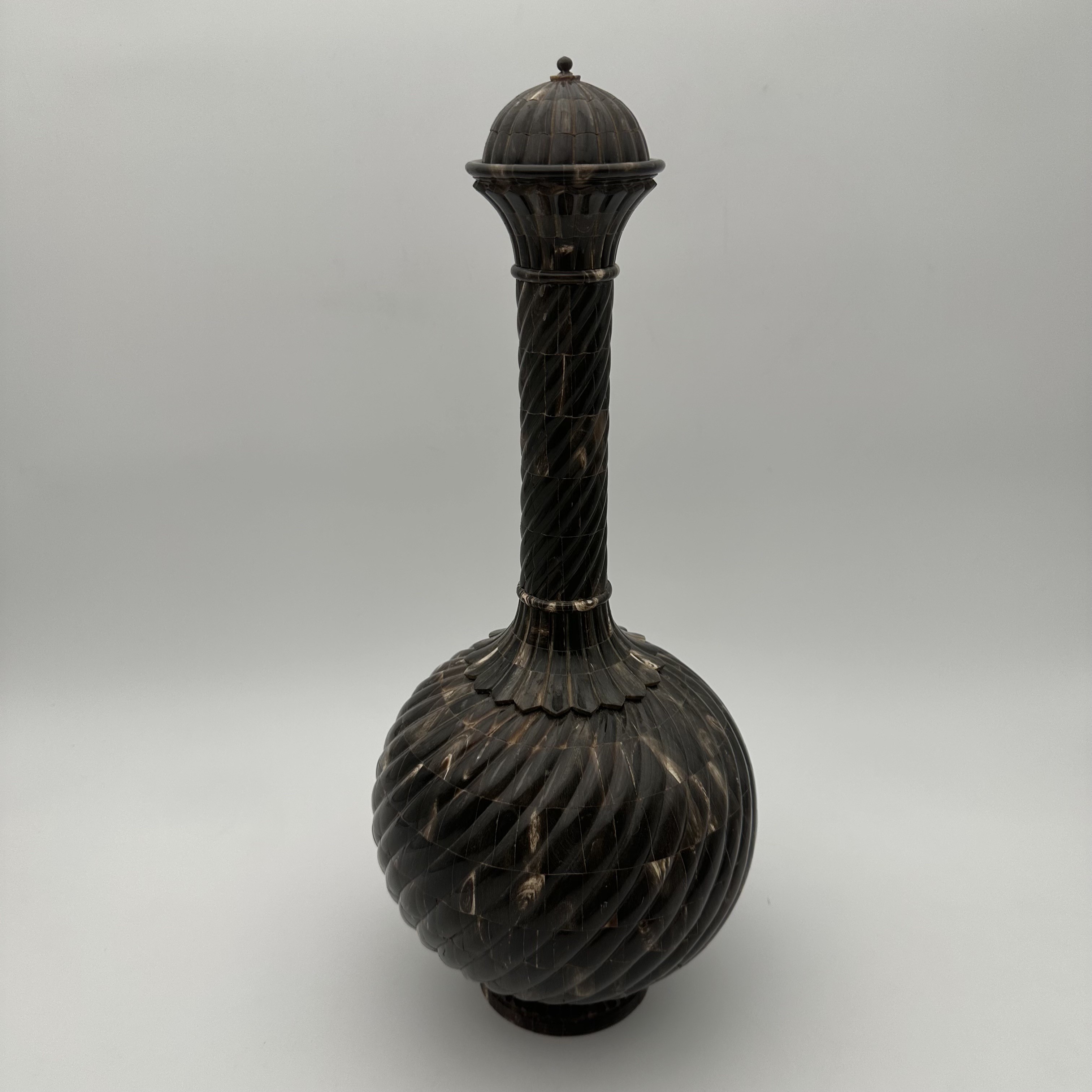 Imposing votive or ceremonial bottle featuring superb wood turning covered with dark horn veneer. Brass neck and stopper topped with a pearl finial, base inlaid with a lotus motif. Dimensions: Width (Diameter): 20 cm | Depth: 20 cm | Height: 43 cm.