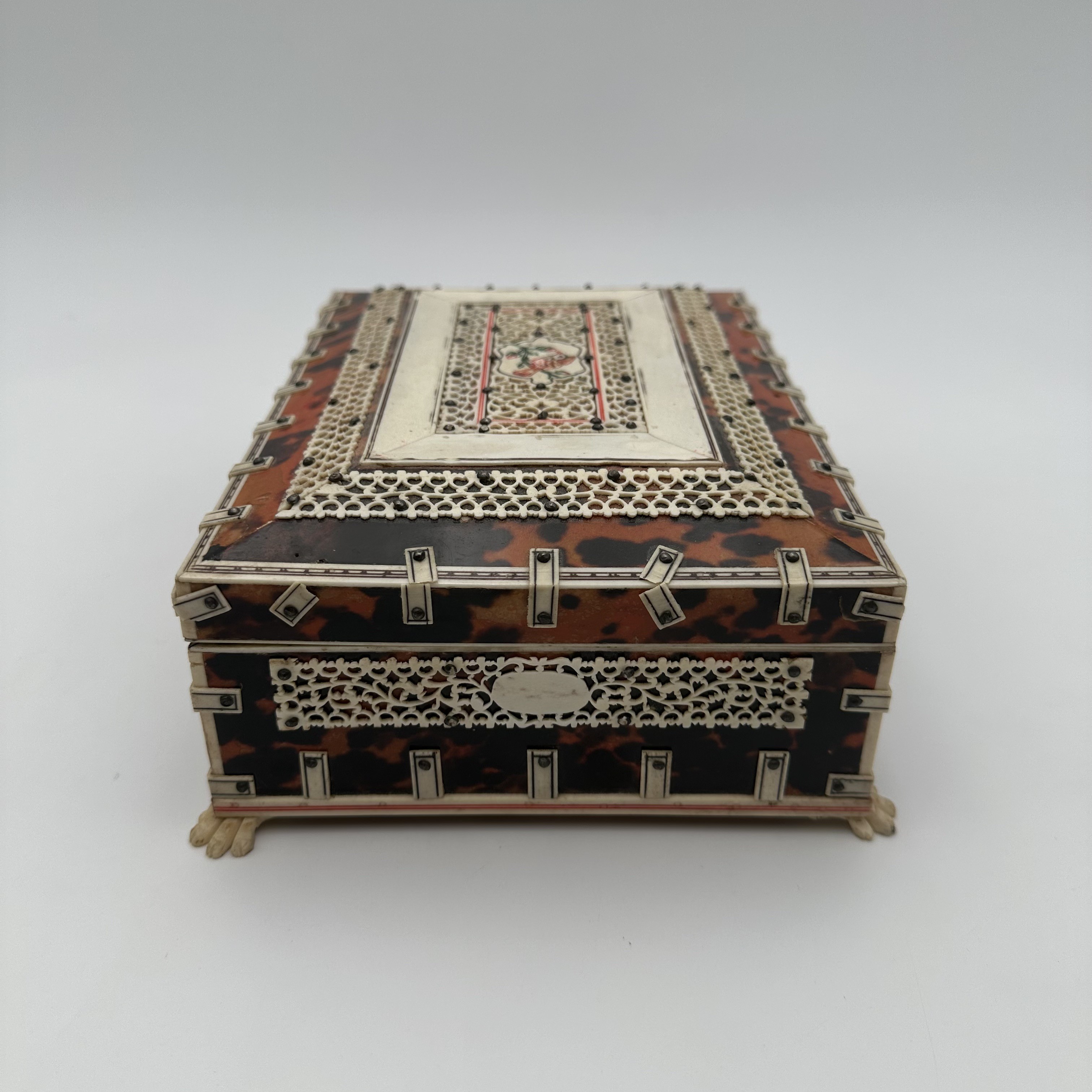 Magnificent Victorian-era jewelry box, richly adorned with tortoiseshell veneer and finely pierced fretwork overlays of bone and ivory. Anglo-Indian export craftsmanship, highly likely originating from Vizagapatam. Dimensions: Width: 15.5 cm | Depth: 20.5 cm | Height: 8 cm.