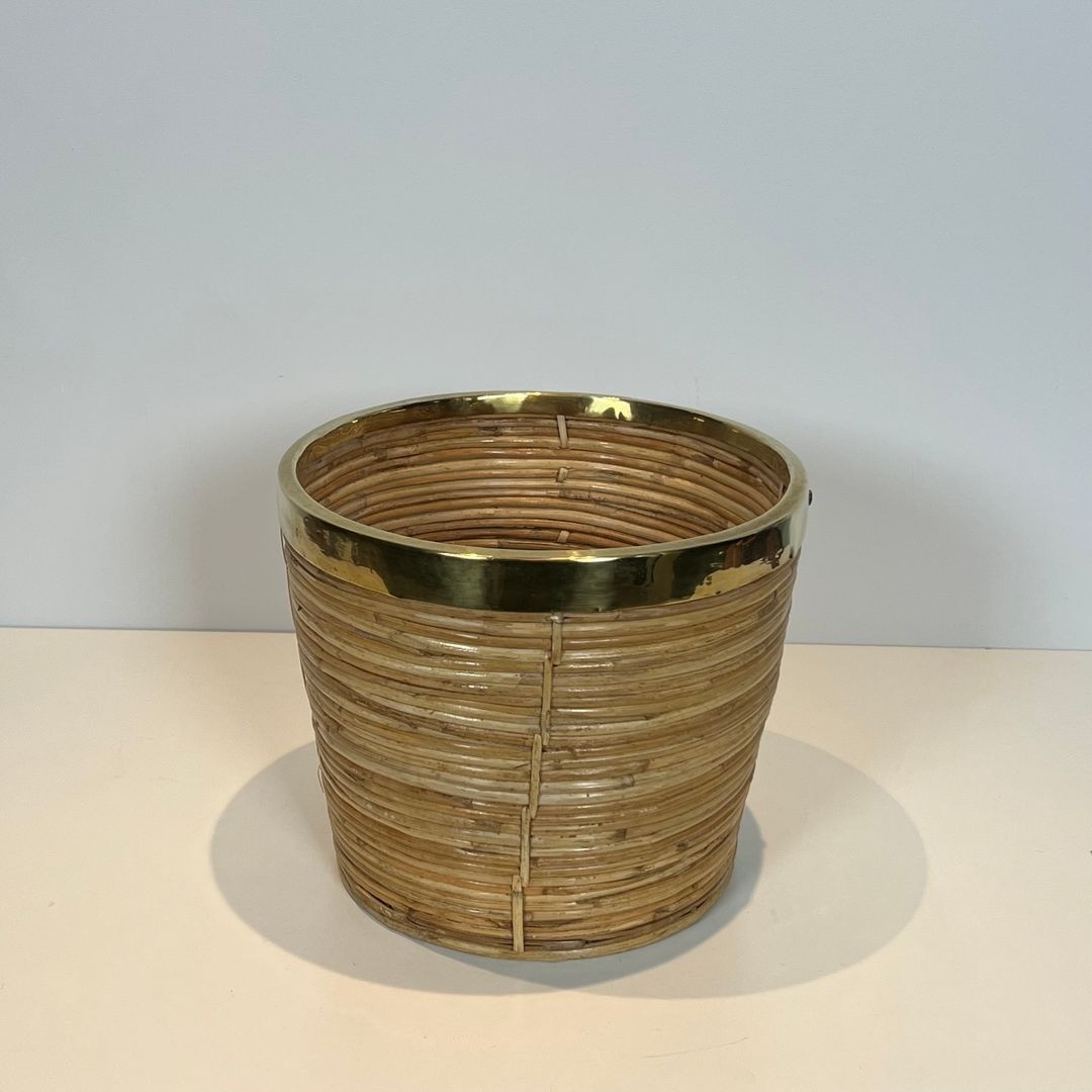 Rattan and brass wastebasket in the style of Gabriela Crespi. Italian work. Circa 1970