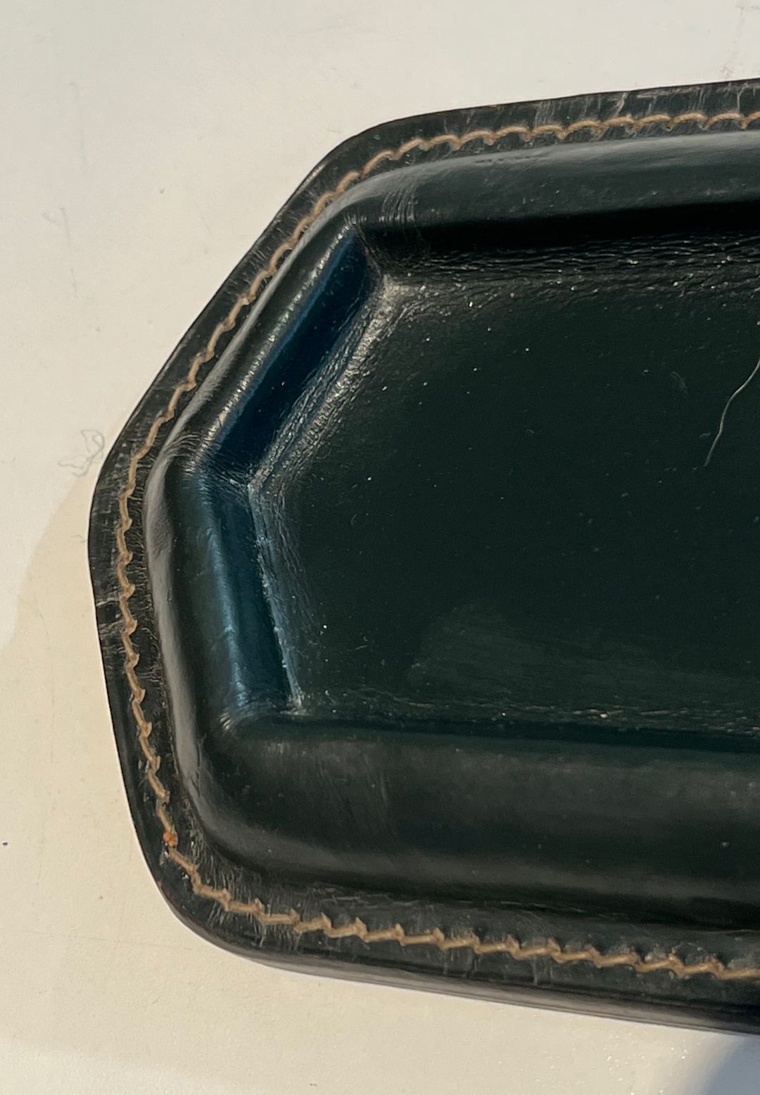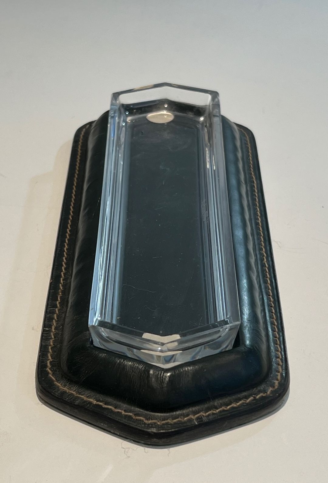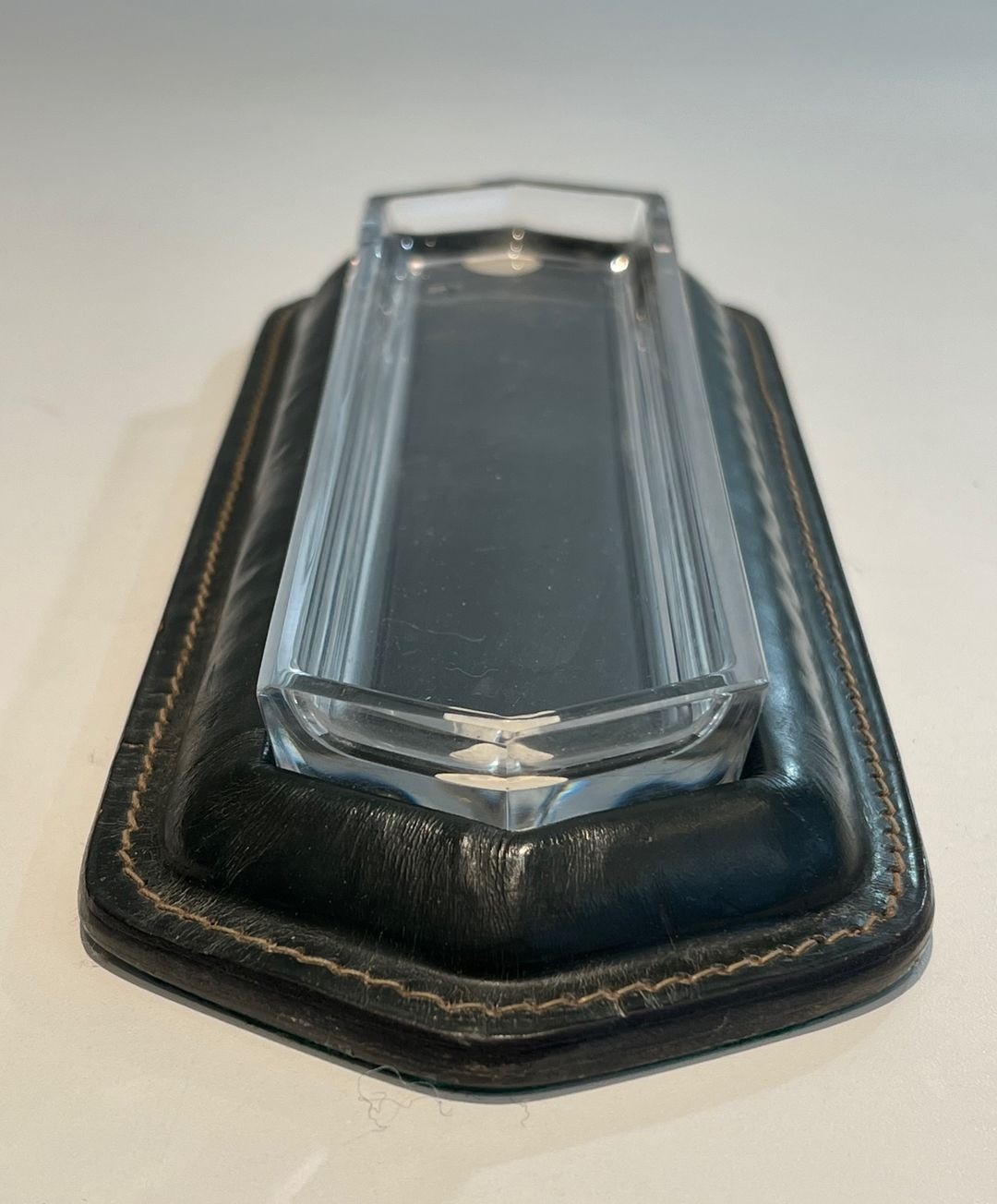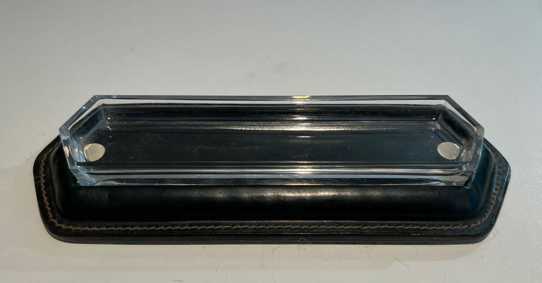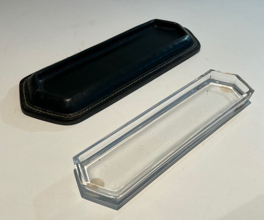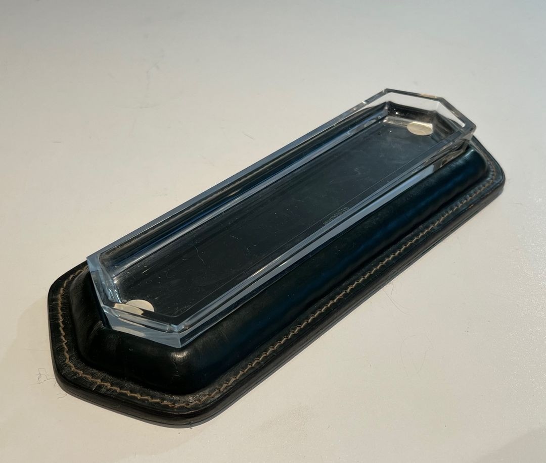 This refined pen tray is a characteristic piece from a desk set conceived in the manner of Jacques Adnet — one of the most admired and emulated designers in the French decorative arts of the mid-20th century. A shallow rectangular form, it presents a dark green leather surround worked with the fine cream saddle-stitching of the sellier tradition along its outer edges, while the centre is occupied by a faceted glass insert that provides a cool, lustrous surface on which pens, pencils, or other writing instruments can rest. The overall effect is one of sober, disciplined luxury — the hallmark of Adnet’s design philosophy.